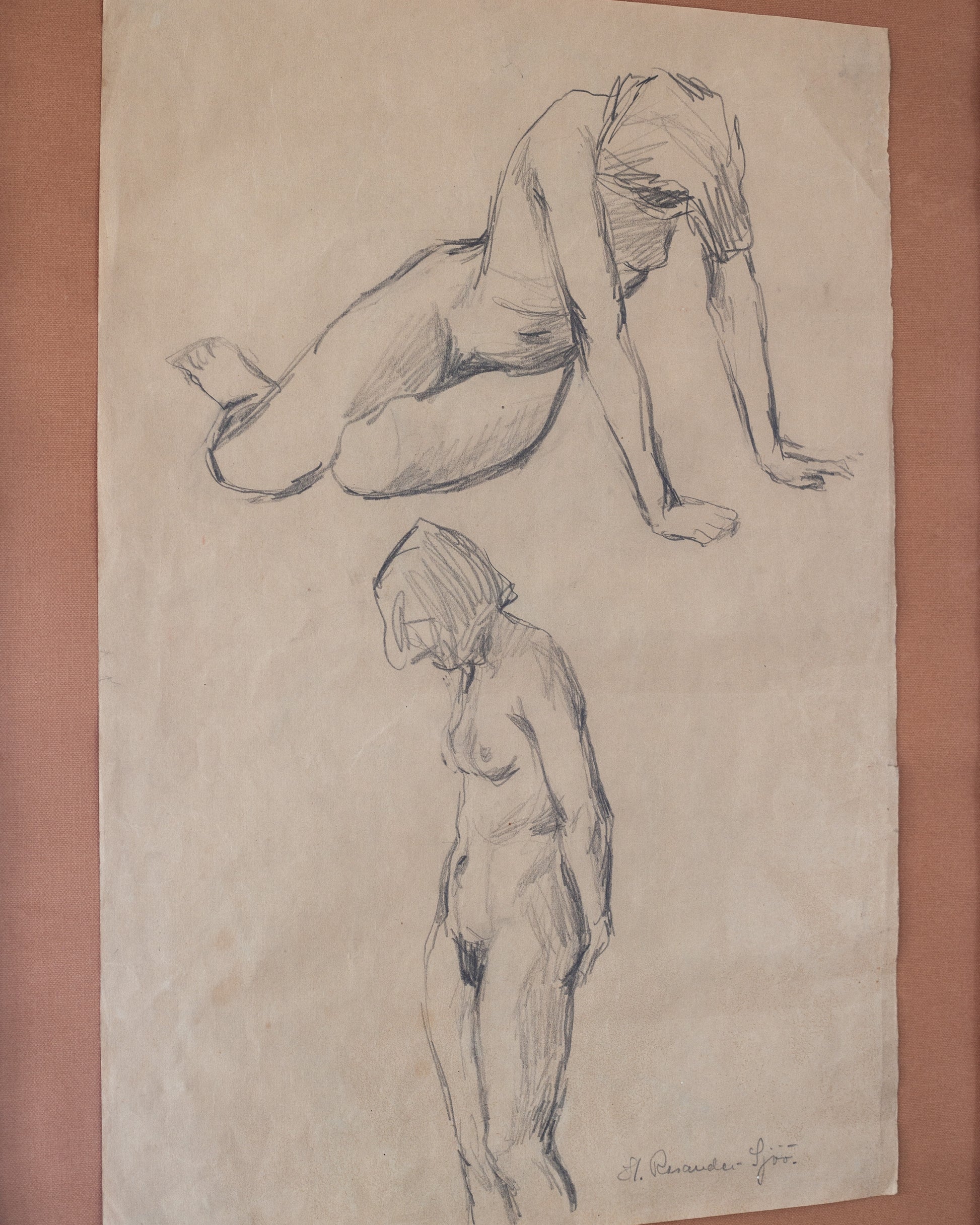 A framed sketch by Swedish artist Harriet Rosander de Tourtchaninoff (1912–1965), previously known as Harriet Sjöö. Created in the 1940s, this artwork is a study of the female form, emphasizing expressive gestures and natural curvature over fine detail to capture the body’s fluid lines and graceful posture.