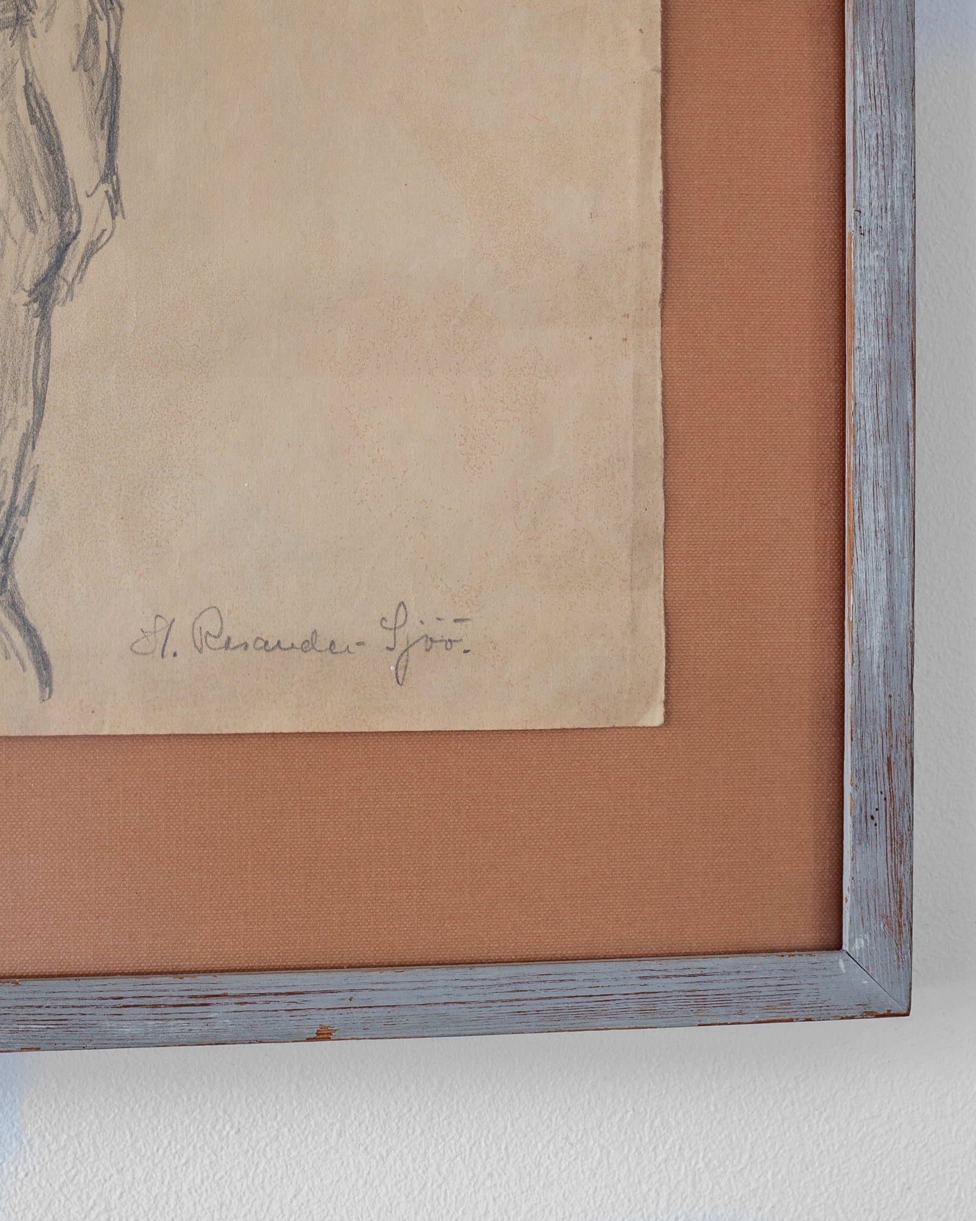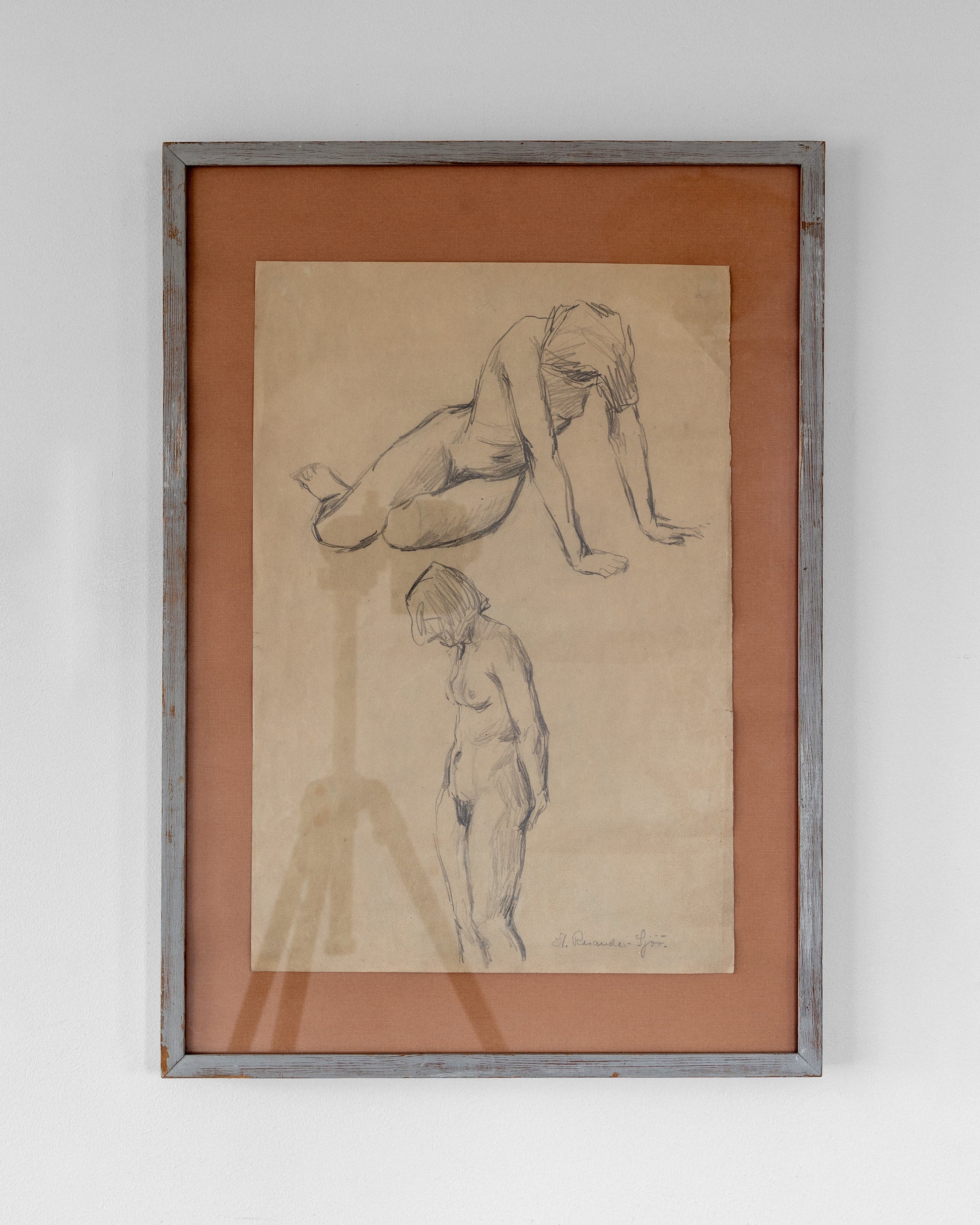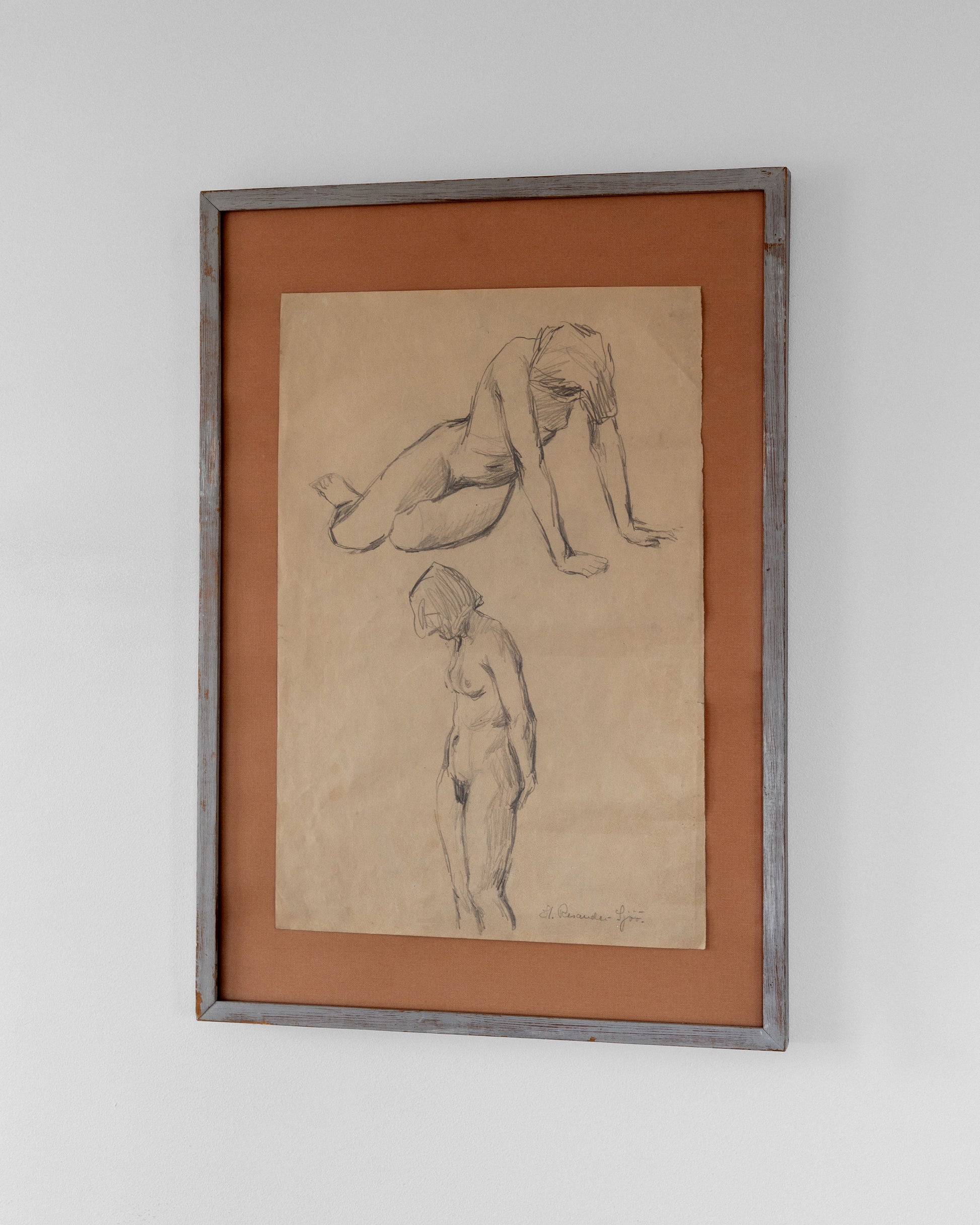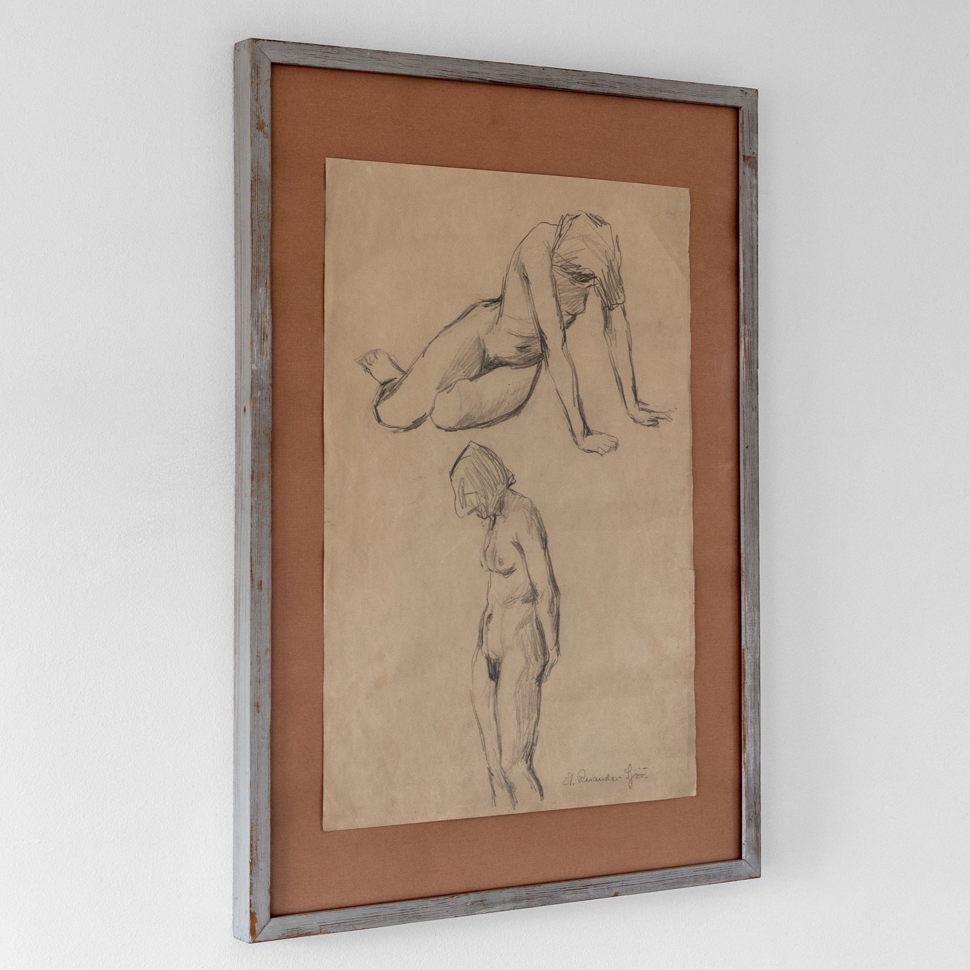 The drawing is mounted on a warm-toned textile backing, which enhances the beige, aged paper and adds depth to the composition. The rustic wooden frame, painted in a soft gray with a distressed finish, complements the sketch’s vintage character. The piece has a raw, authentic quality, highlighting the artist’s direct approach and the timeless quality of figure studies in classical art.