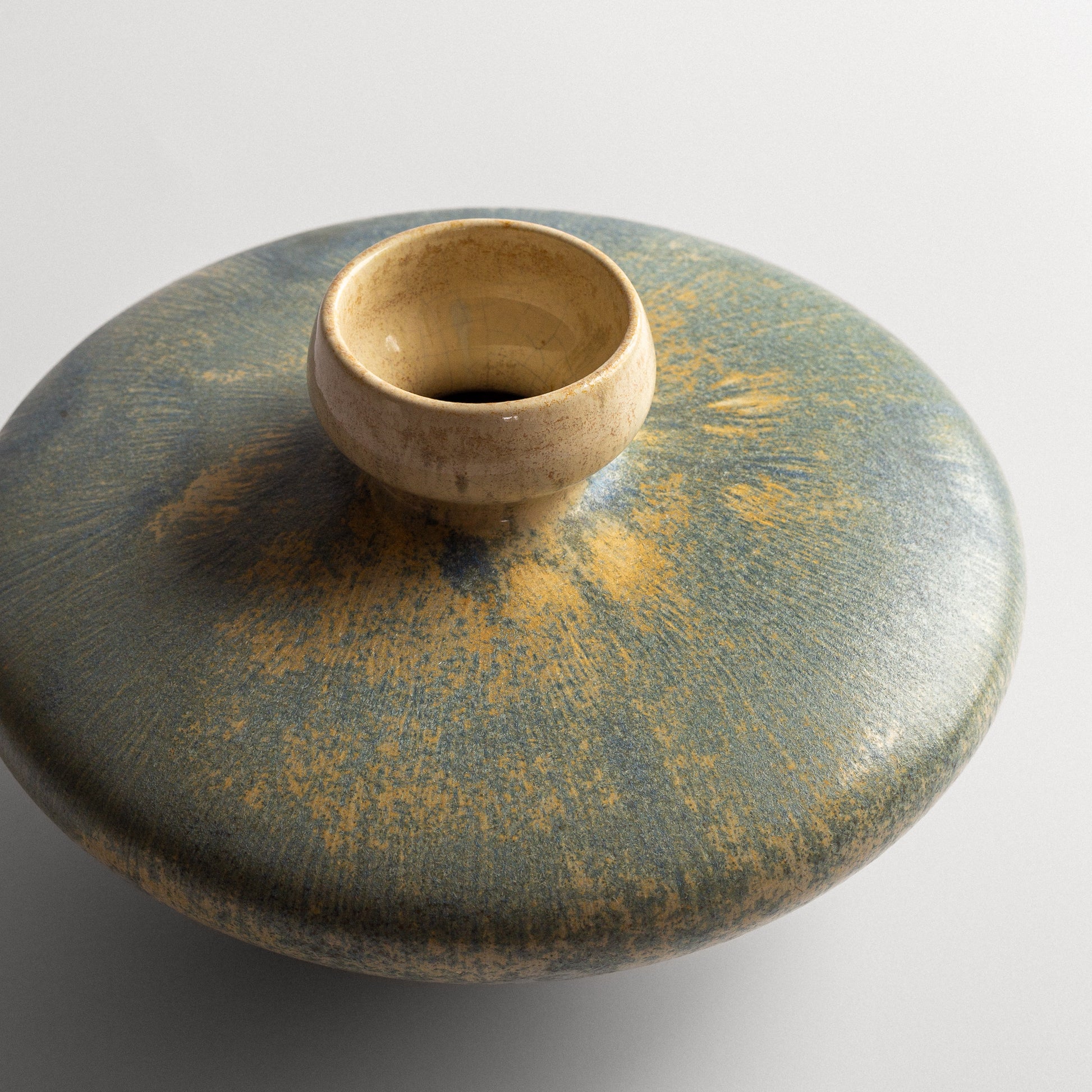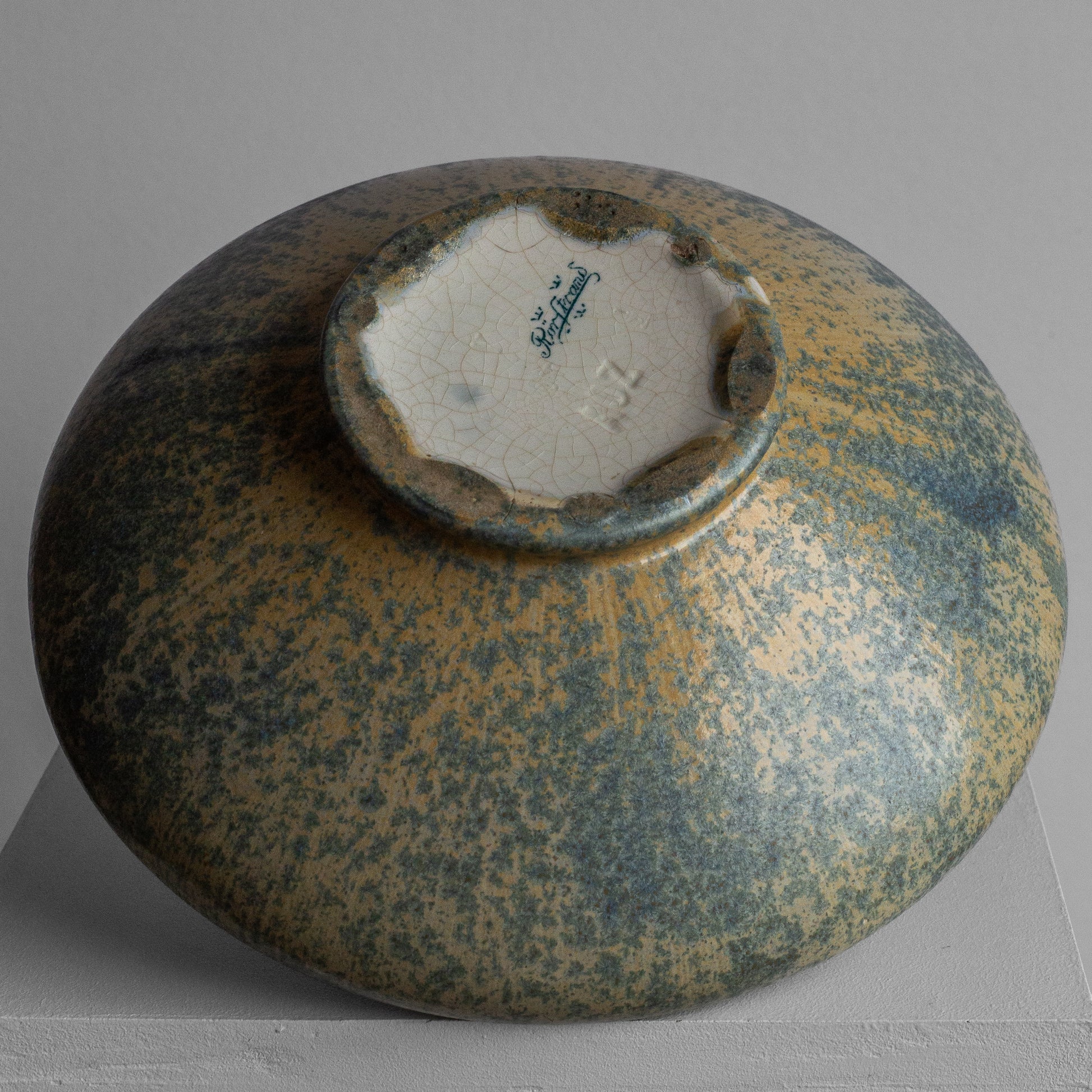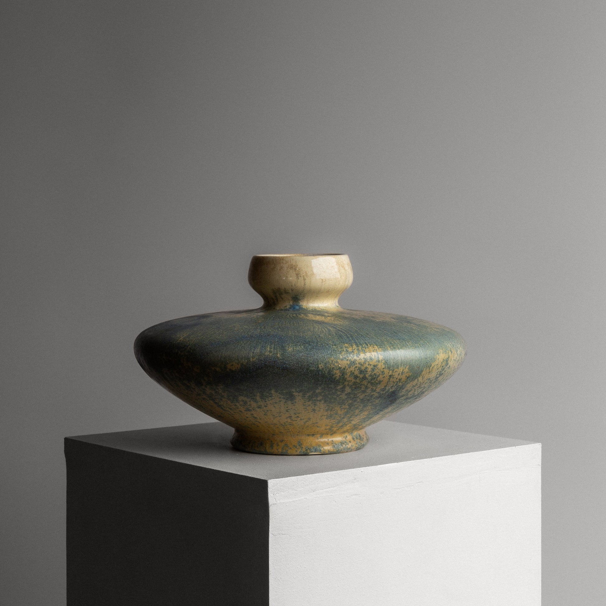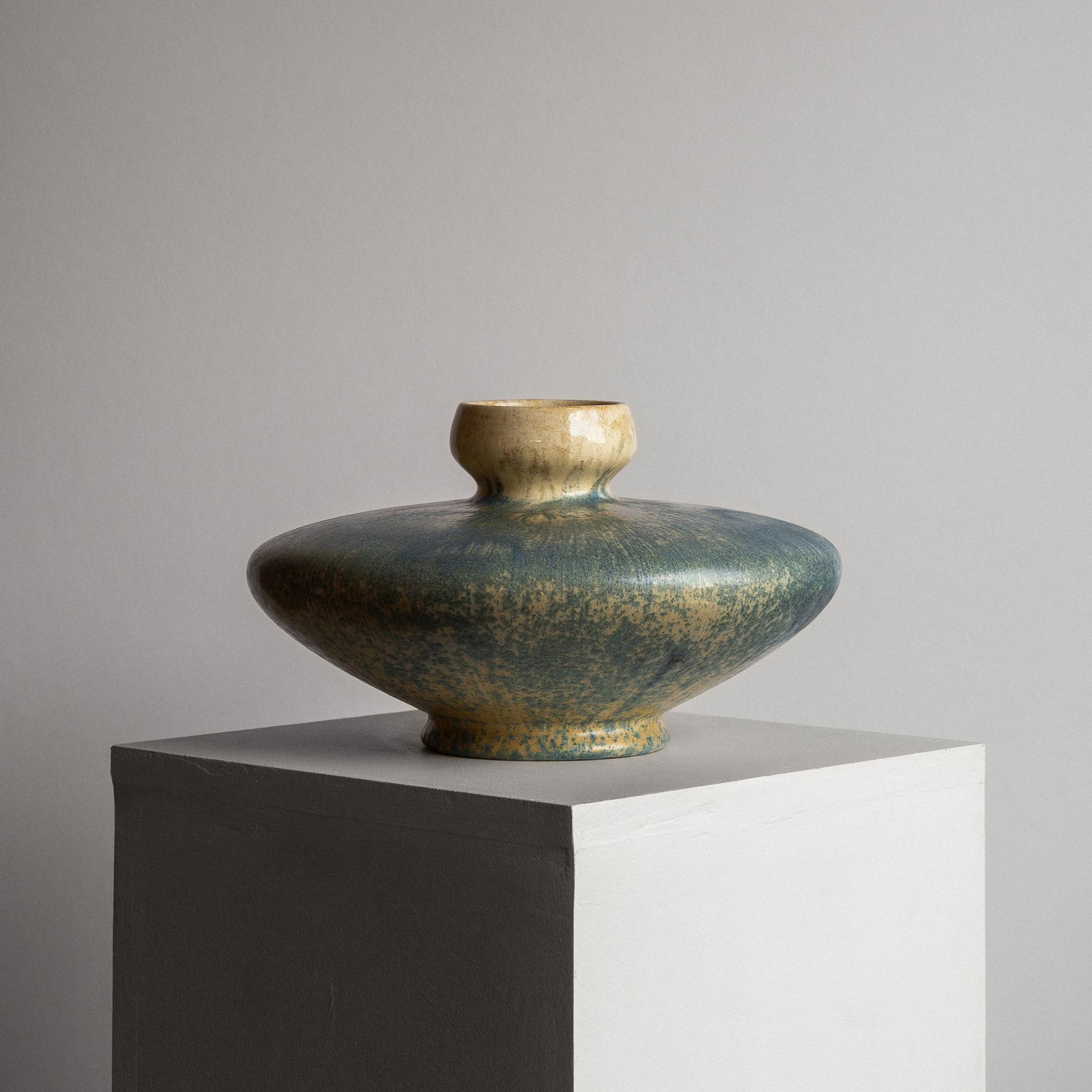 Exceptionally rare and beautifully formed vase by Alf Wallander for Rörstrand. Made out of stoneware with wonderful crystalline glaze in light blue and beige tones.
