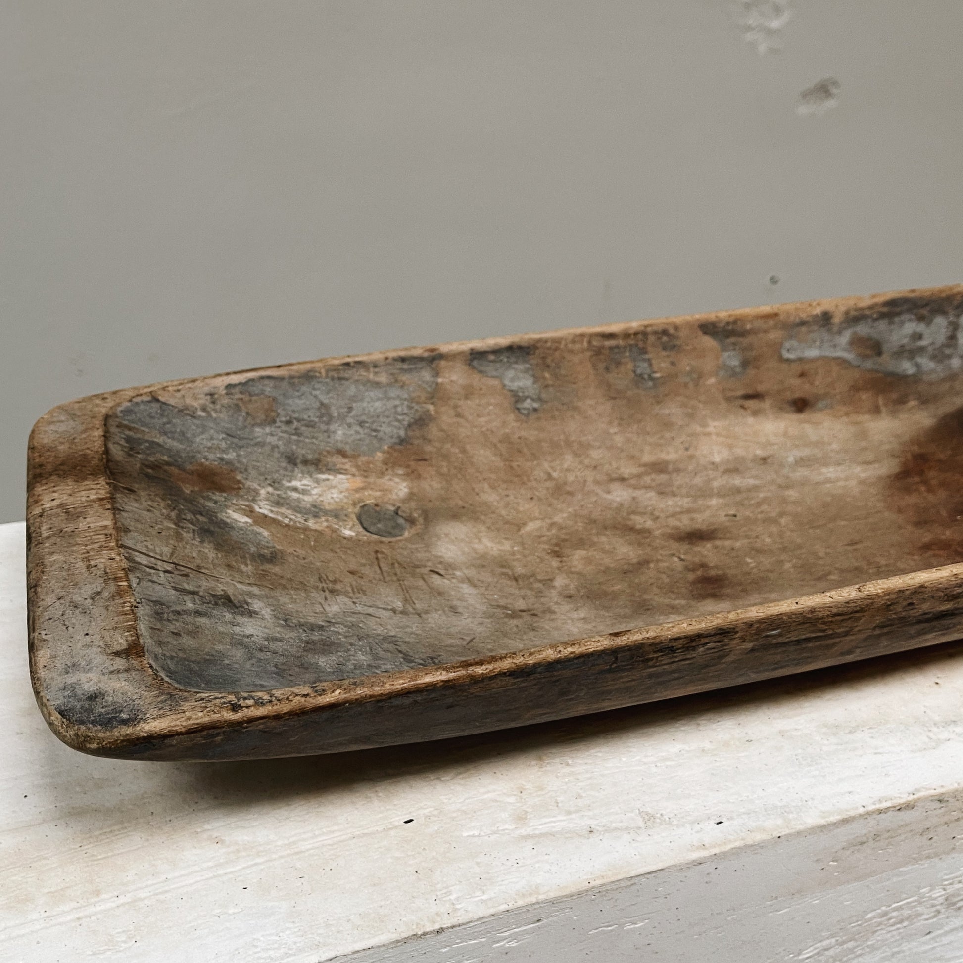 A long antique wooden trough from the 19th century, Sweden. Hand carved, unique and authentic with the makers mark. This piece boasts many signs of old age.