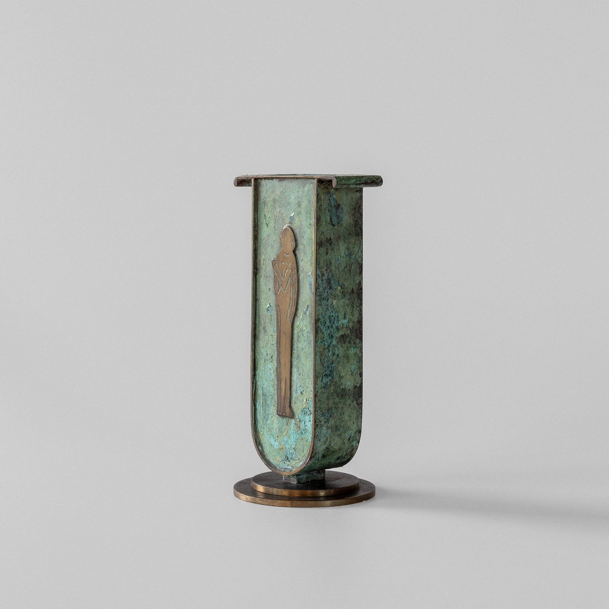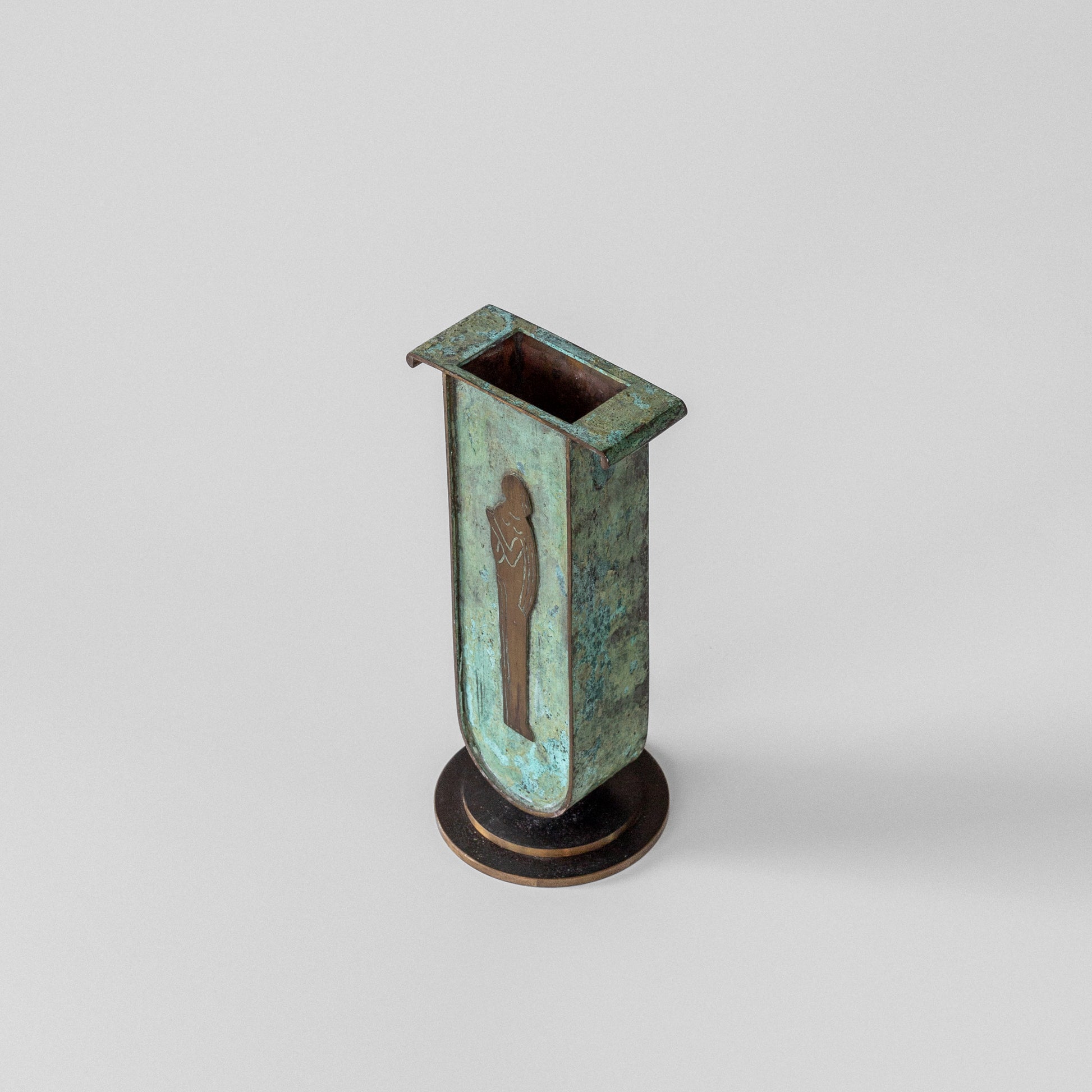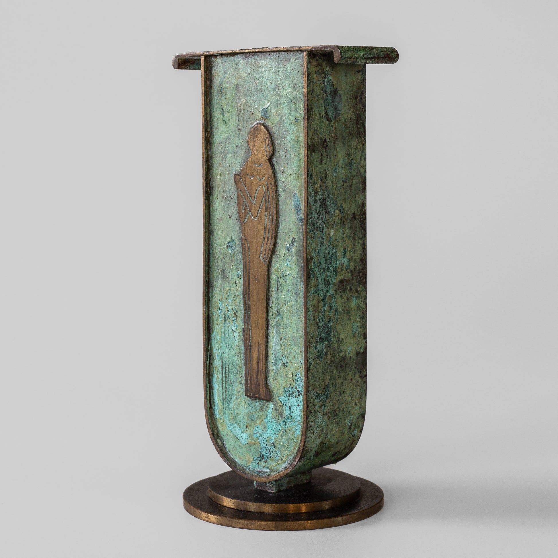 A rare Art Deco metal vessel from the 1920s-30s, crafted in brass with a striking verdigris patina. Its neoclassical U-shape is accented by a whimsical golden figure set against the weathered surface, creating a captivating contrast. Mounted on a solid circular brass base, the piece has a pleasing weight and presence.