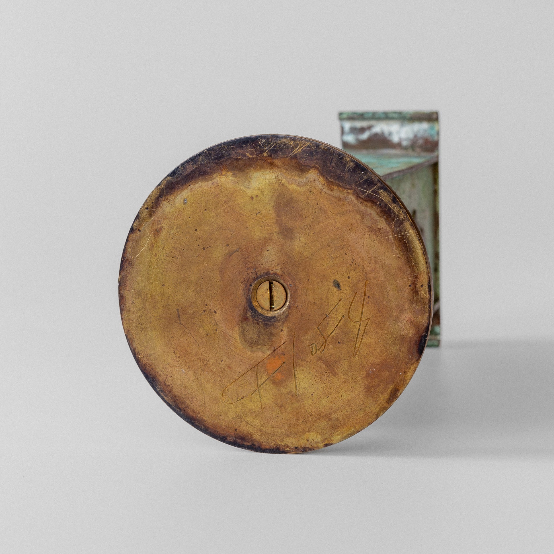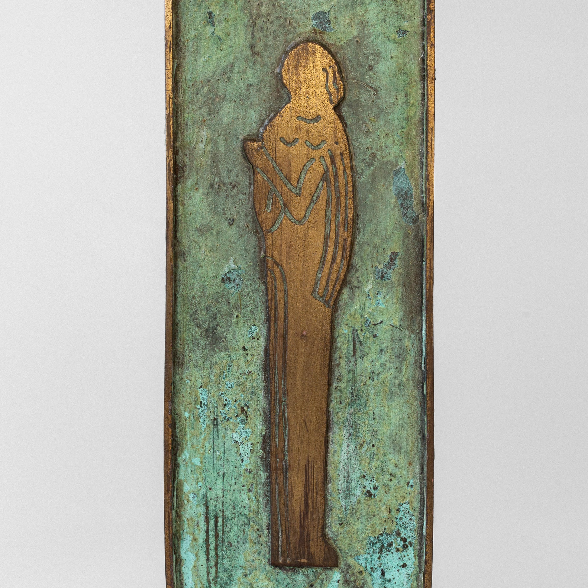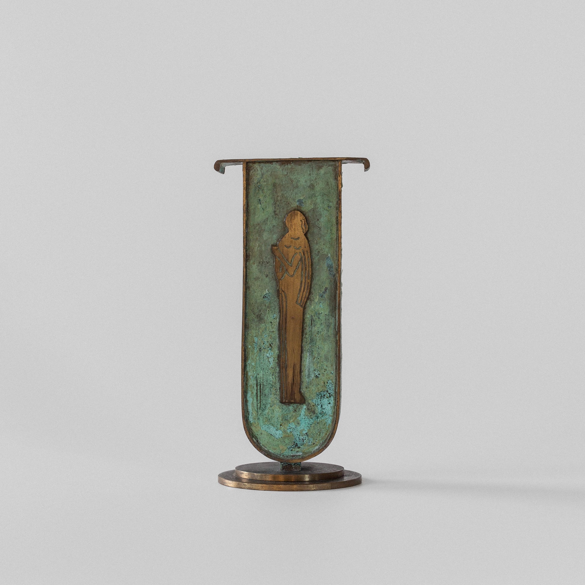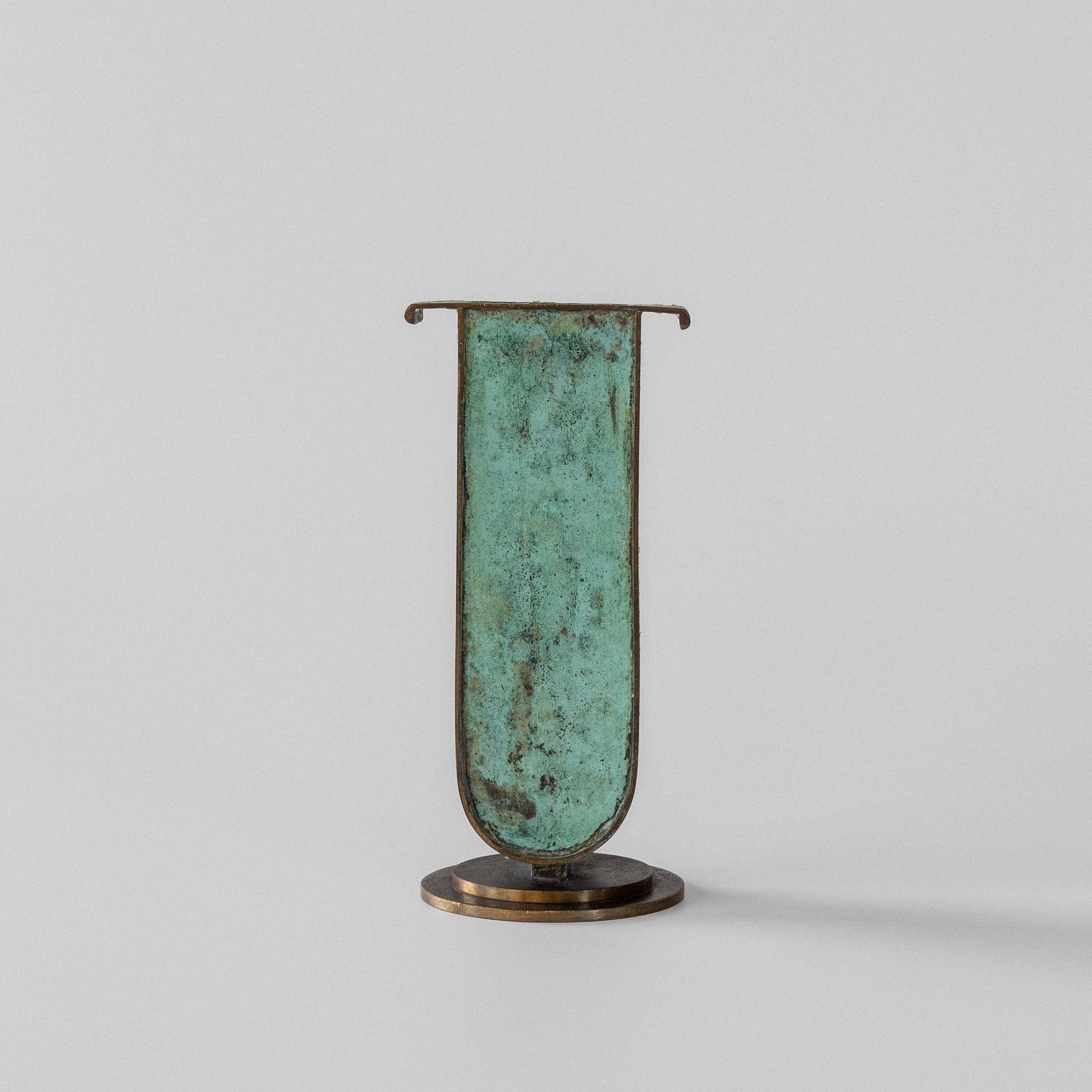 A rare Art Deco metal vessel from the 1920s-30s, crafted in brass with a striking verdigris patina. Its neoclassical U-shape is accented by a whimsical golden figure set against the weathered surface, creating a captivating contrast. Mounted on a solid circular brass base, the piece has a pleasing weight and presence.