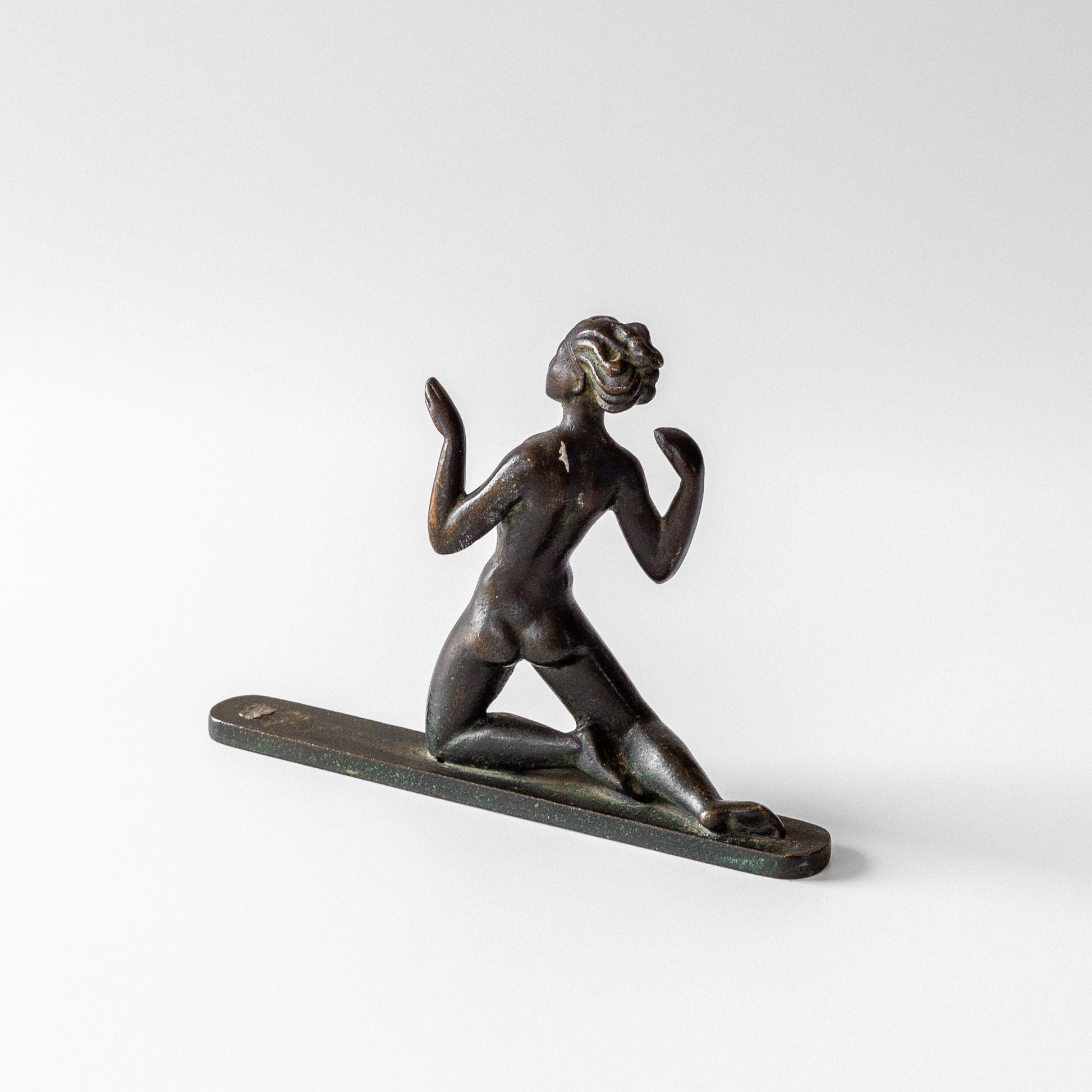 1930s bronze sculpture featuring a stylized female figure kneeling with raised arms, possibly suggesting a gesture of offering or prayer. The sculpture has a patinated finish, typical of Art Deco bronze works, giving it a dark, slightly aged appearance.