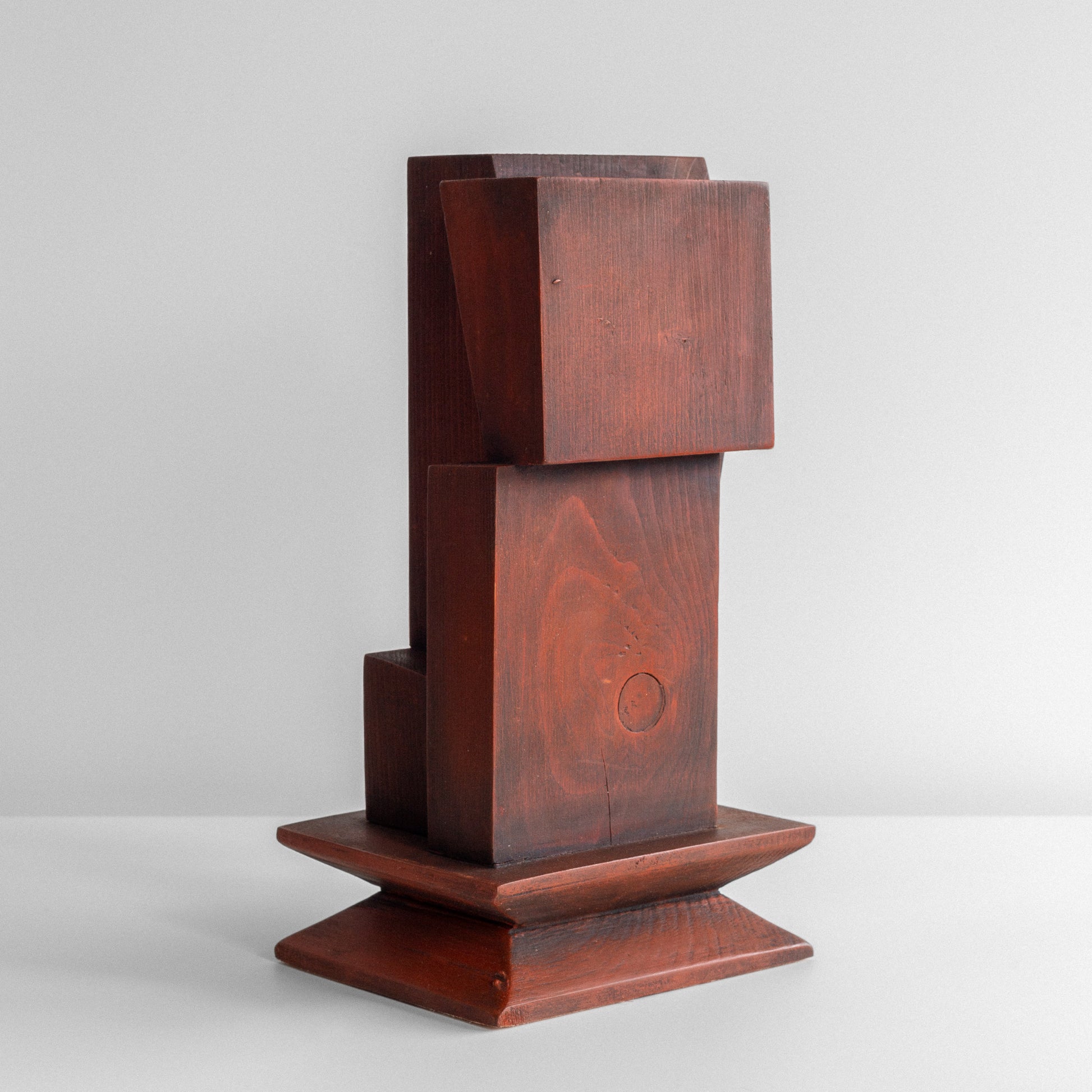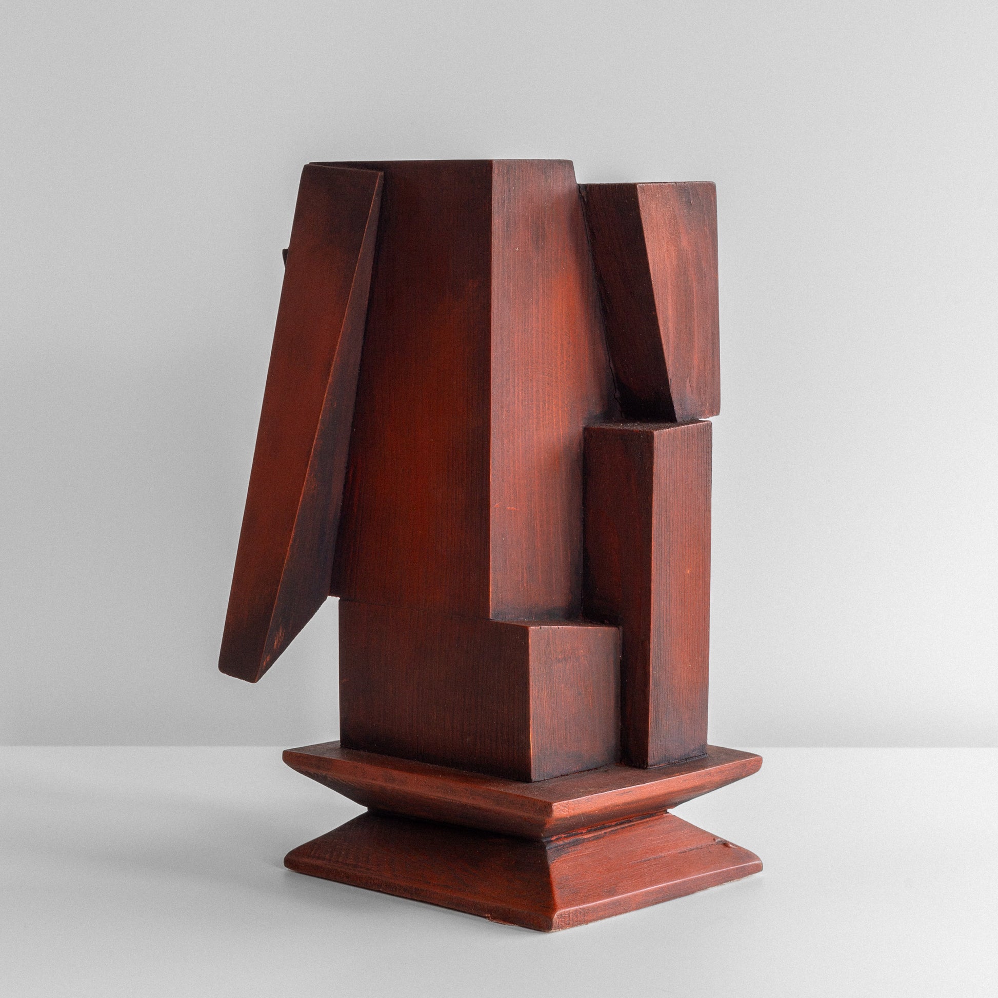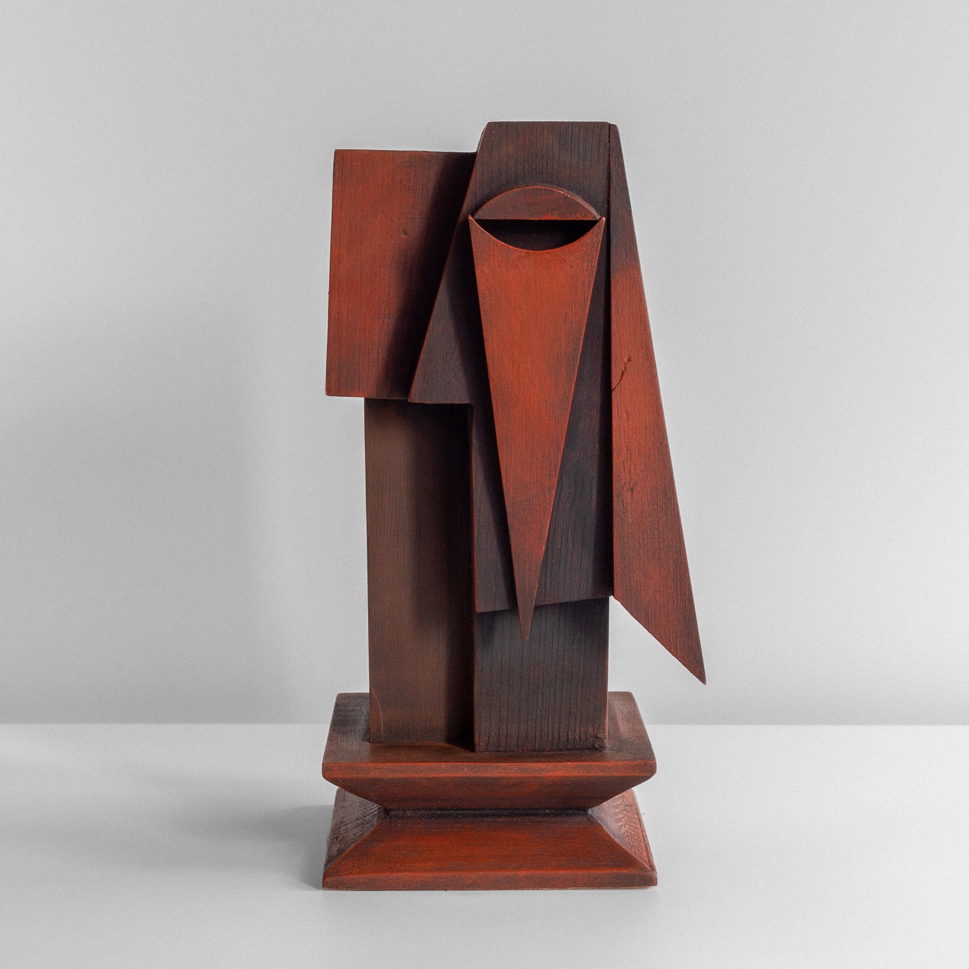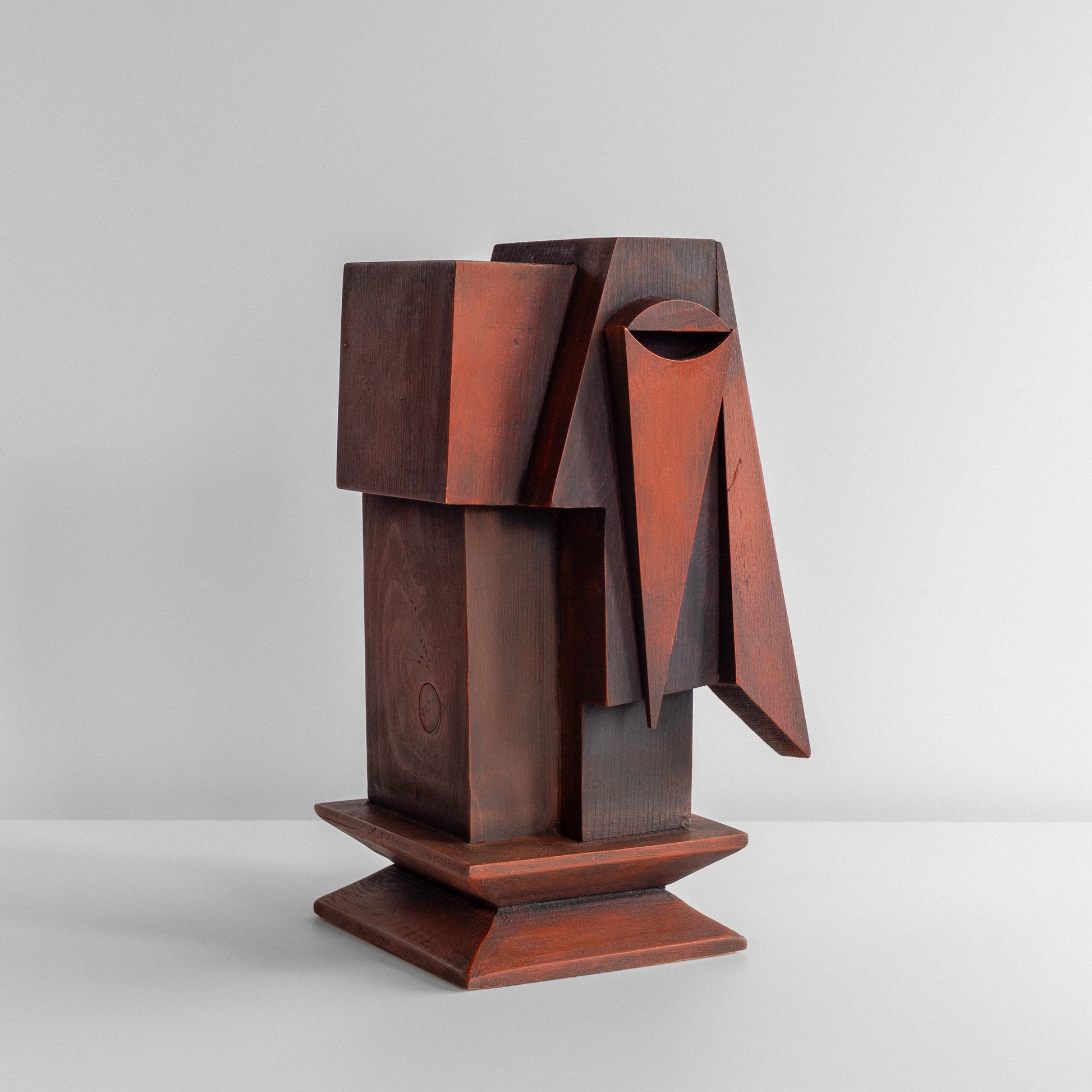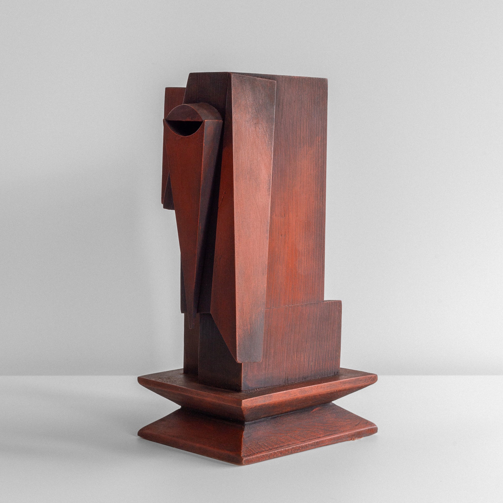 The sculpture features a stylized head and face carved from solid wood that has been stained and painted. It's characterized by its sharp and angular lines which create a geometric and abstract aesthetic, embodying the principles of cubism. A real eye-catcher, the sculpture is captivating from all angles.