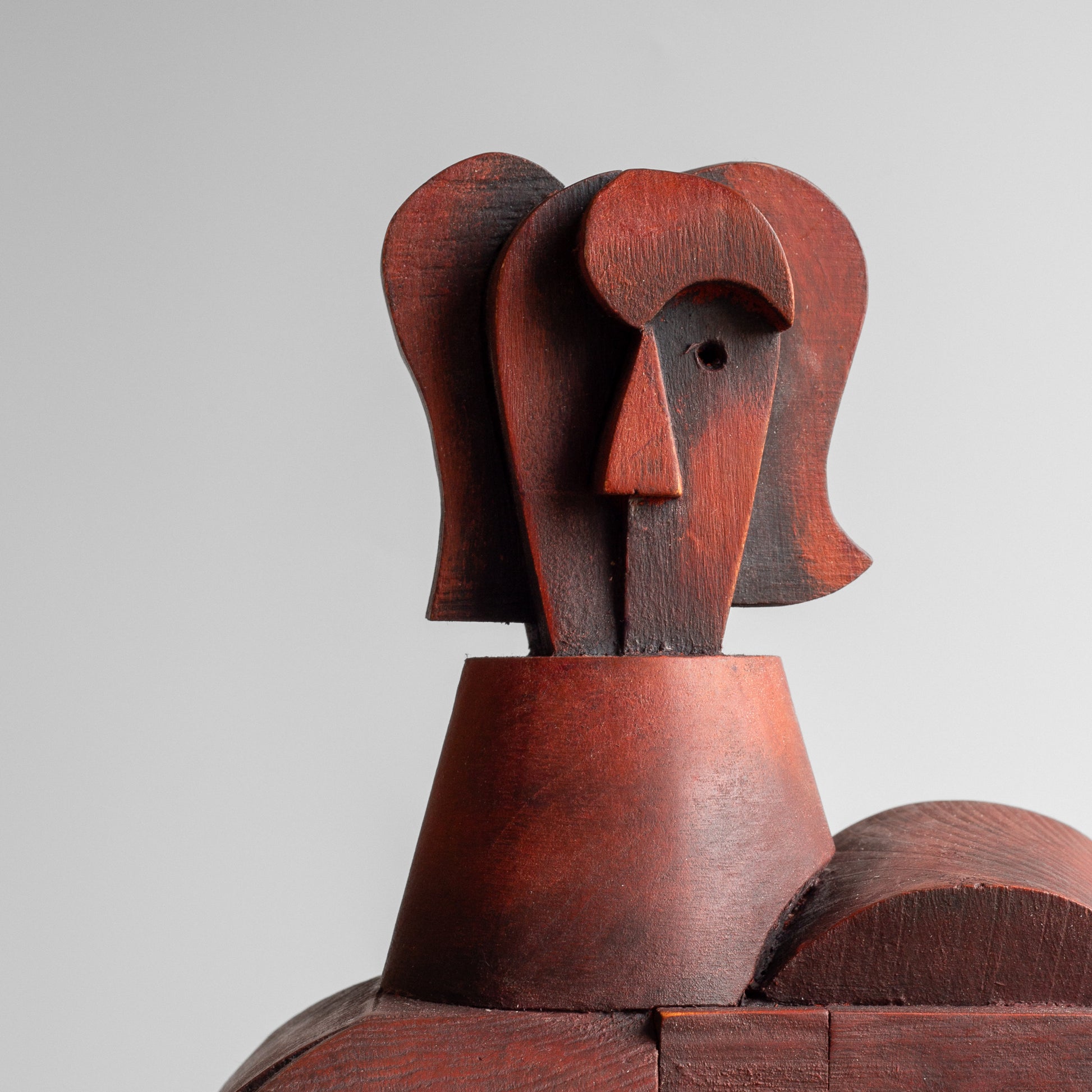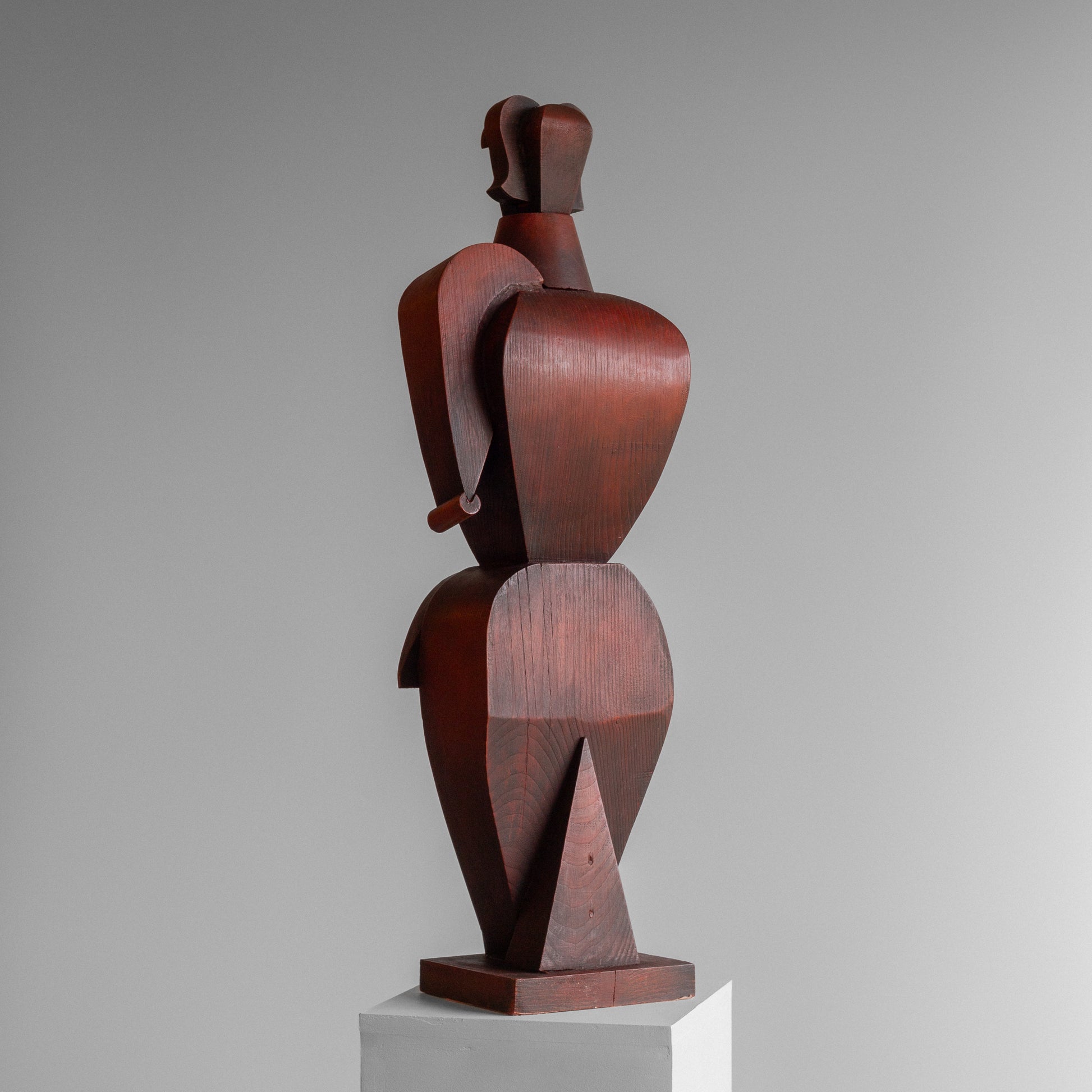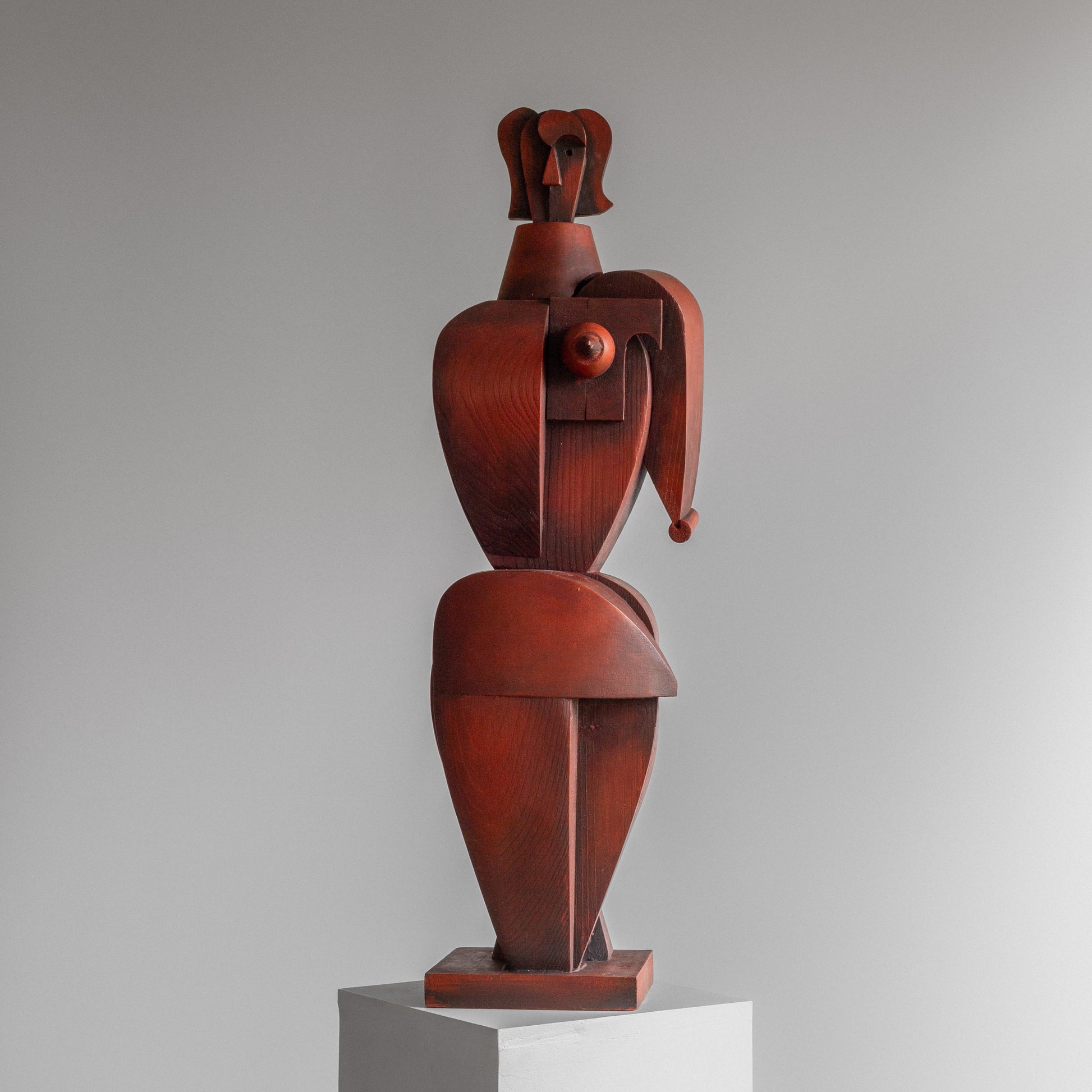 The sculpture features a stylized female figure carved from solid wood that has been stained and painted. It's characterized by its sharp and angular lines which create a geometric and abstract aesthetic, embodying the principles of cubism. A real eye-catcher, the sculpture is  captivating from all angles.
