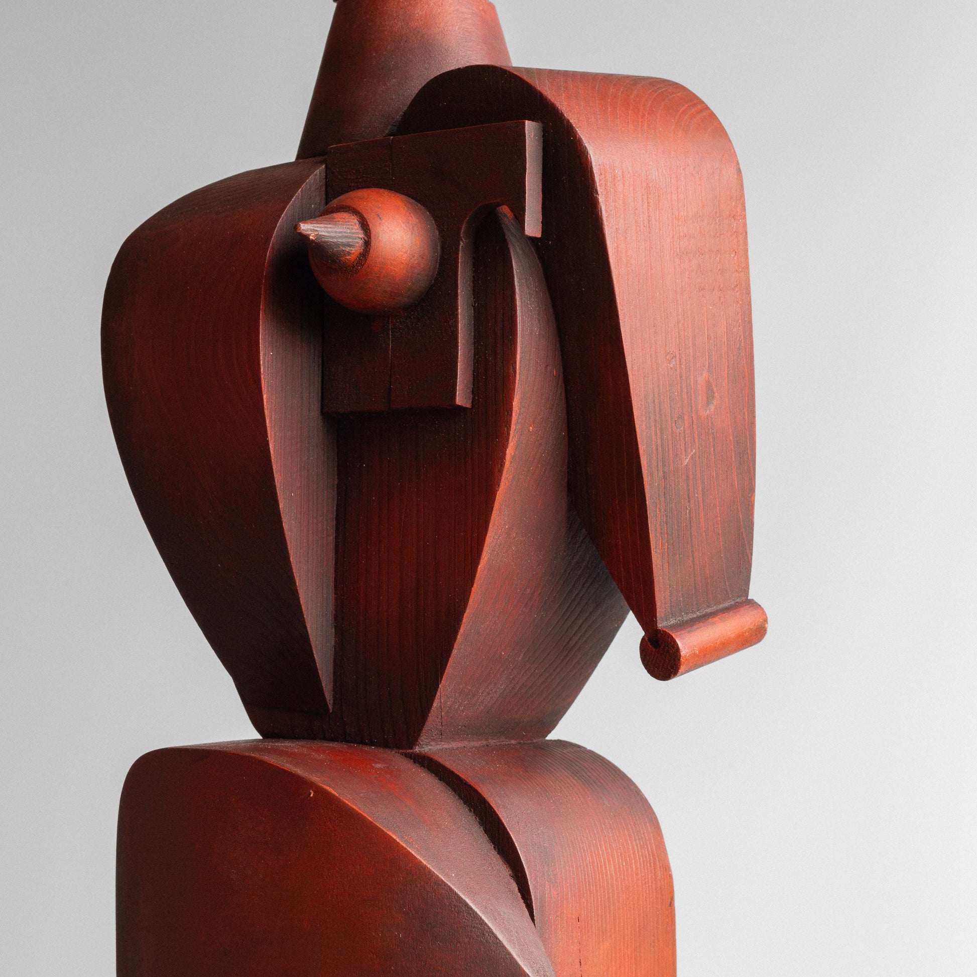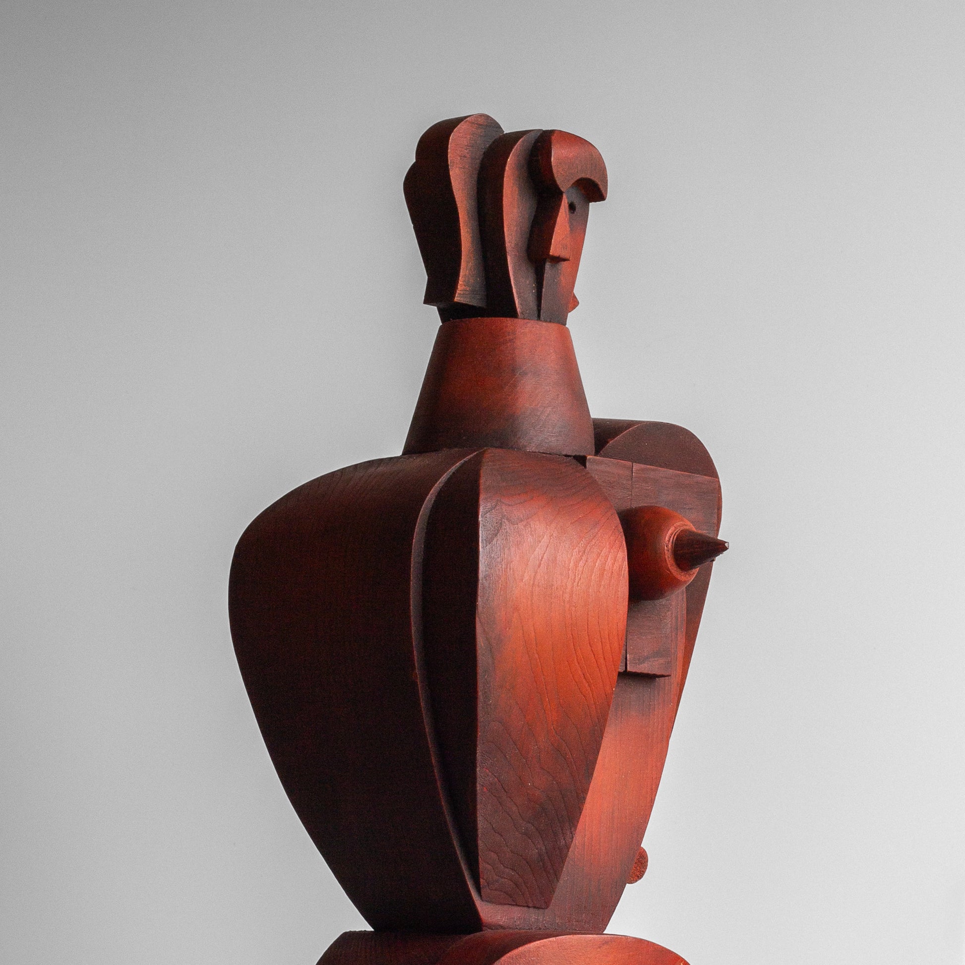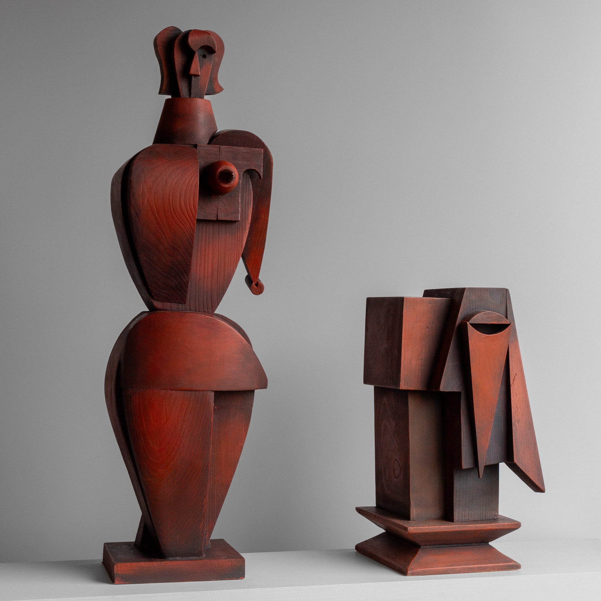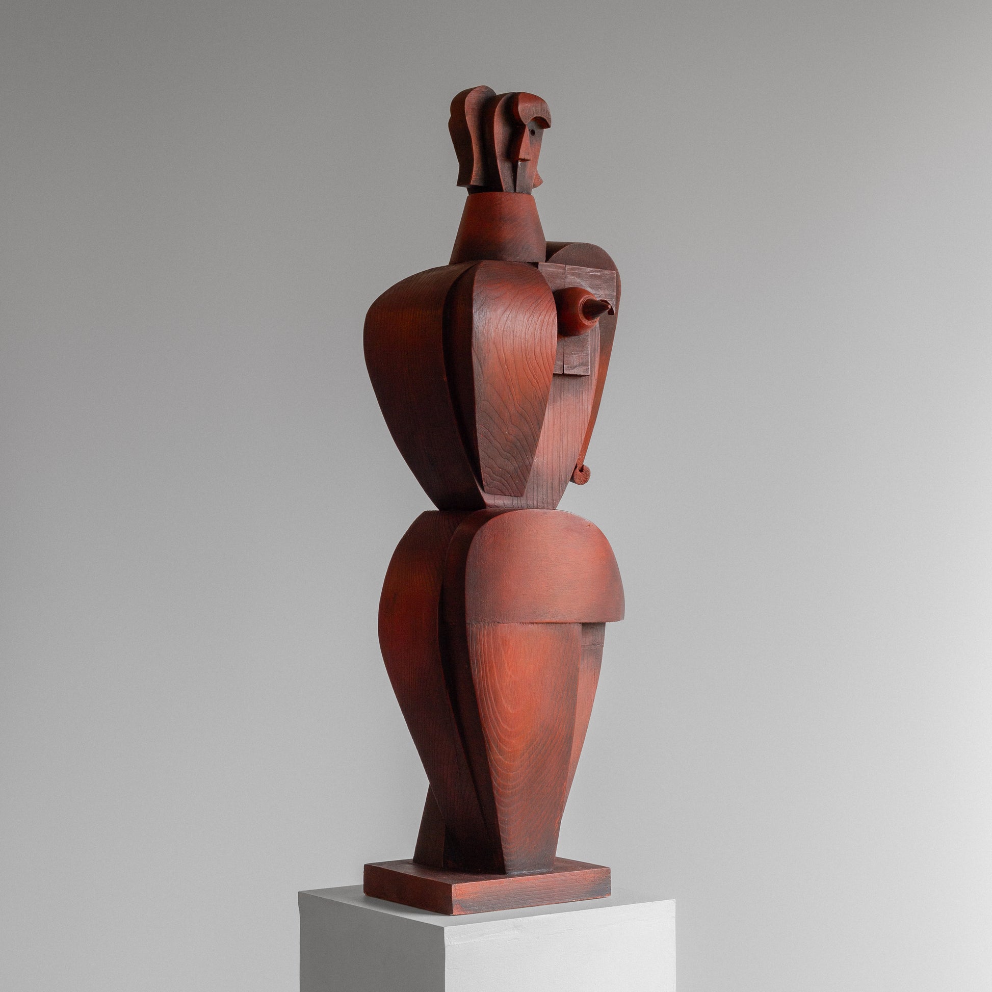 The sculpture features a stylized female figure carved from solid wood that has been stained and painted. It's characterized by its sharp and angular lines which create a geometric and abstract aesthetic, embodying the principles of cubism. A real eye-catcher, the sculpture is  captivating from all angles.