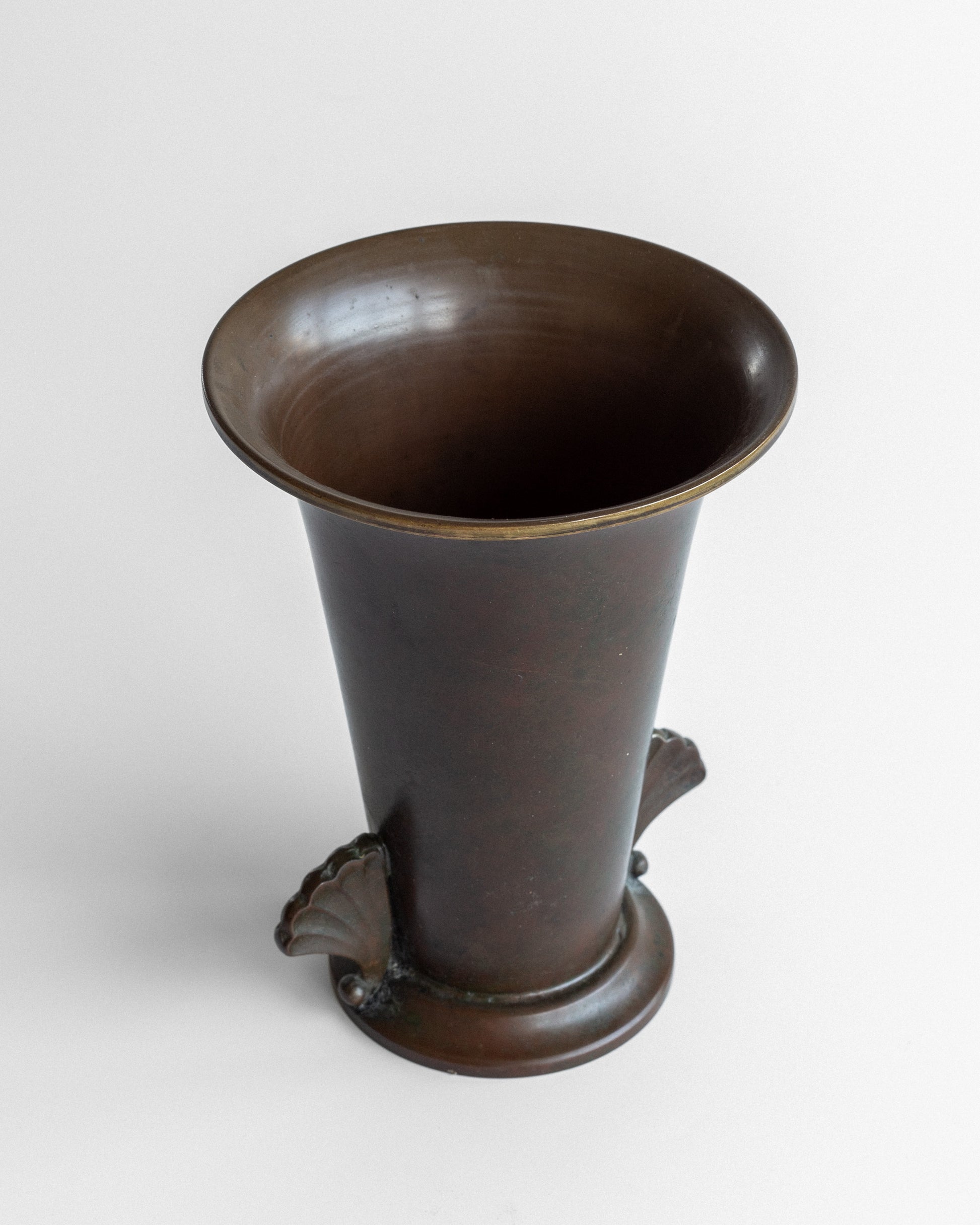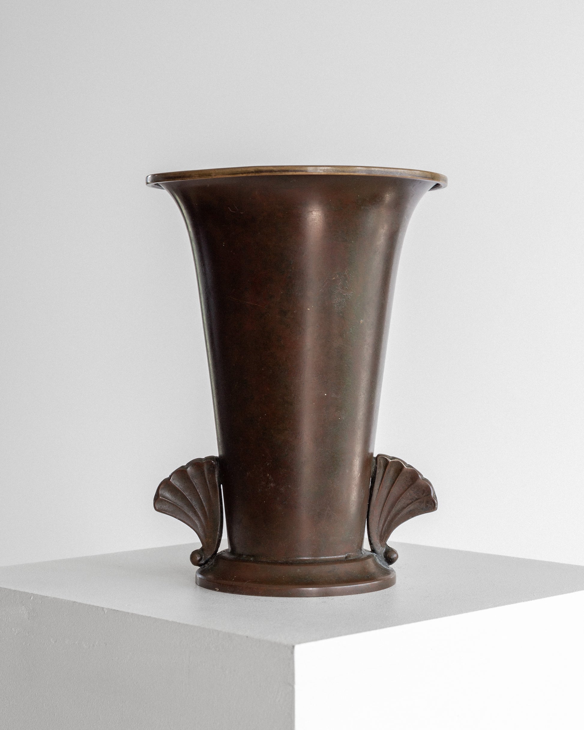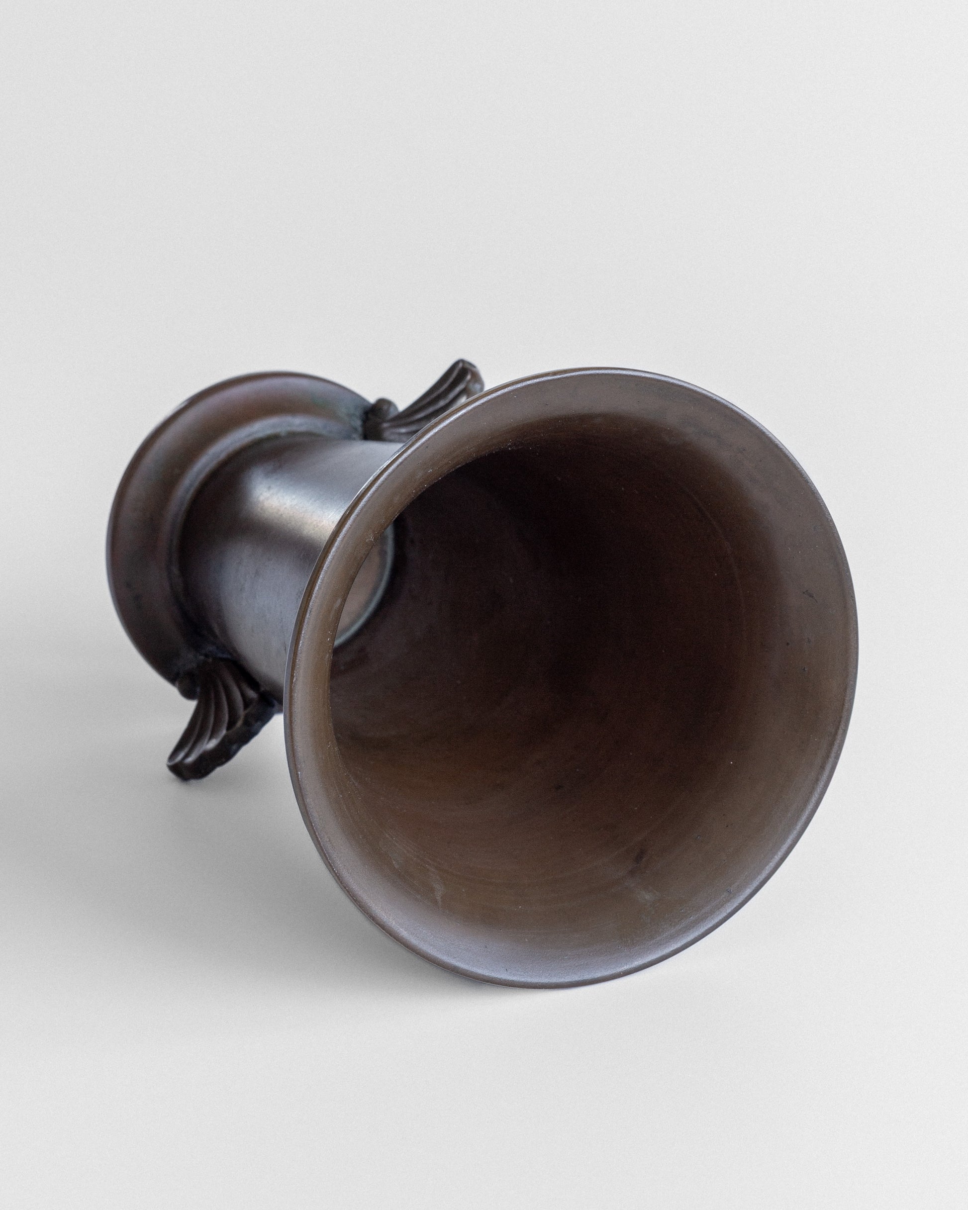 A captivating example of Danish Art Deco, this 1930s vase by Copenhagen designer Holger Fridericia is crafted in bronze-patinated metal. Its graceful trumpet form is adorned with handles featuring fluted, wing-like motifs, combining sleek geometric lines with classical inspiration.