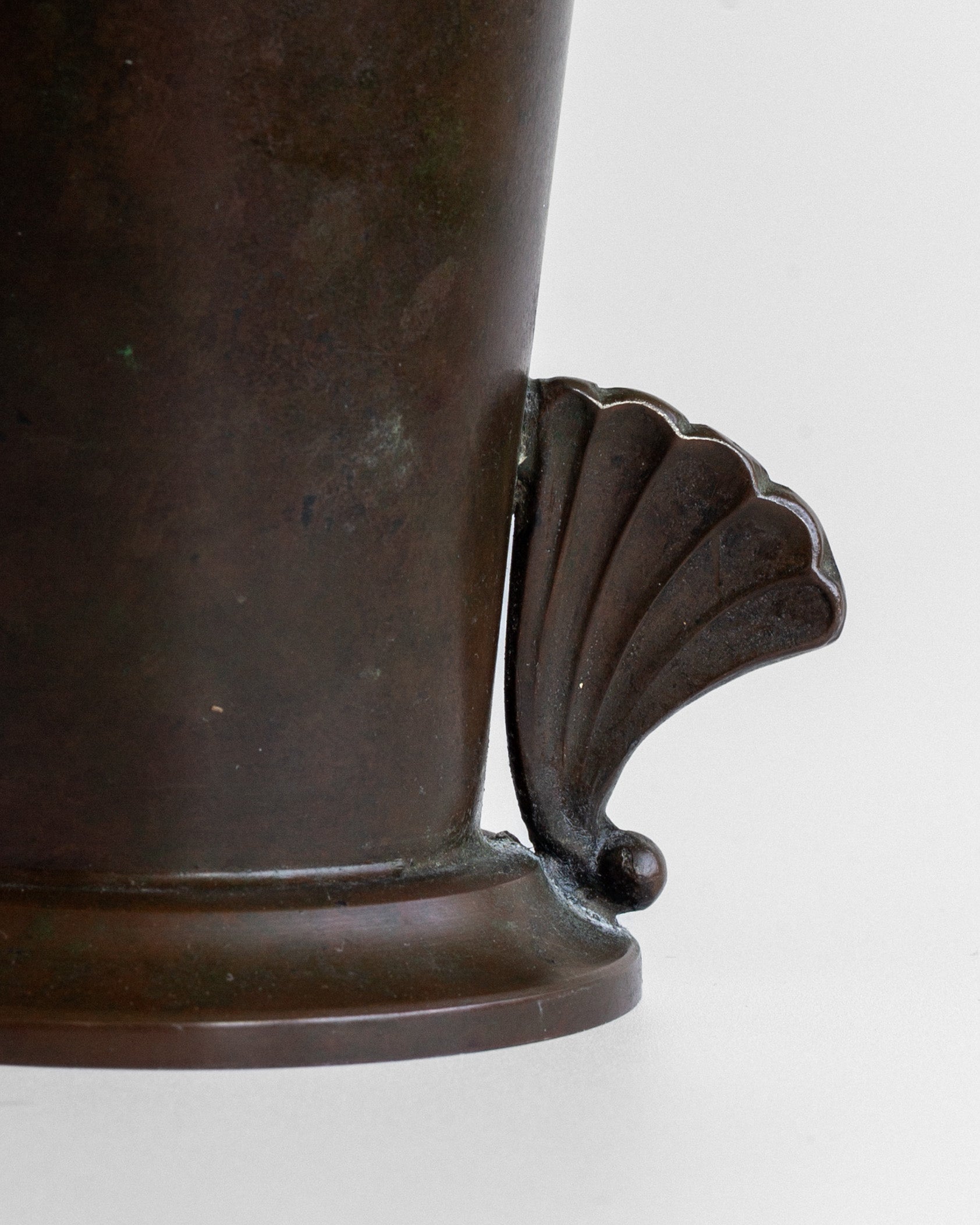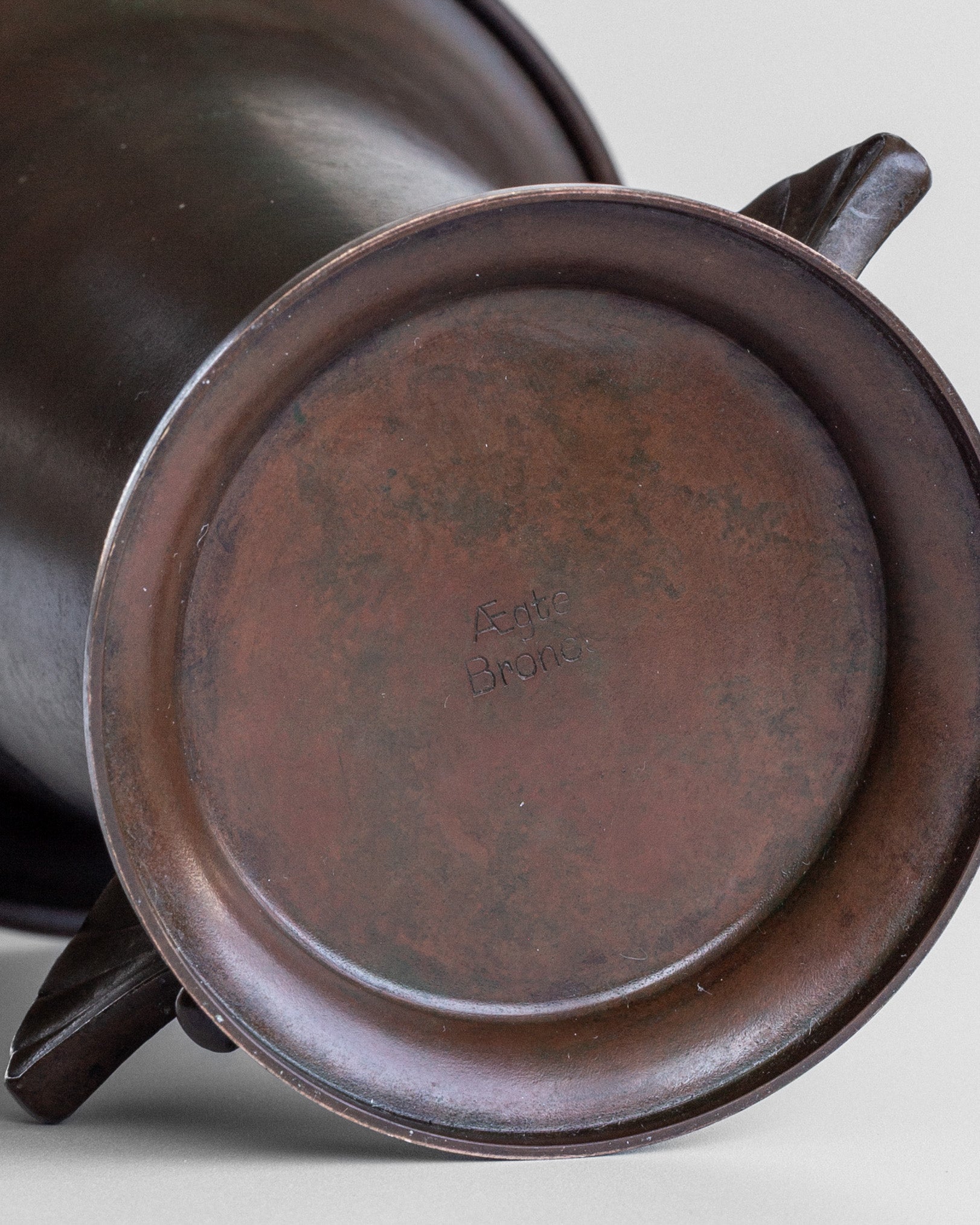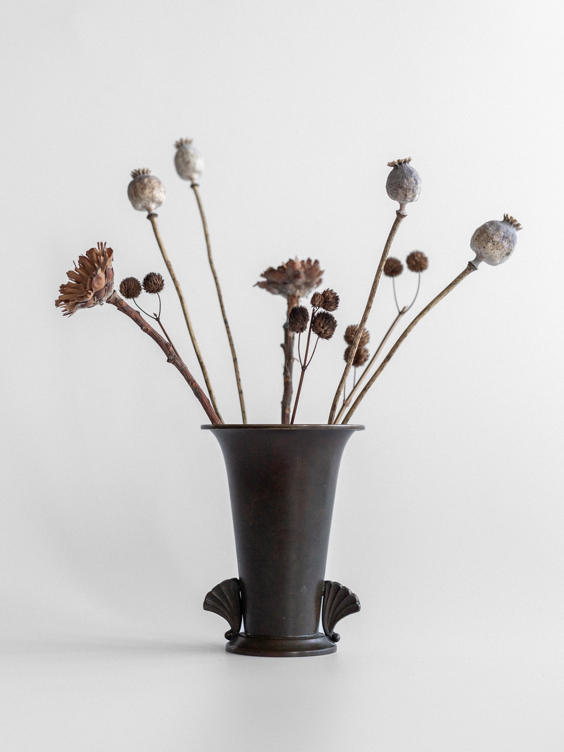 A captivating example of Danish Art Deco, this 1930s vase by Copenhagen designer Holger Fridericia is crafted in bronze-patinated metal. Its graceful trumpet form is adorned with handles featuring fluted, wing-like motifs, combining sleek geometric lines with classical inspiration.