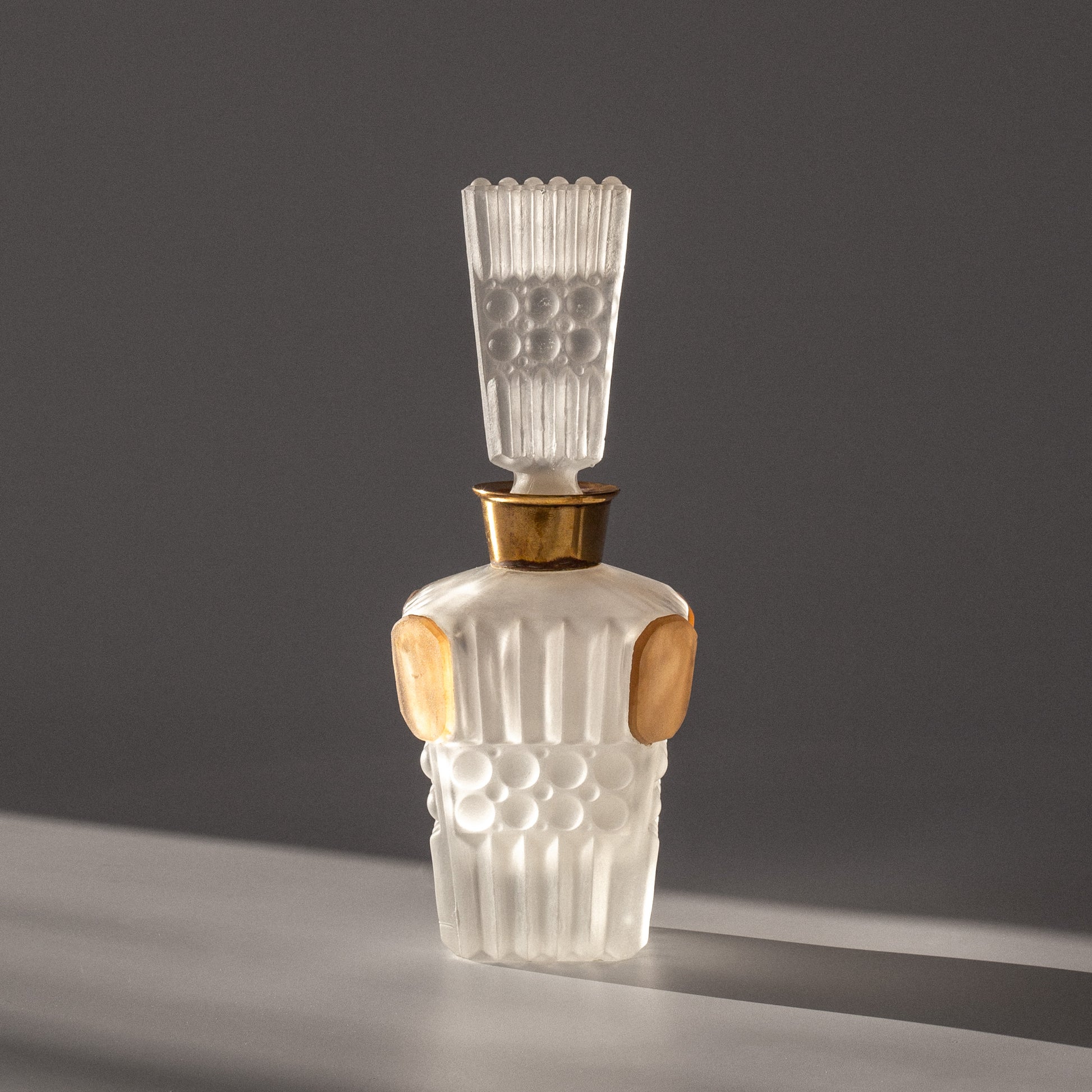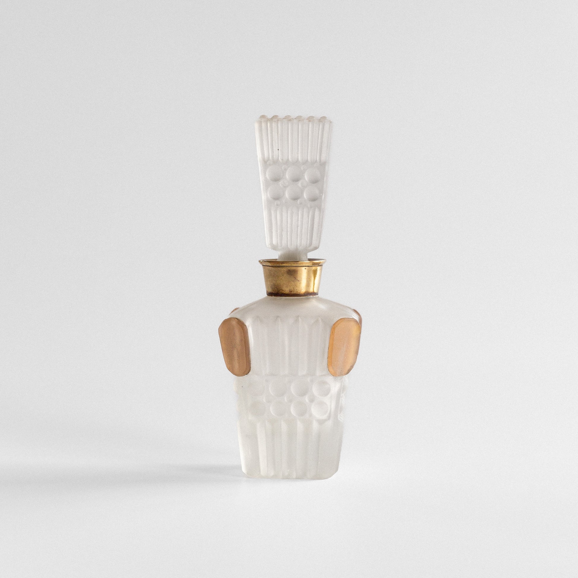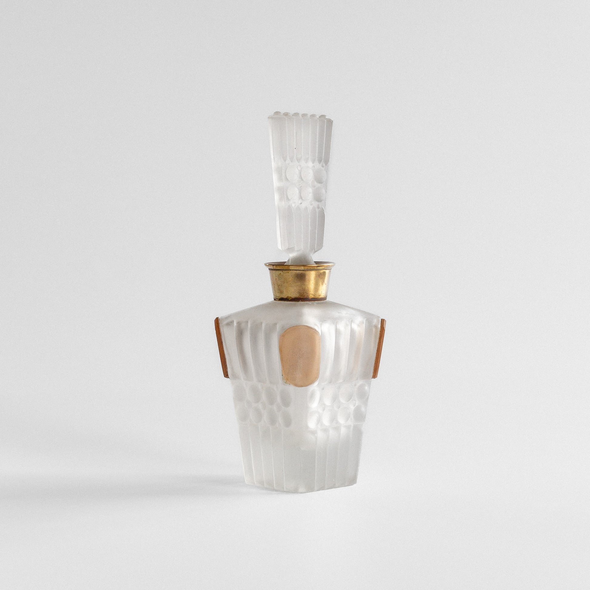 Elegant frosted glass perfume bottle with architectural geometric design. Features vertical ribbing, circular bubble pattern, and peach-colored oval medallions. Brass collar and matching stopper with fluted design.