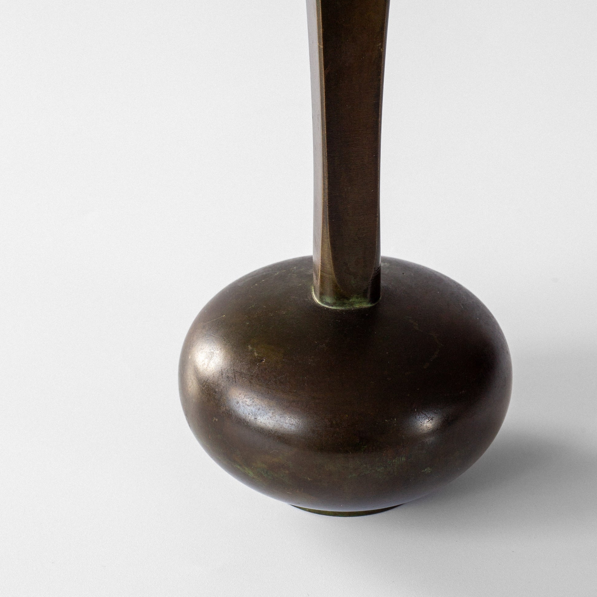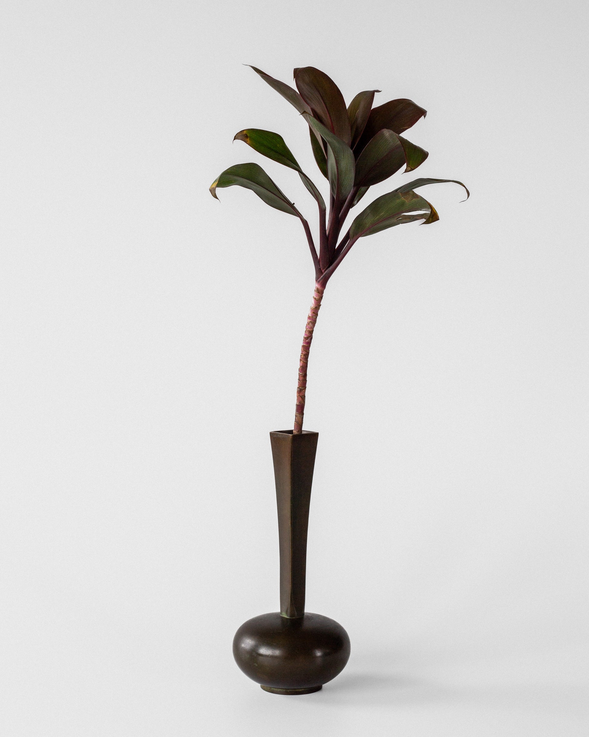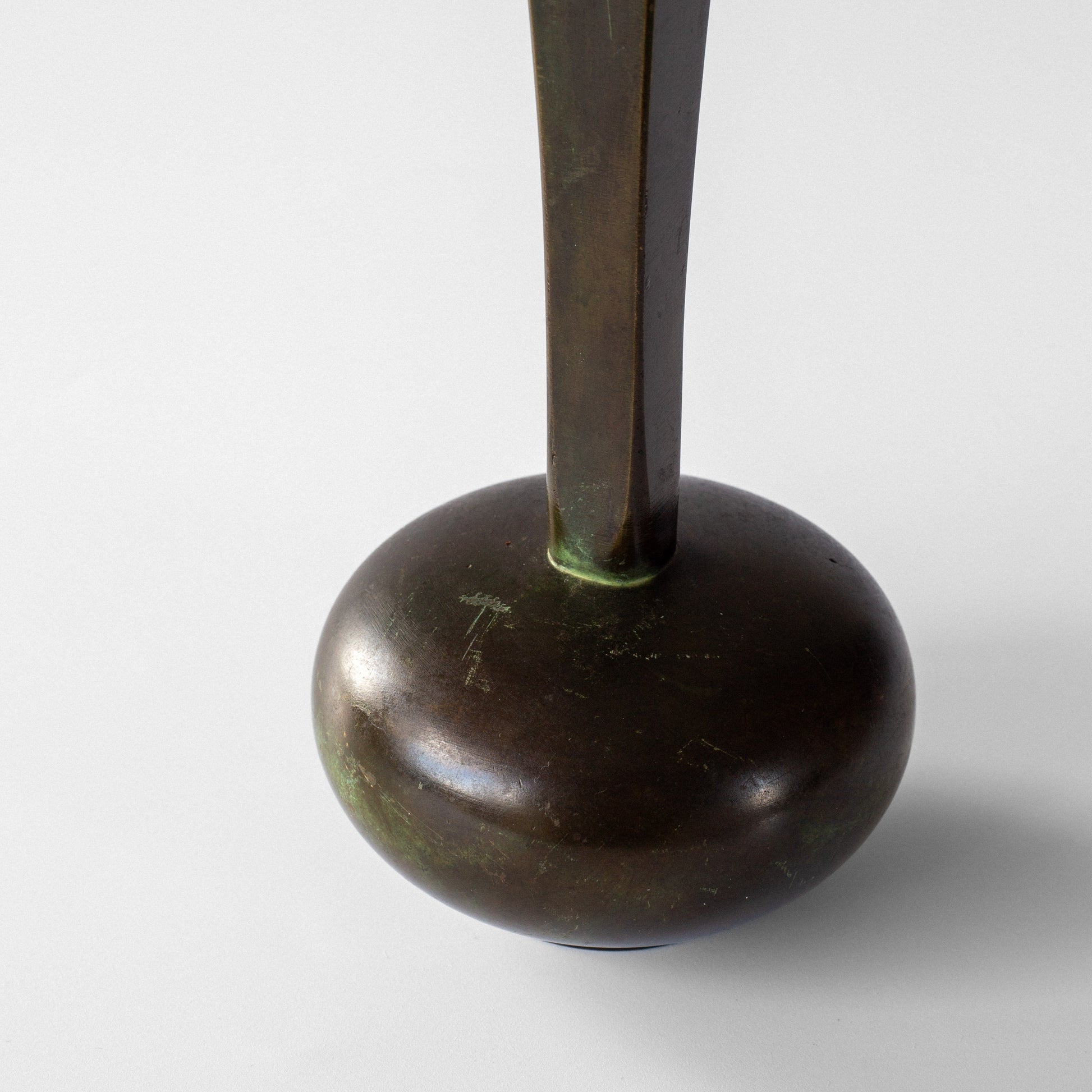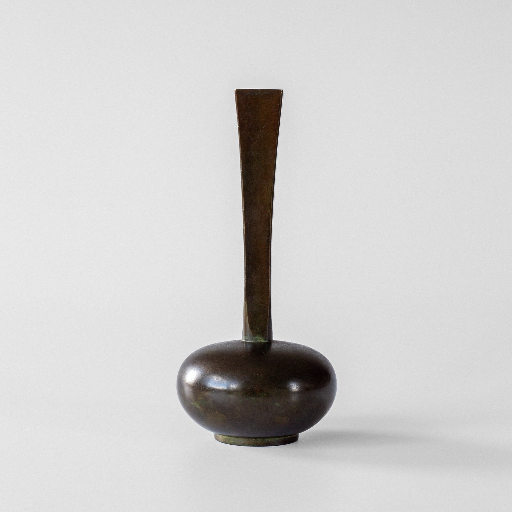 Elegant bronze vase featuring a plumb base contrasted with a slender, tapering neck. Beautifully patinated with dark green in varying nuances. Crafted by GAB (Guldsmedsaktiebolaget) in the 1930s and attributed to Jacob Ängman.