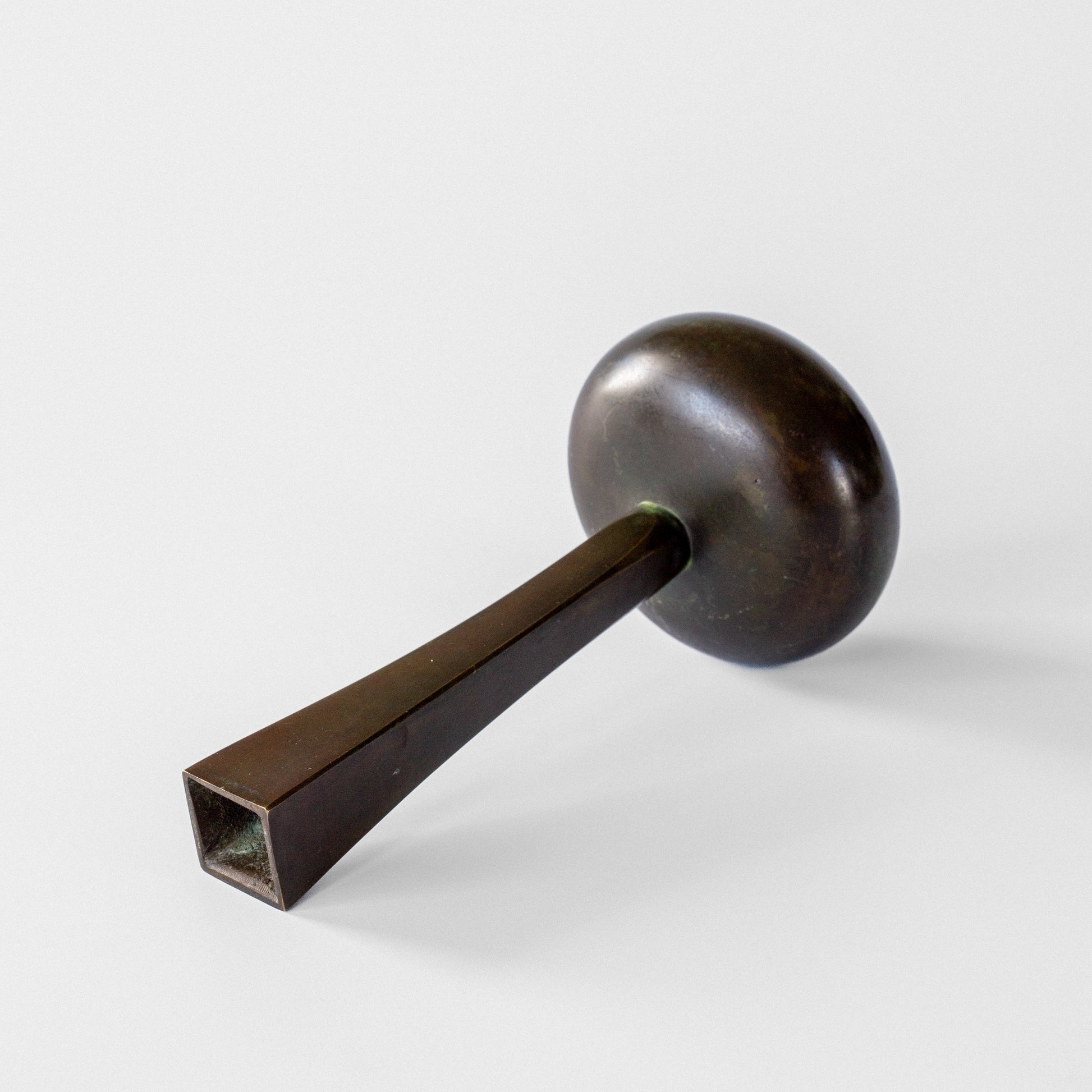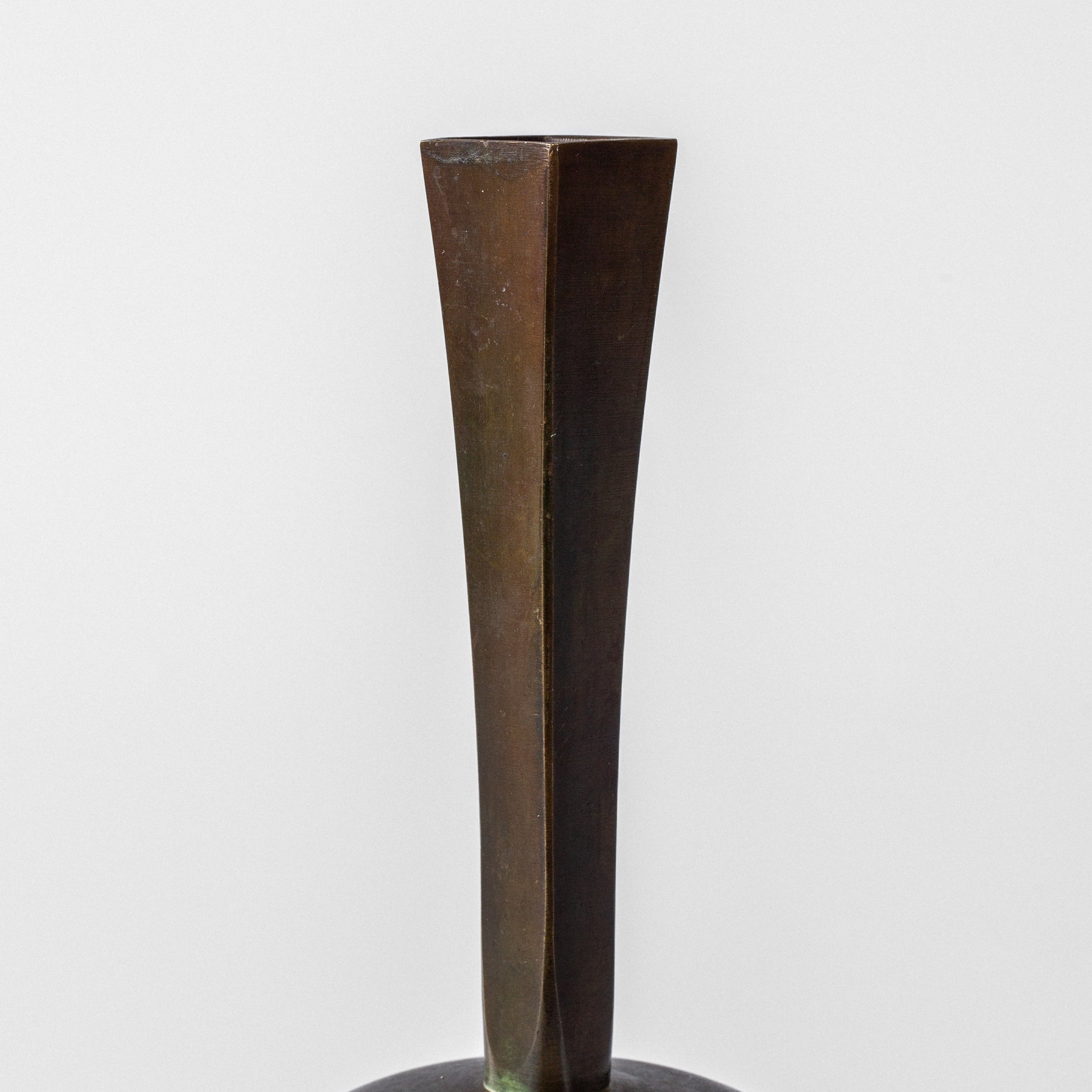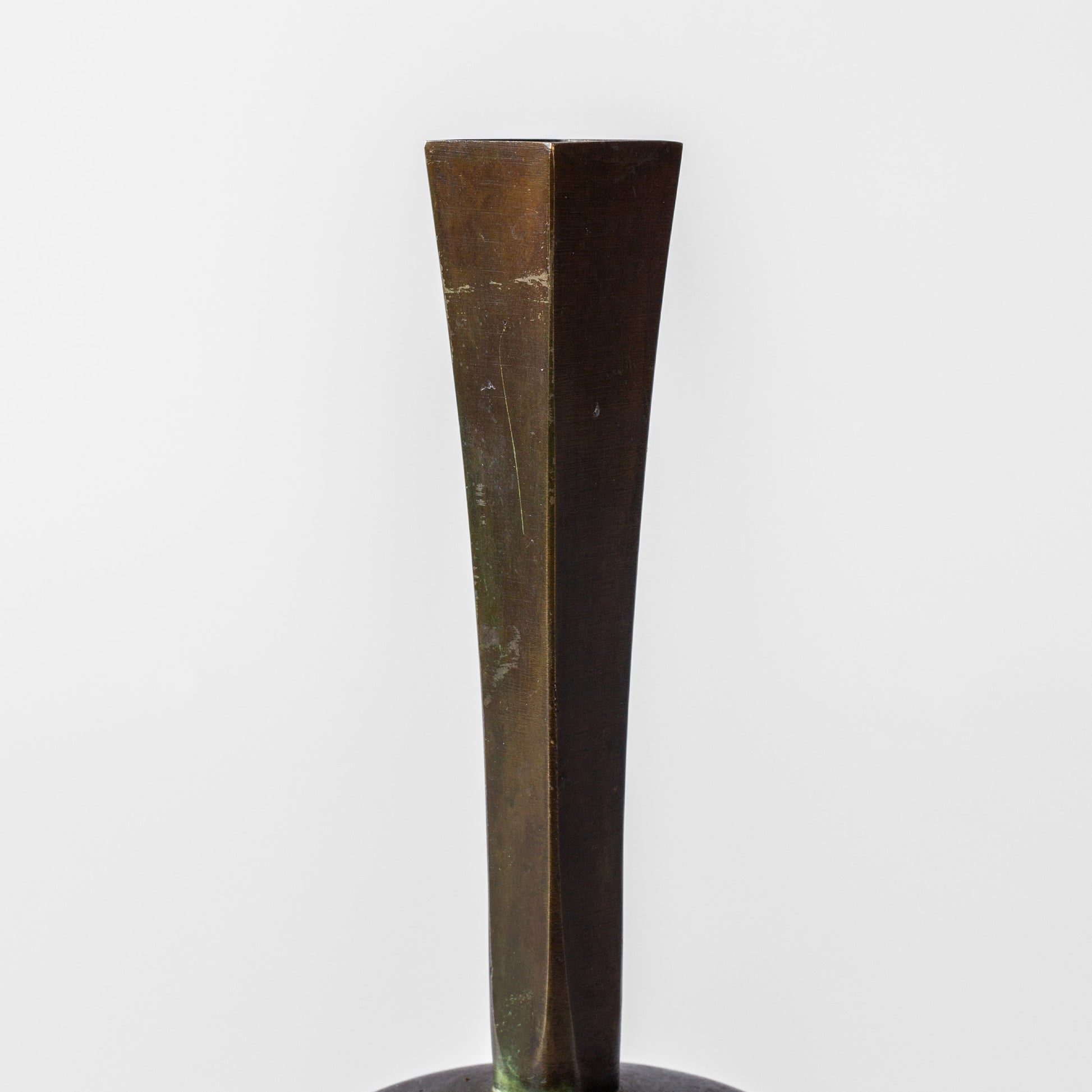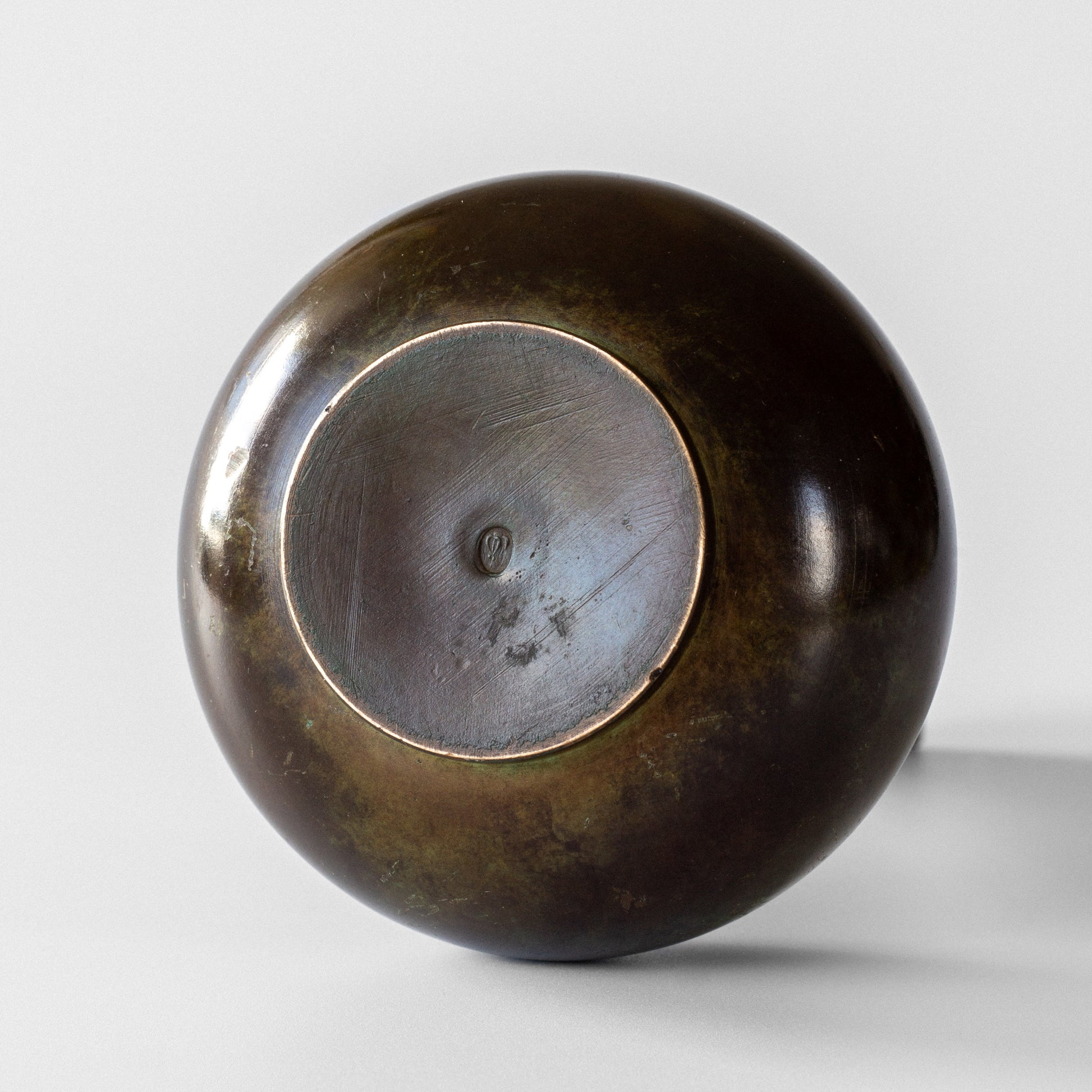 Elegant bronze vase featuring a plumb base contrasted with a slender, tapering neck. Beautifully patinated with dark green in varying nuances. Crafted by GAB (Guldsmedsaktiebolaget) in the 1930s and attributed to Jacob Ängman.