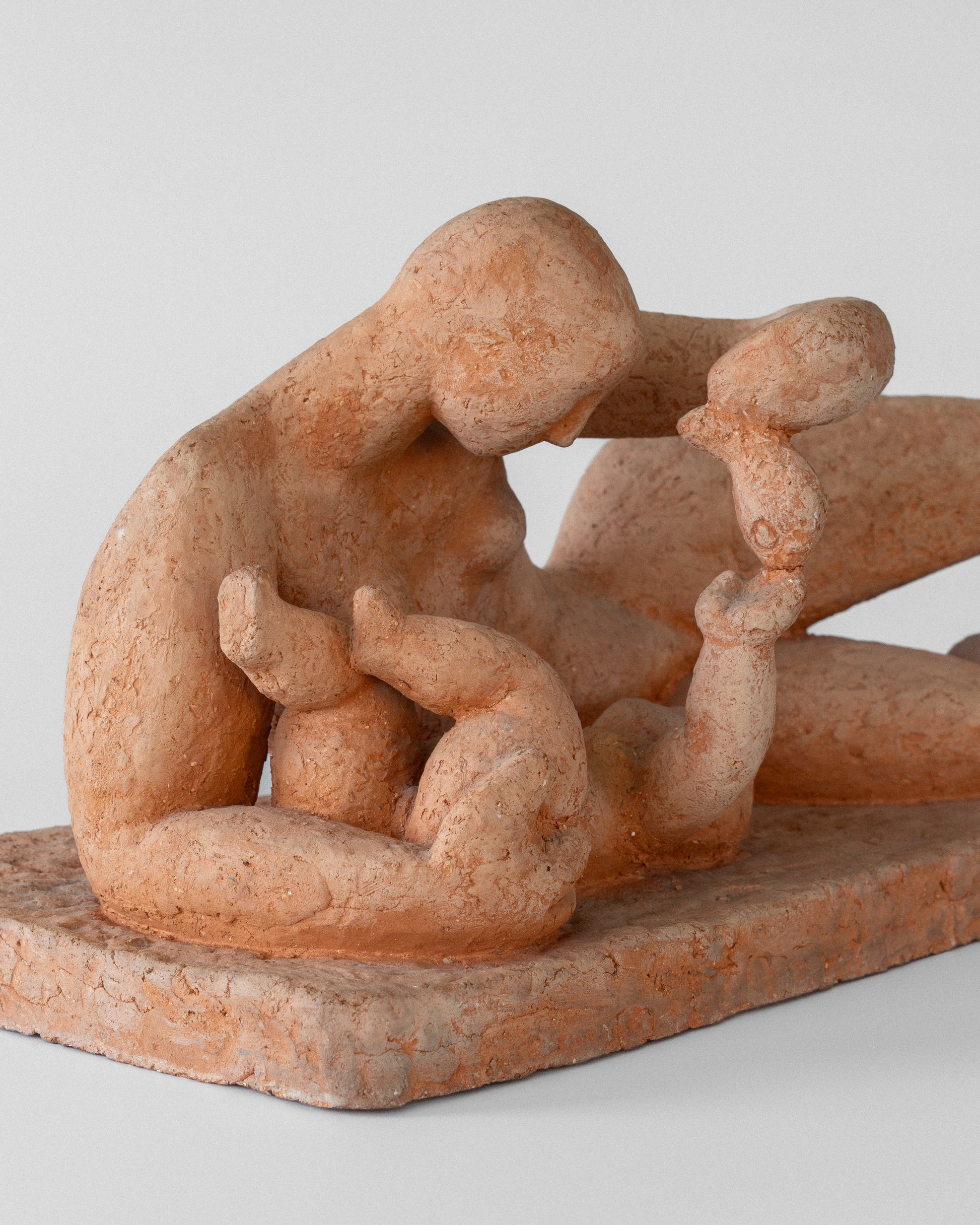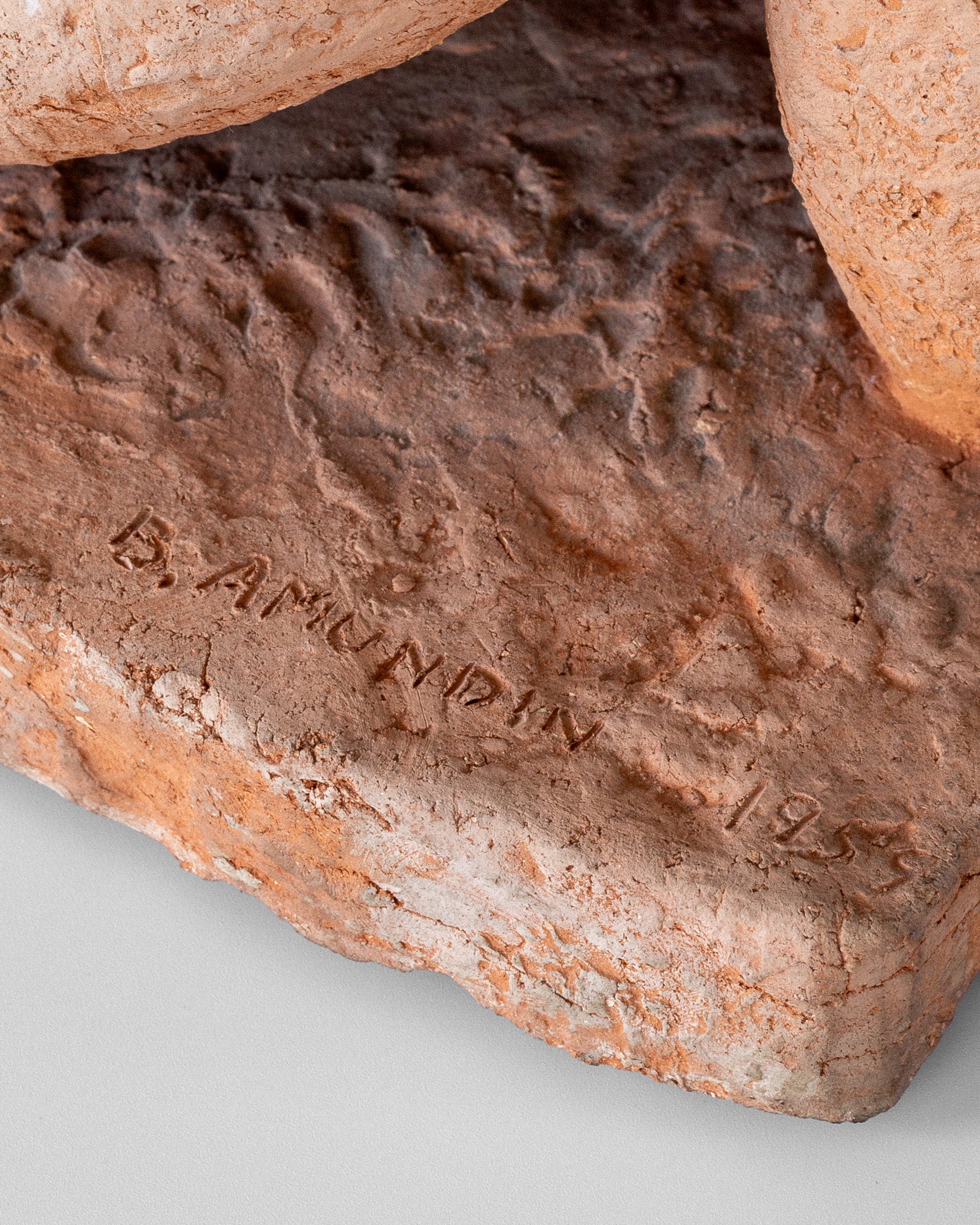 This modernist sculpture captures an intimate moment between a reclining adult figure and child, crafted in unglazed terracotta. Created in 1955 by Swedish artist Bengt Amundin (1915-2011), the piece perfectly exemplifies his characteristic style of rhythmic compositions and rounded forms. Having studied at both the School of Arts and Crafts in Gothenburg and the Royal Academy of Fine Arts in Stockholm, Amundin's mastery of sculptural volume is beautifully expressed in this work. Signed and dated.