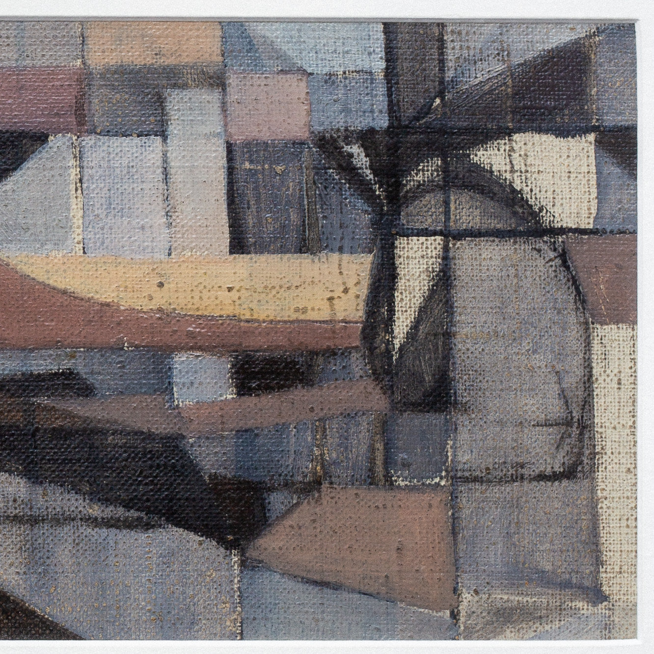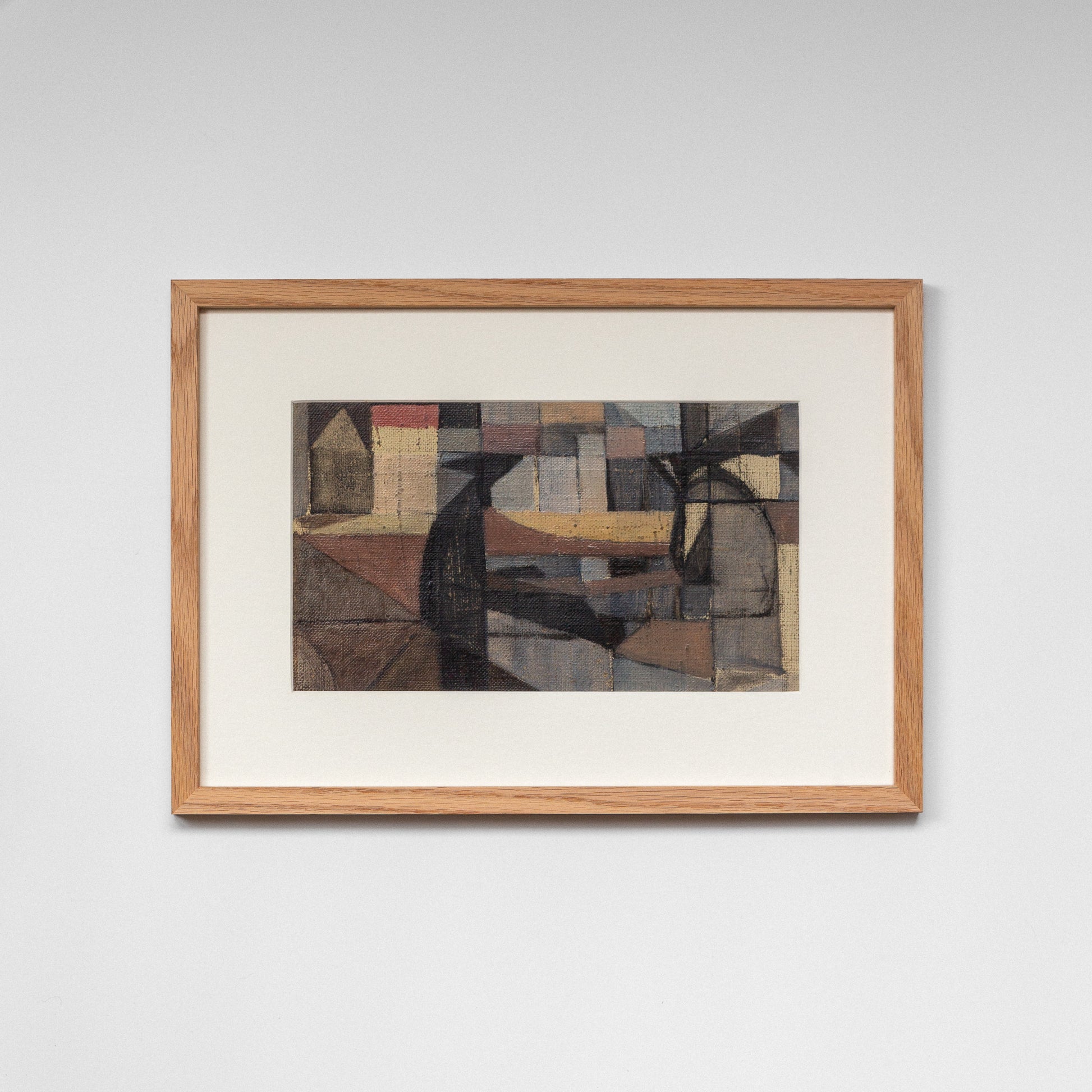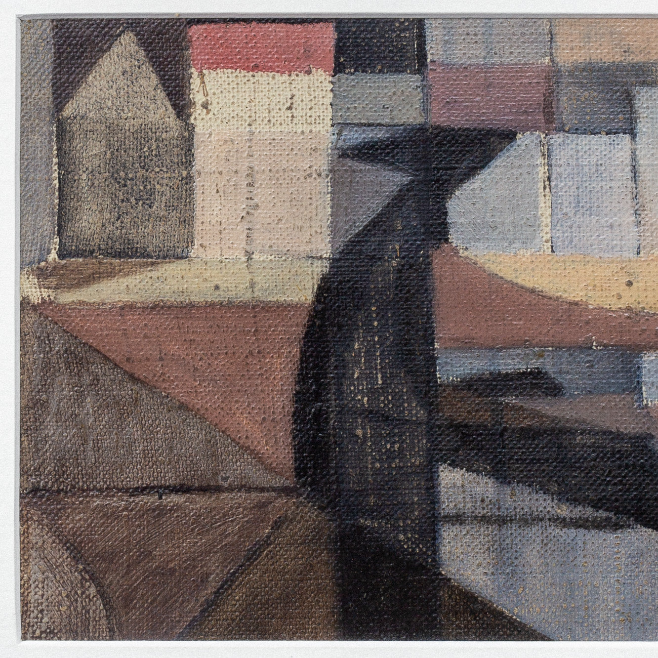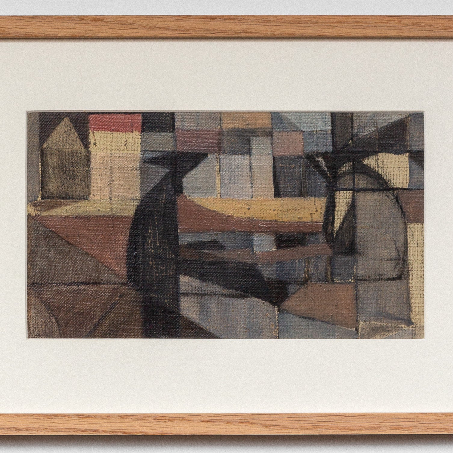 An abstract cityscape oil painting by Swedish artist Carl Riise (1920-2016). The composition features geometric architectural forms rendered in browns, grays, and muted yellows, displaying Riise's characteristic cubist-influenced style and proficient use of light and shadow.