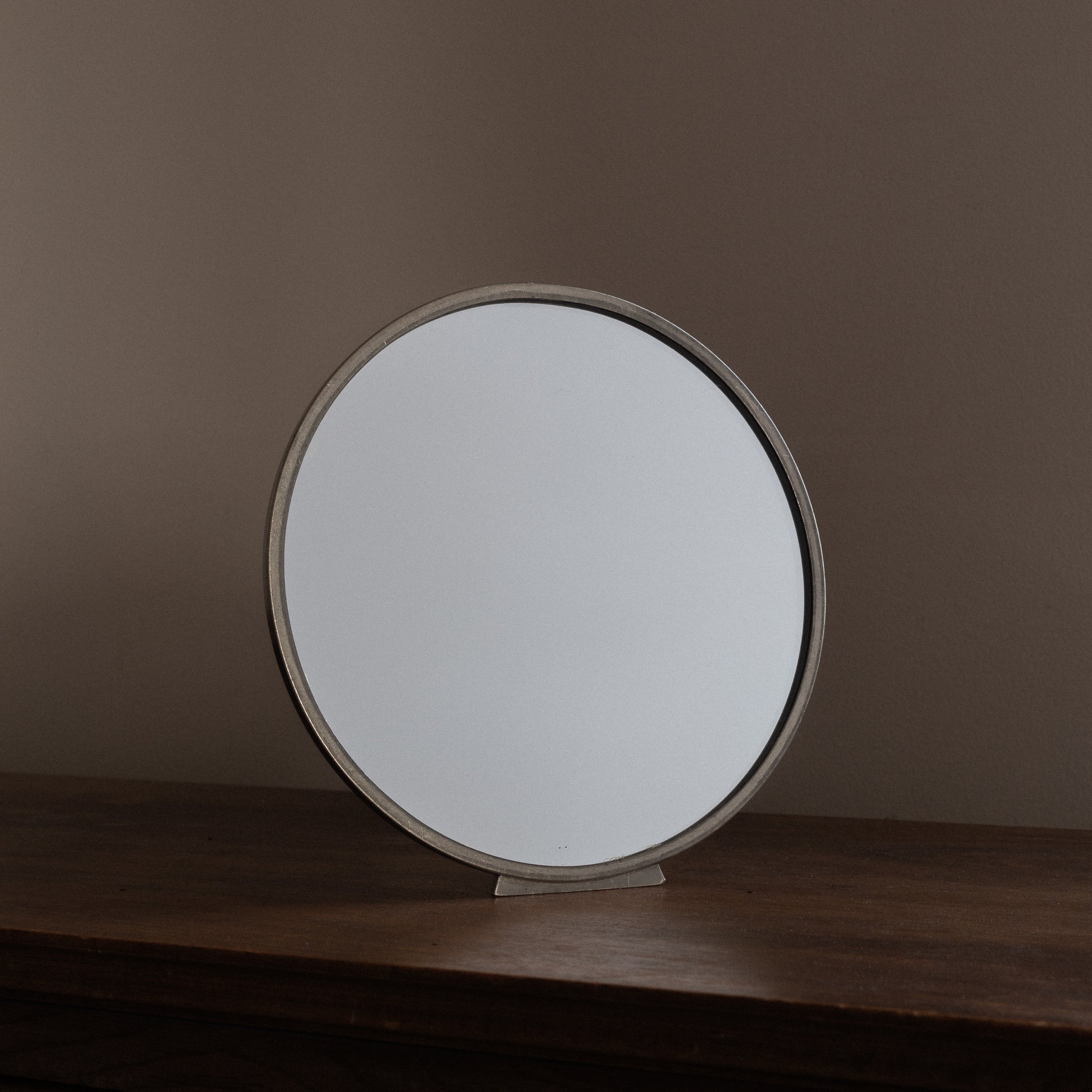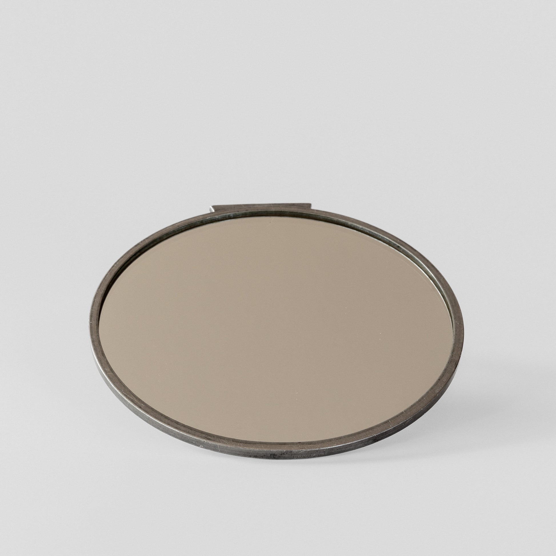 A round hand-held Swedish Grace mirror, crafted in pewter in 1930s Sweden. Produced by C.G. Hallberg and likely designed by the esteemed artist Edvin Ollers, the mirror features a handle elegantly shaped like a dolphin. Its versatile design allows it to be displayed either standing or lying flat, offering both style and functionality.