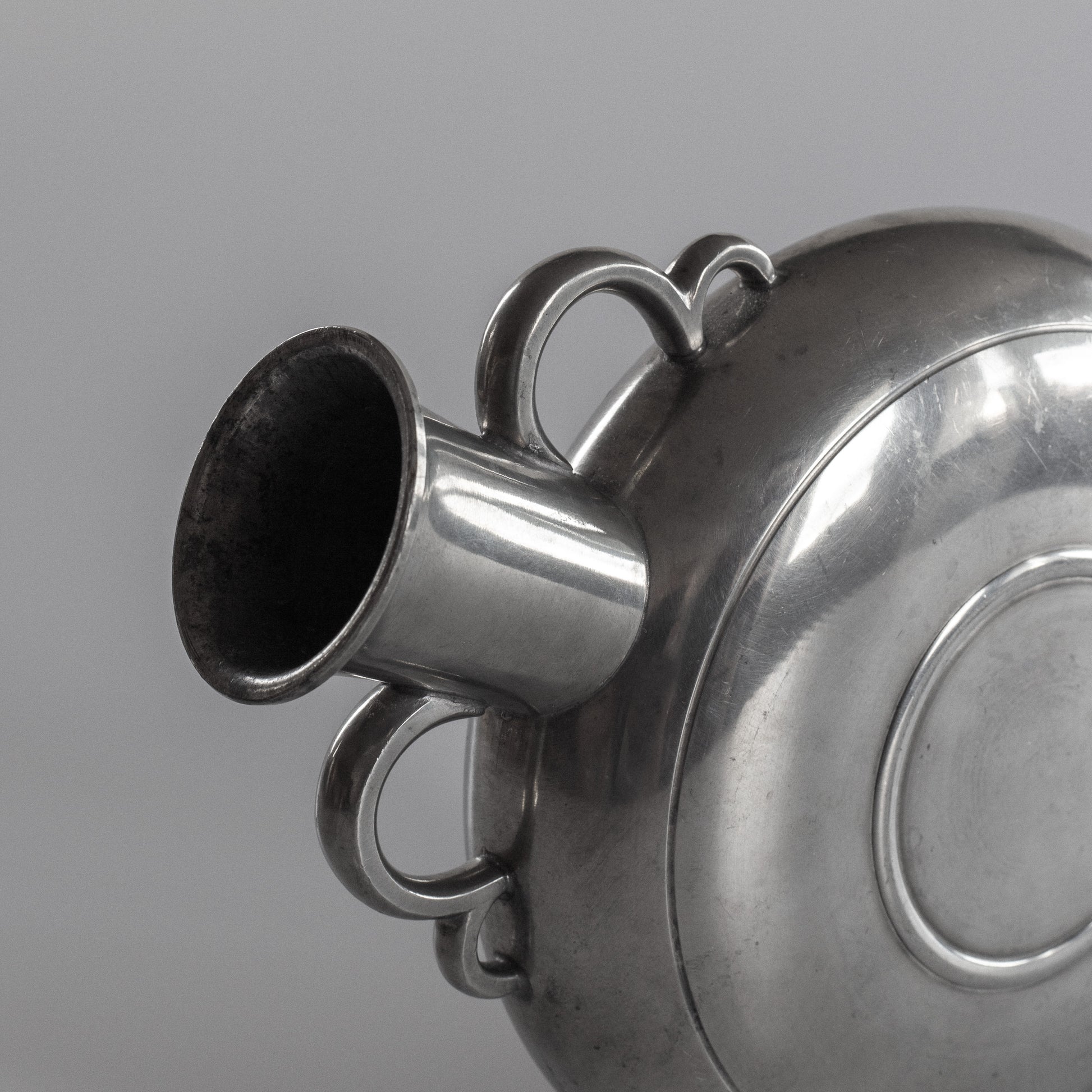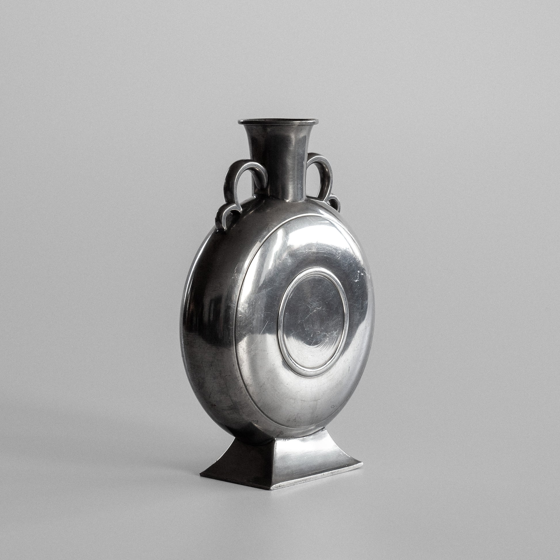Pewter vase crafted by the Swedish company GAB (Guldsmedsaktiebolaget) in 1935. Its sleek design, with graceful handles elegantly attached to the neck and body, reflects the Scandinavian craftsmanship of the period.