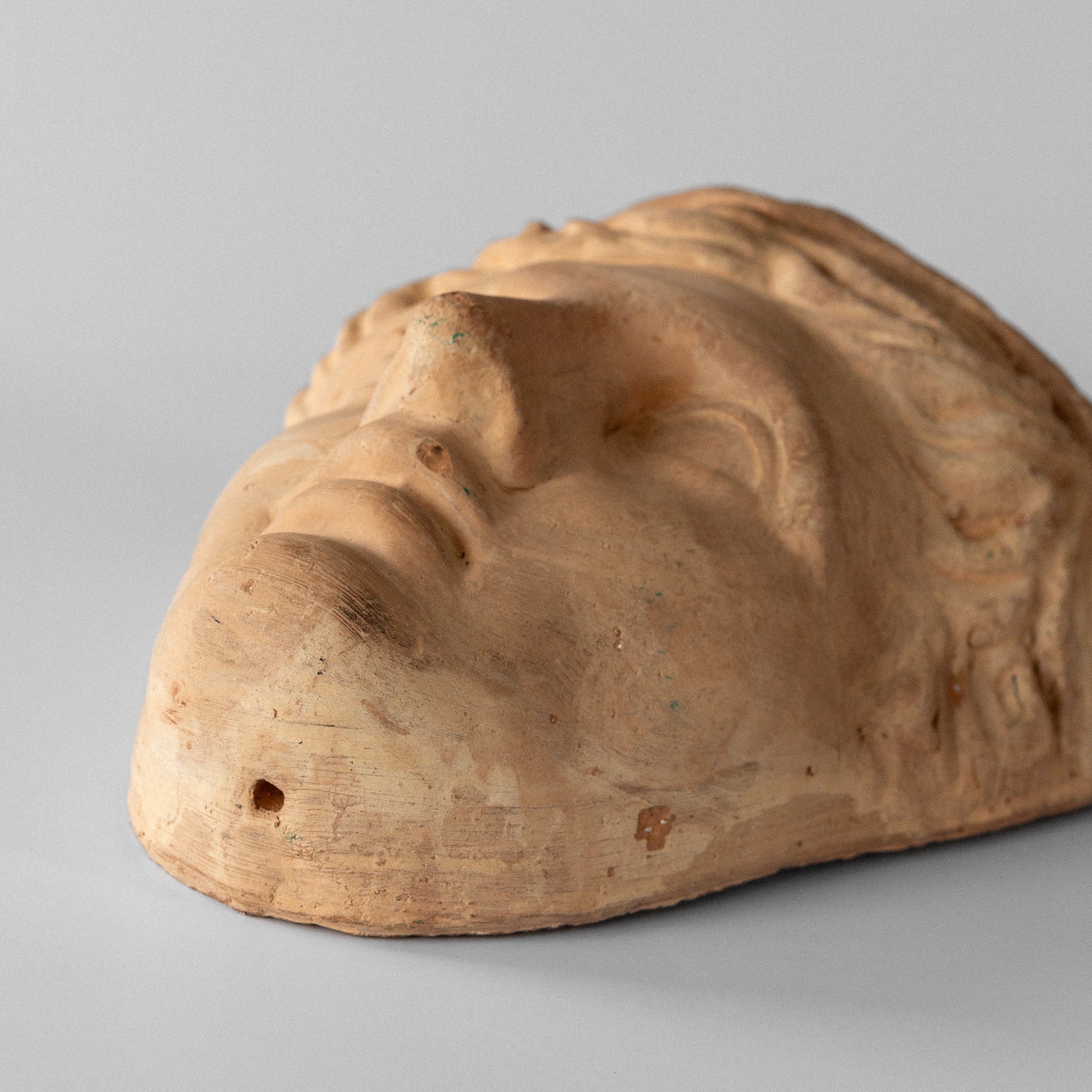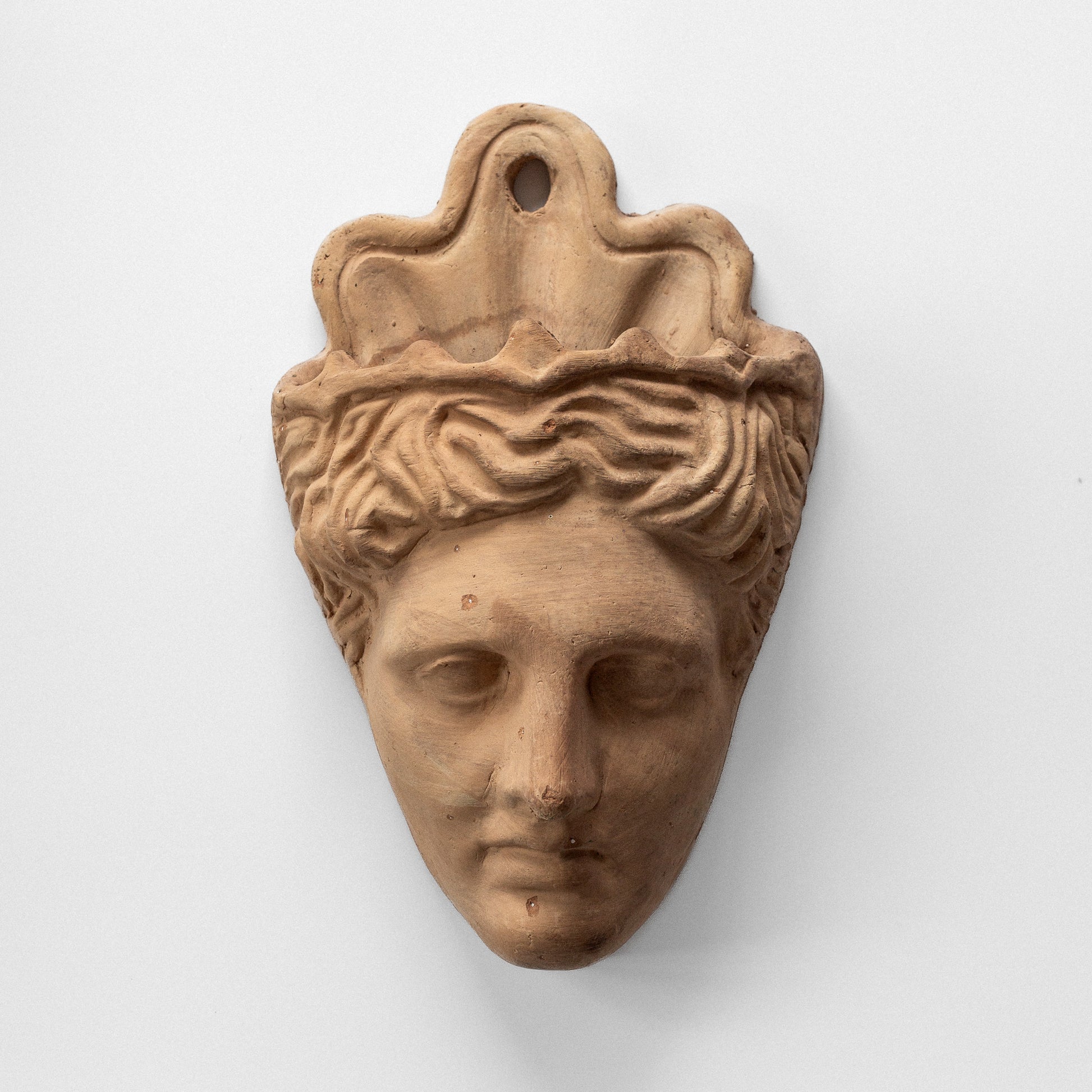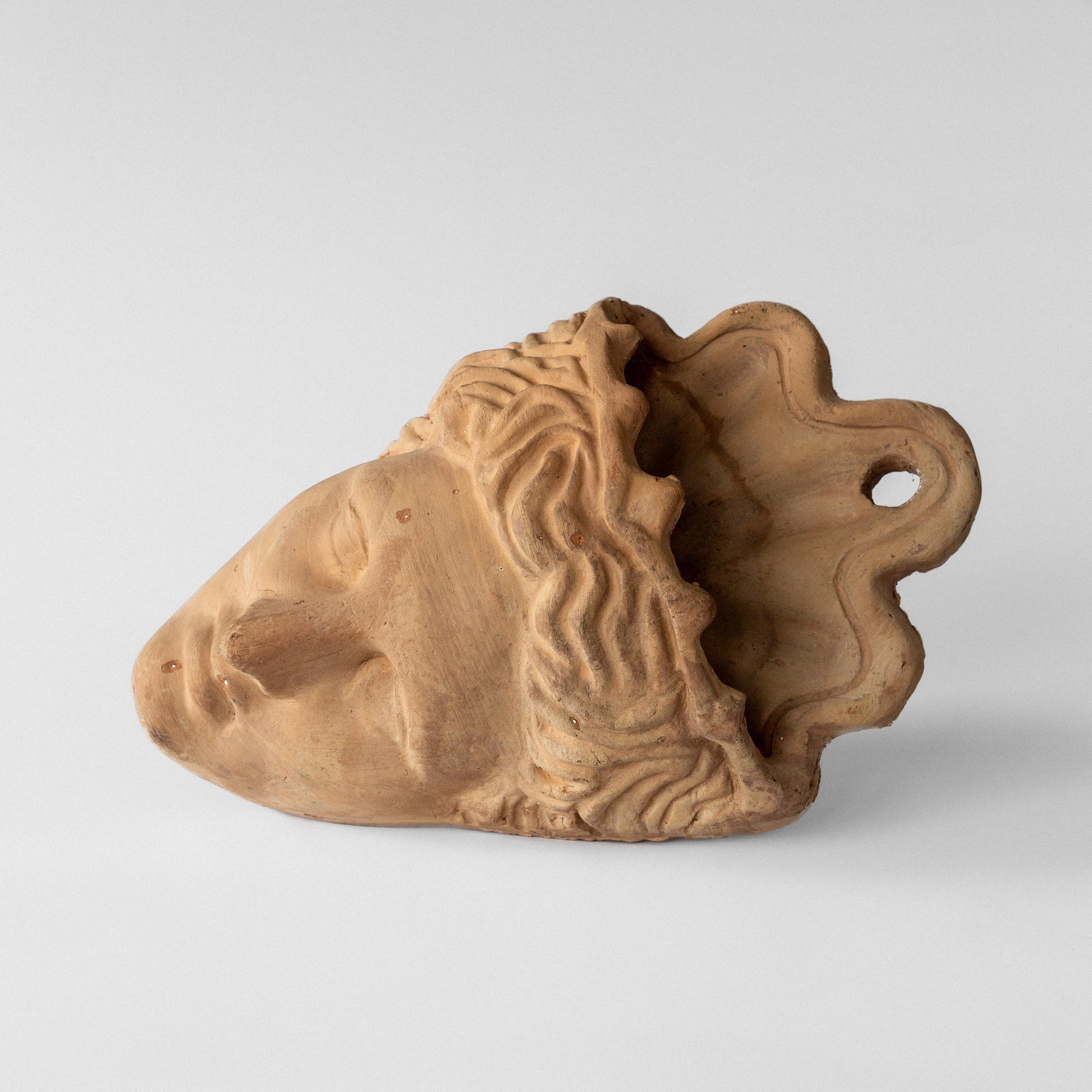 Vintage terracotta wall mask planter featuring finely molded classical features and wavy hair crowned with a decorative top handle. Drainage hole at base for outdoor use. Beautiful patina and craftsmanship suggesting European origins, 20th Century.