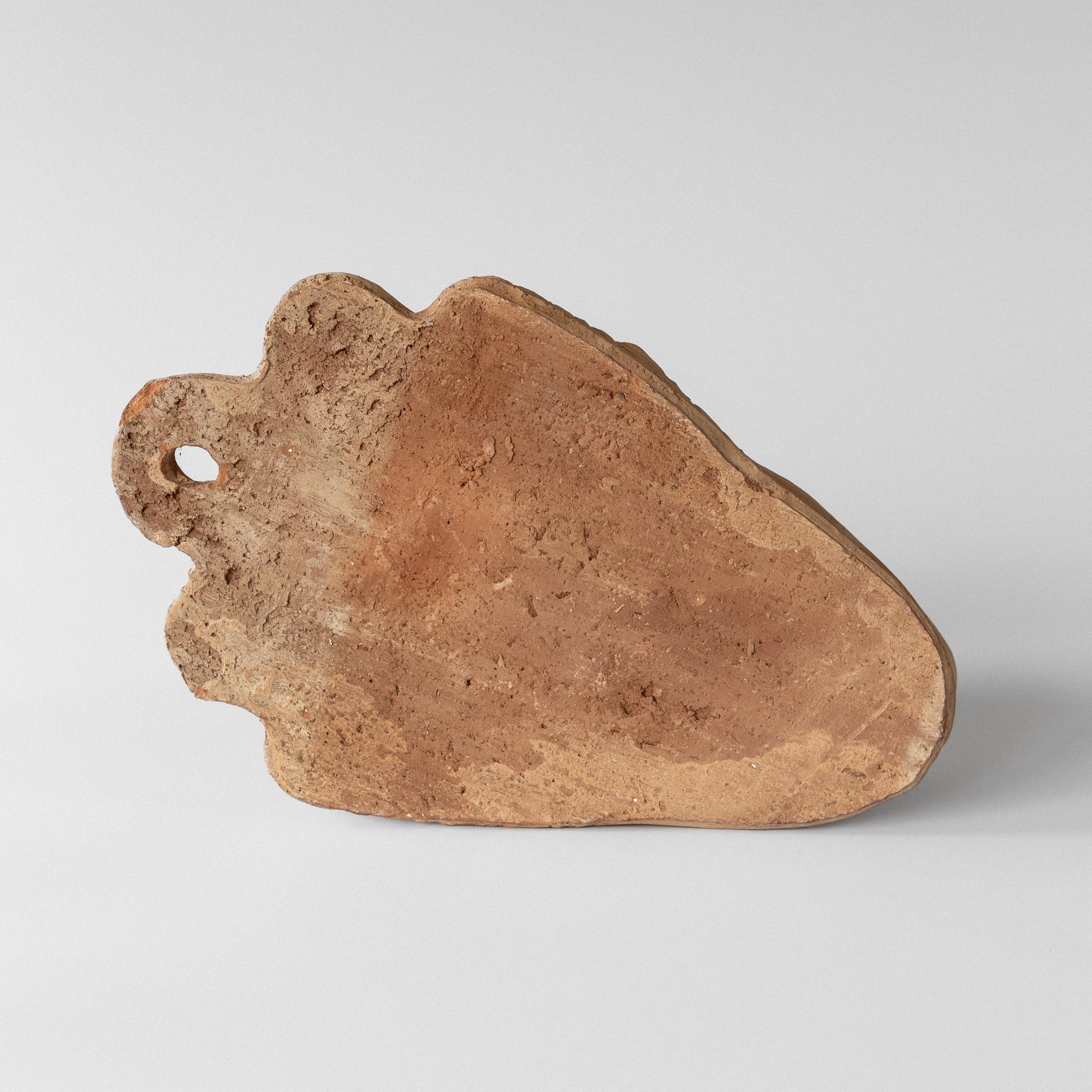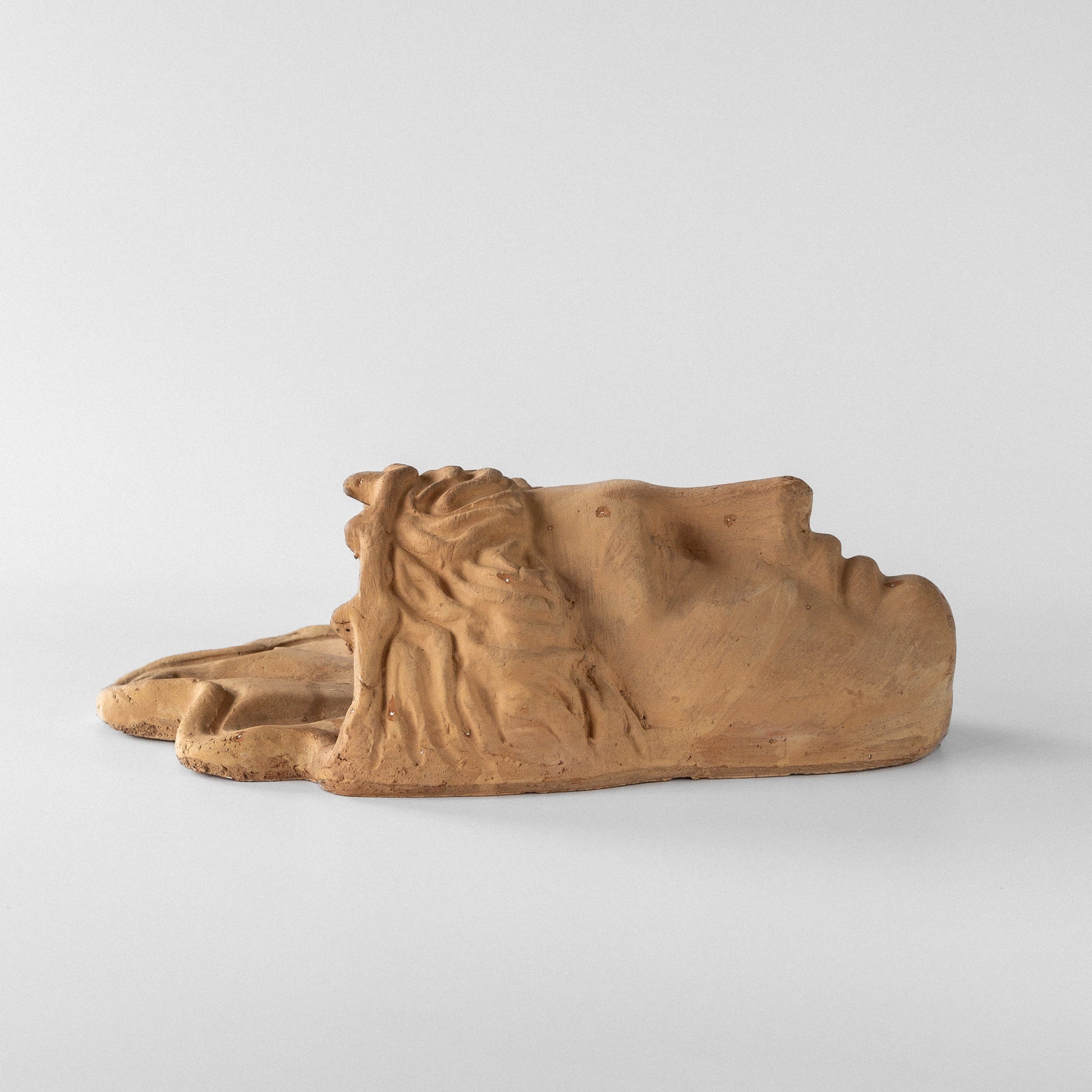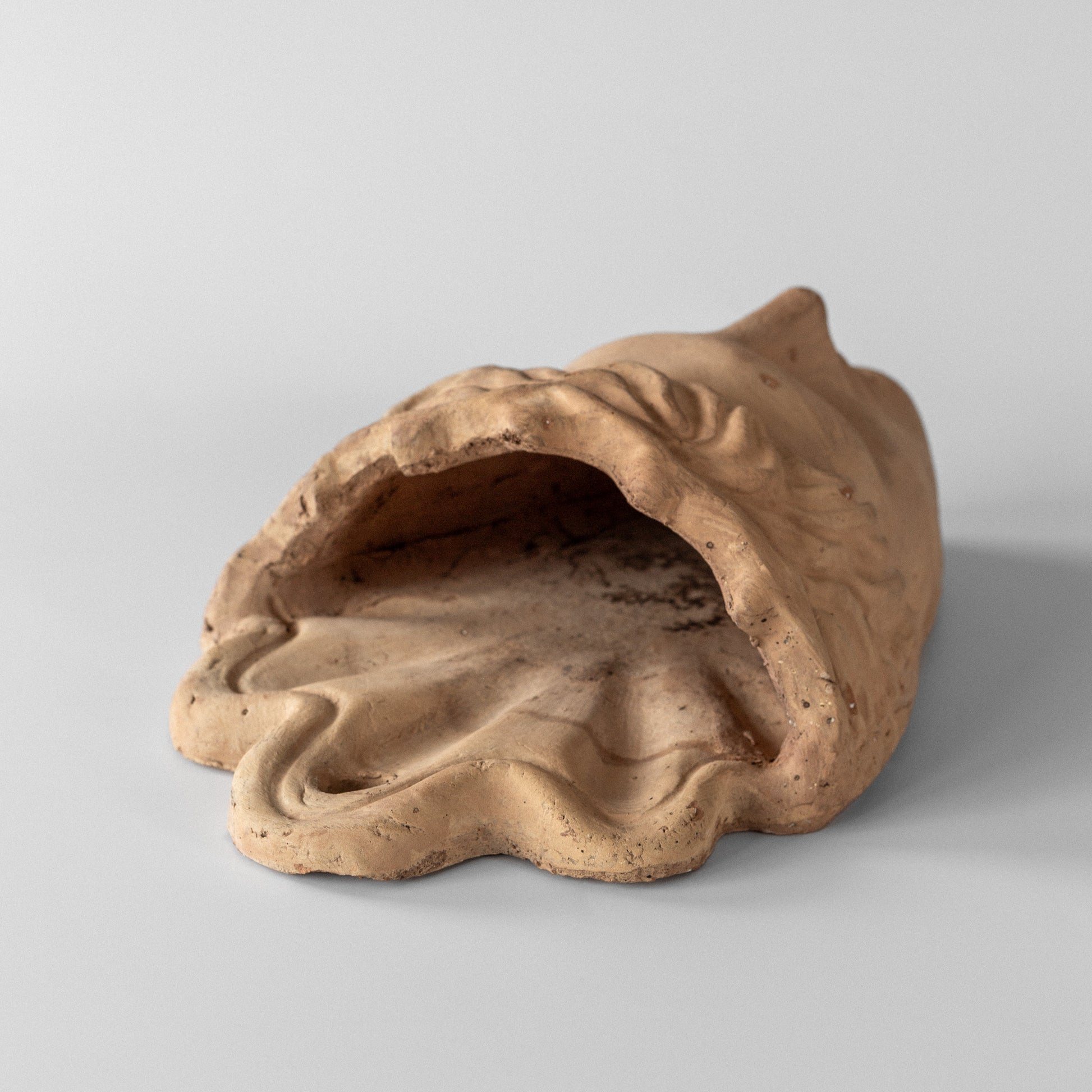Vintage terracotta wall mask planter featuring finely molded classical features and wavy hair crowned with a decorative top handle. Drainage hole at base for outdoor use. Beautiful patina and craftsmanship suggesting European origins, 20th Century.