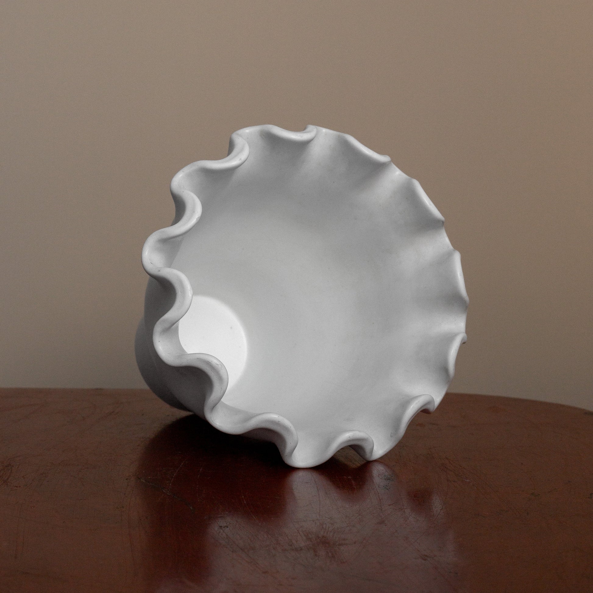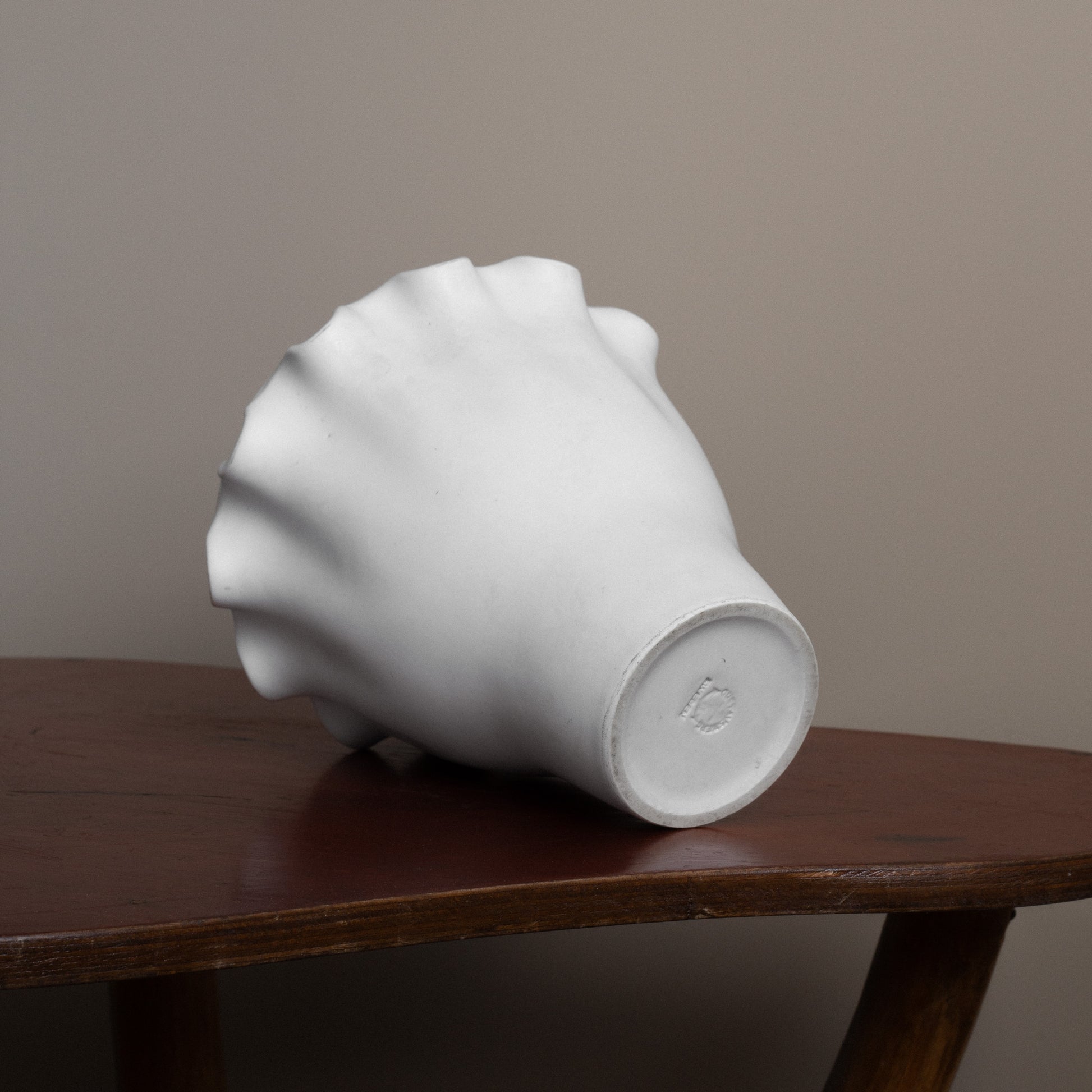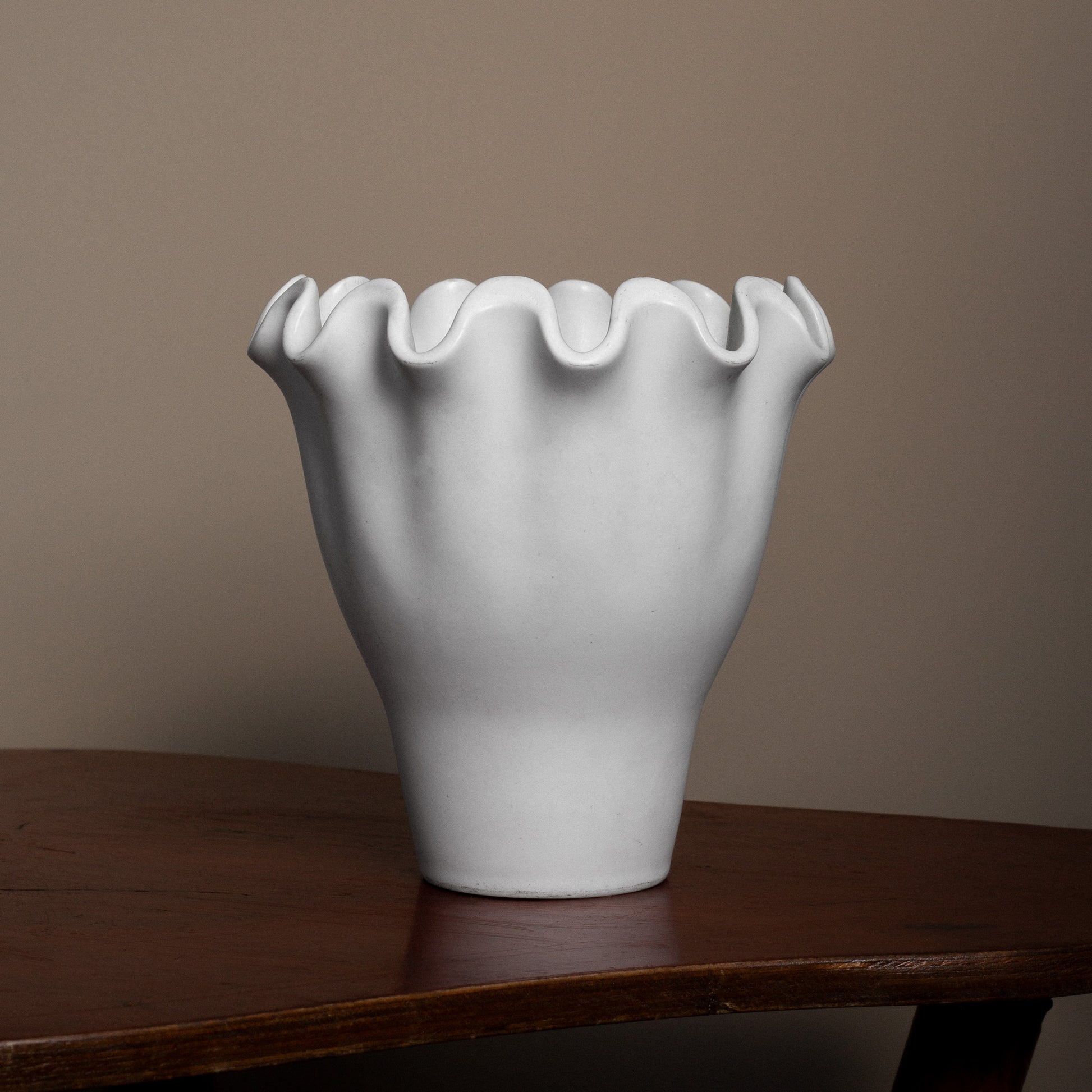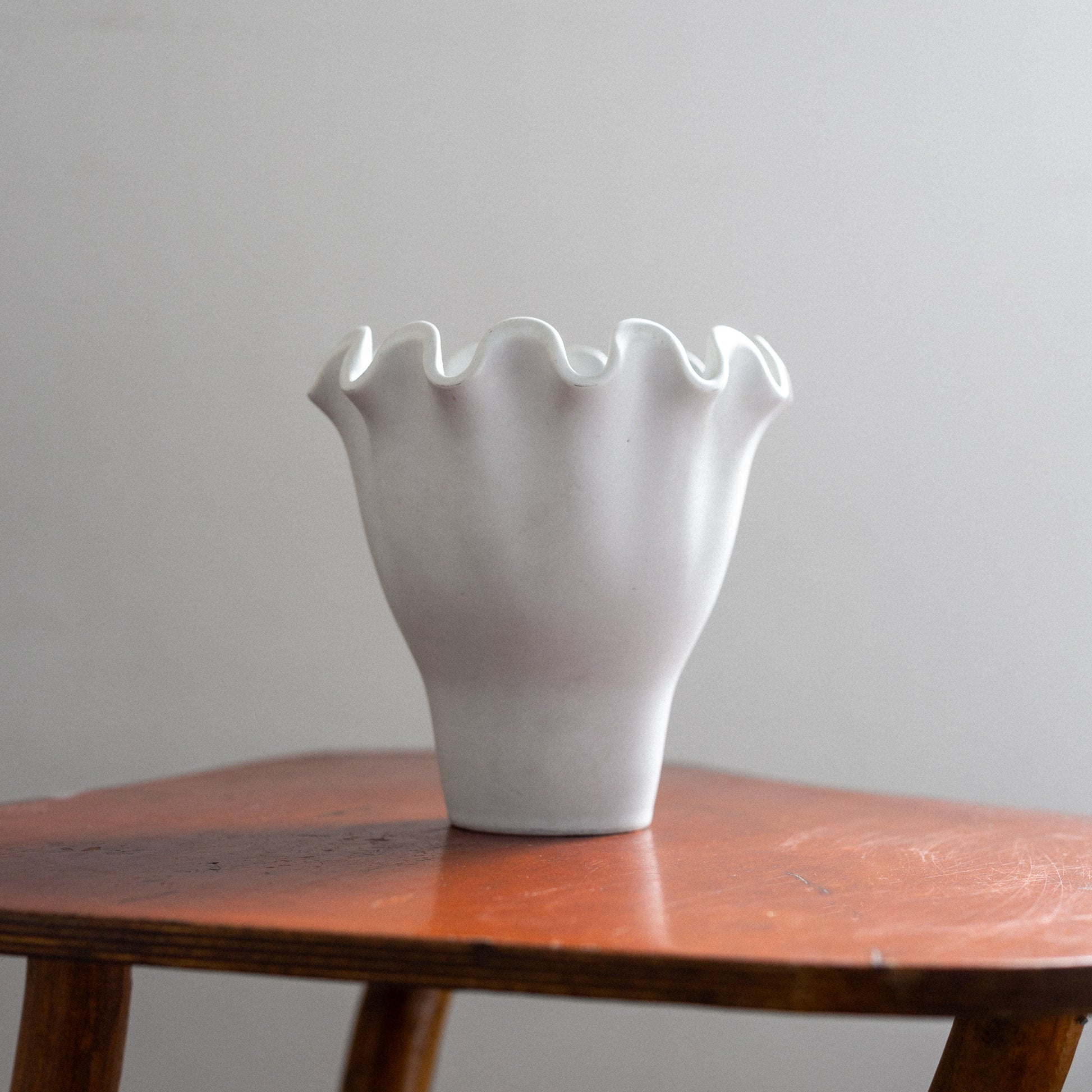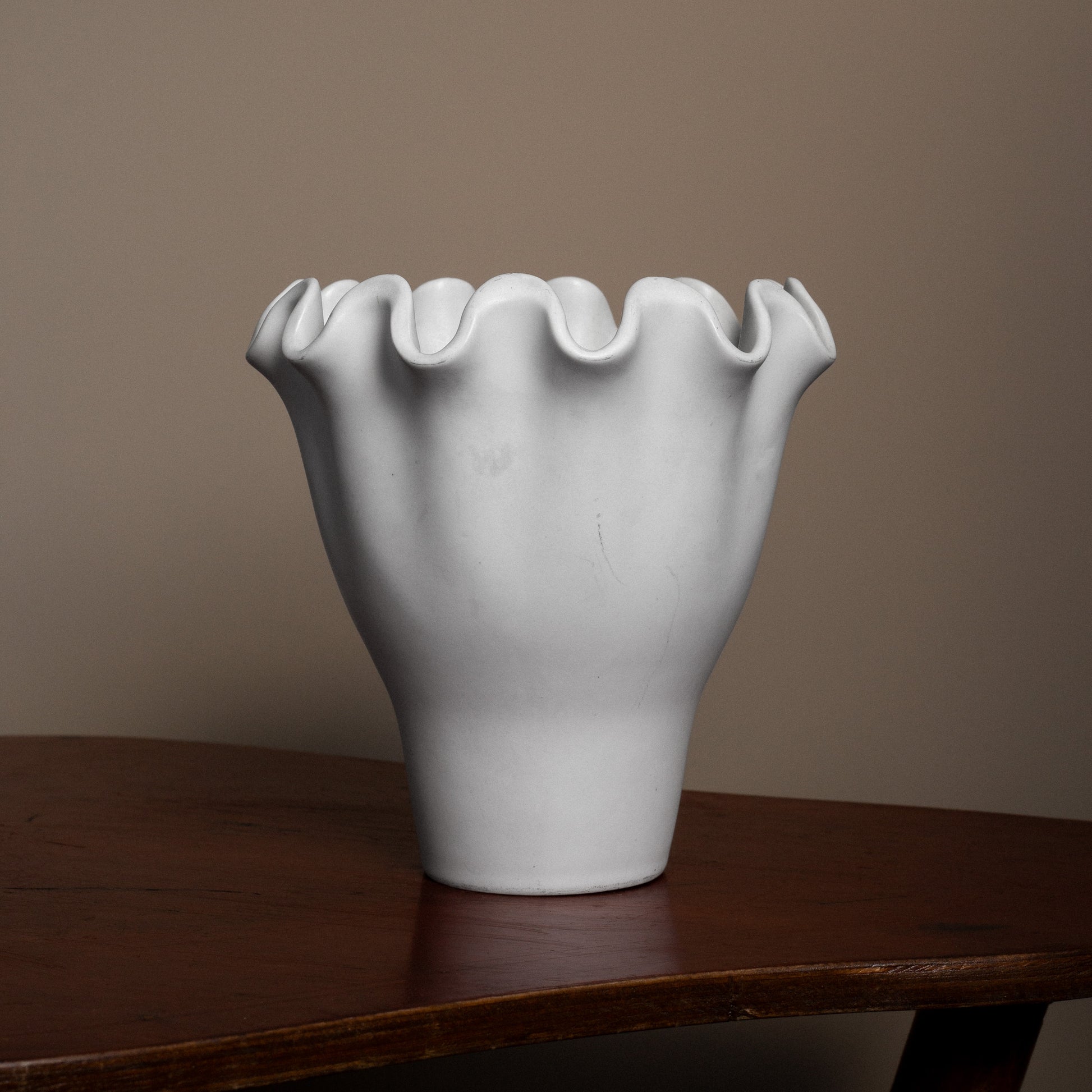A striking stoneware vase from Wilhem Kåge's renowned "Våga" series for Gustavsberg. The sculptural rippling rim and pure white Carrara glaze exemplify the refined simplicity of Swedish Modern. Part of a celebrated stoneware collection designed in 1949, featuring organic forms and serene expression. This piece demonstrates the exceptional craftsmanship that made Gustavsberg a leader in Scandinavian design.