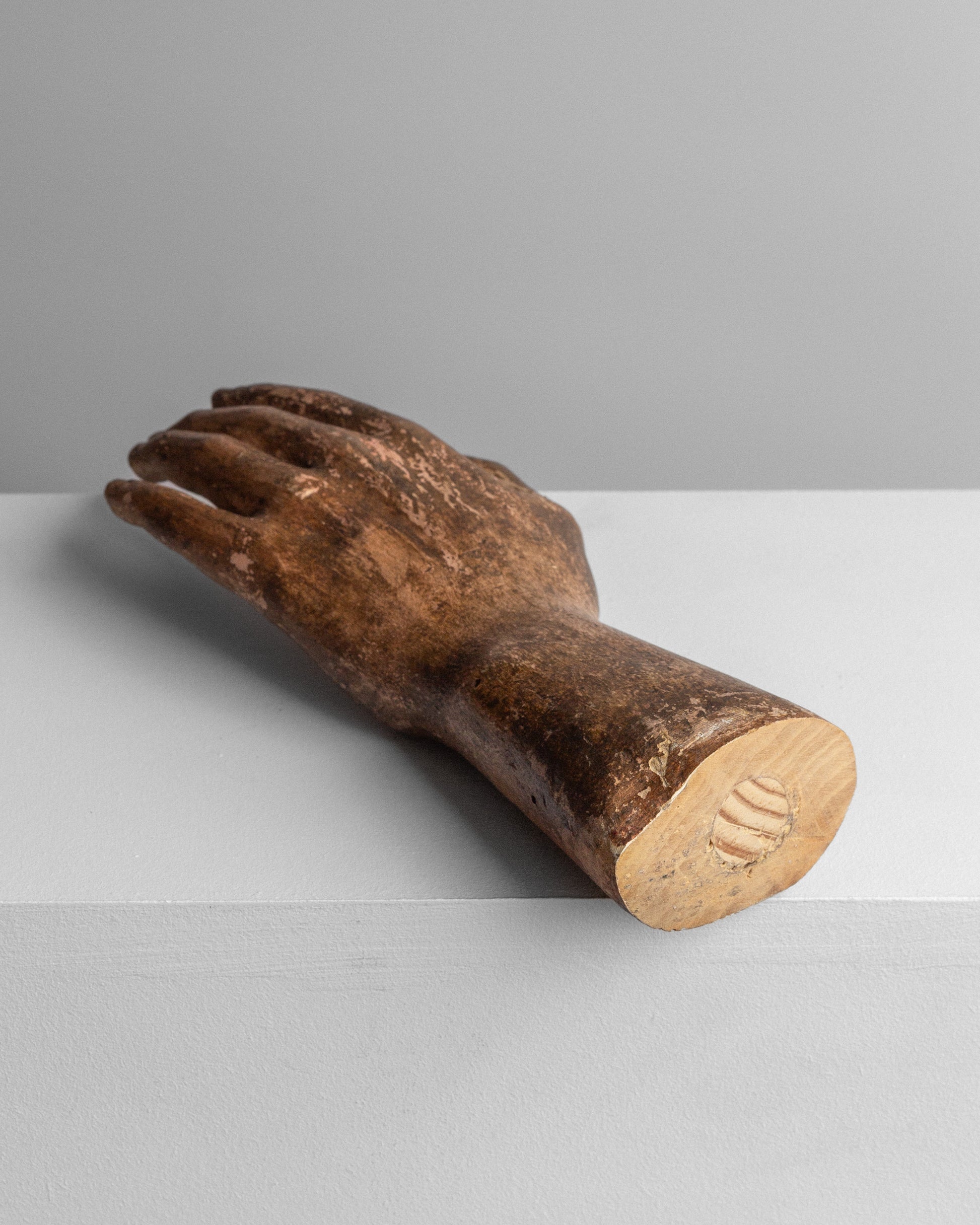 This antique wooden hand sculpture, dating back to the early 20th century, features finely detailed craftsmanship and a beautifully aged patina. The hand is nearly life-sized, depicted in a relaxed yet elegant position with slightly extended fingers. The weathered surface adds unique character and charm, reflecting its age. Whether displayed upright or lying flat, this versatile piece makes a striking decorative accent.