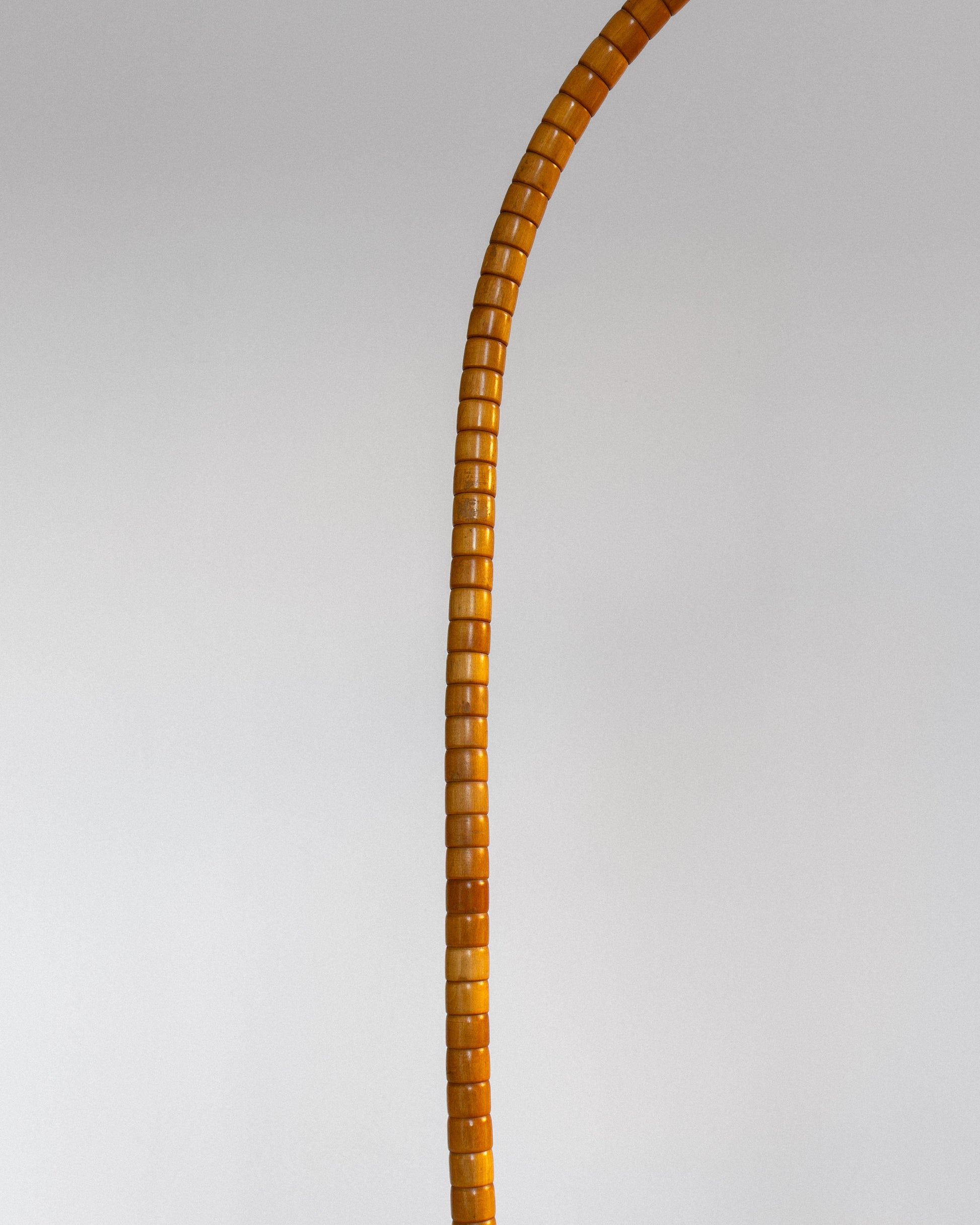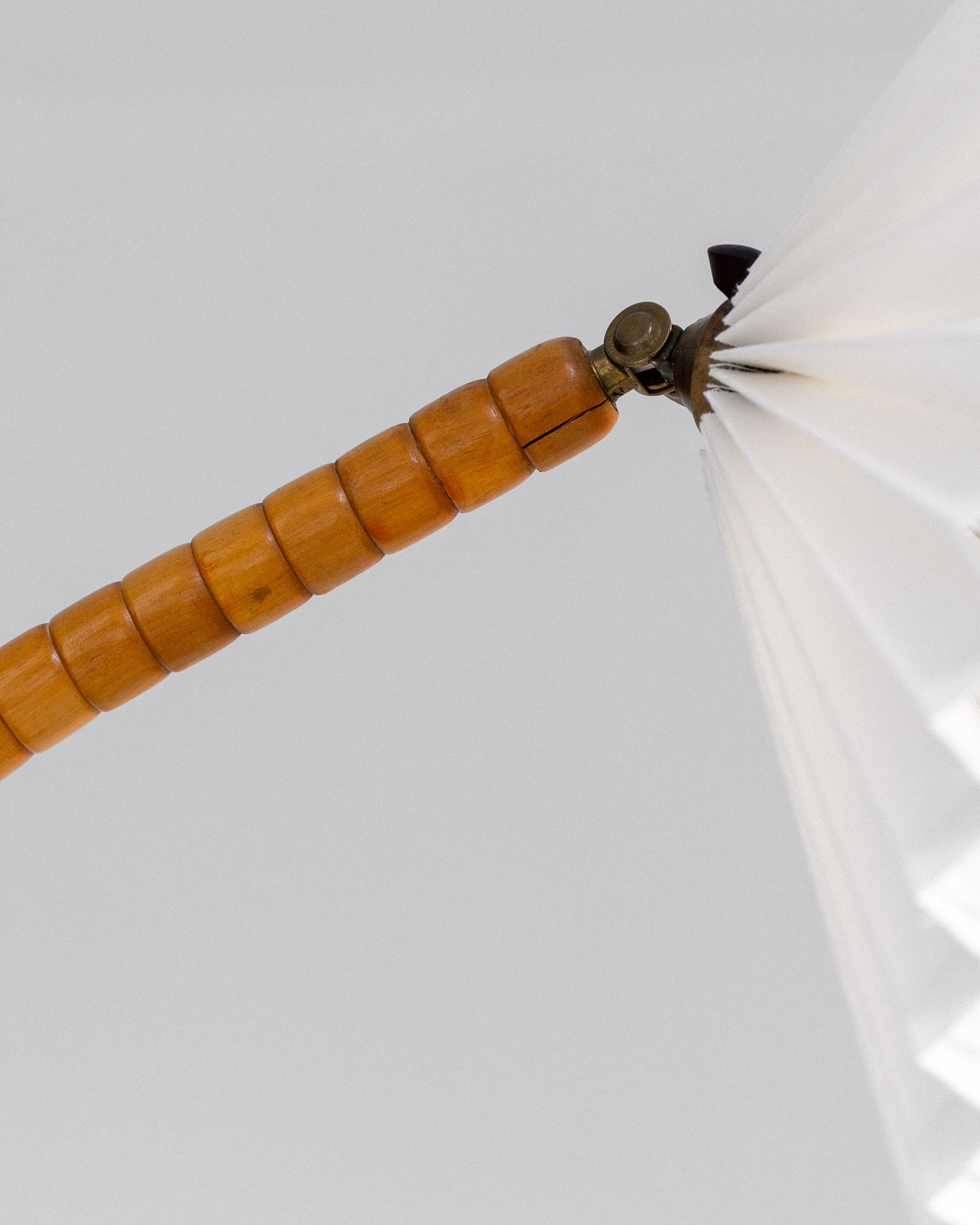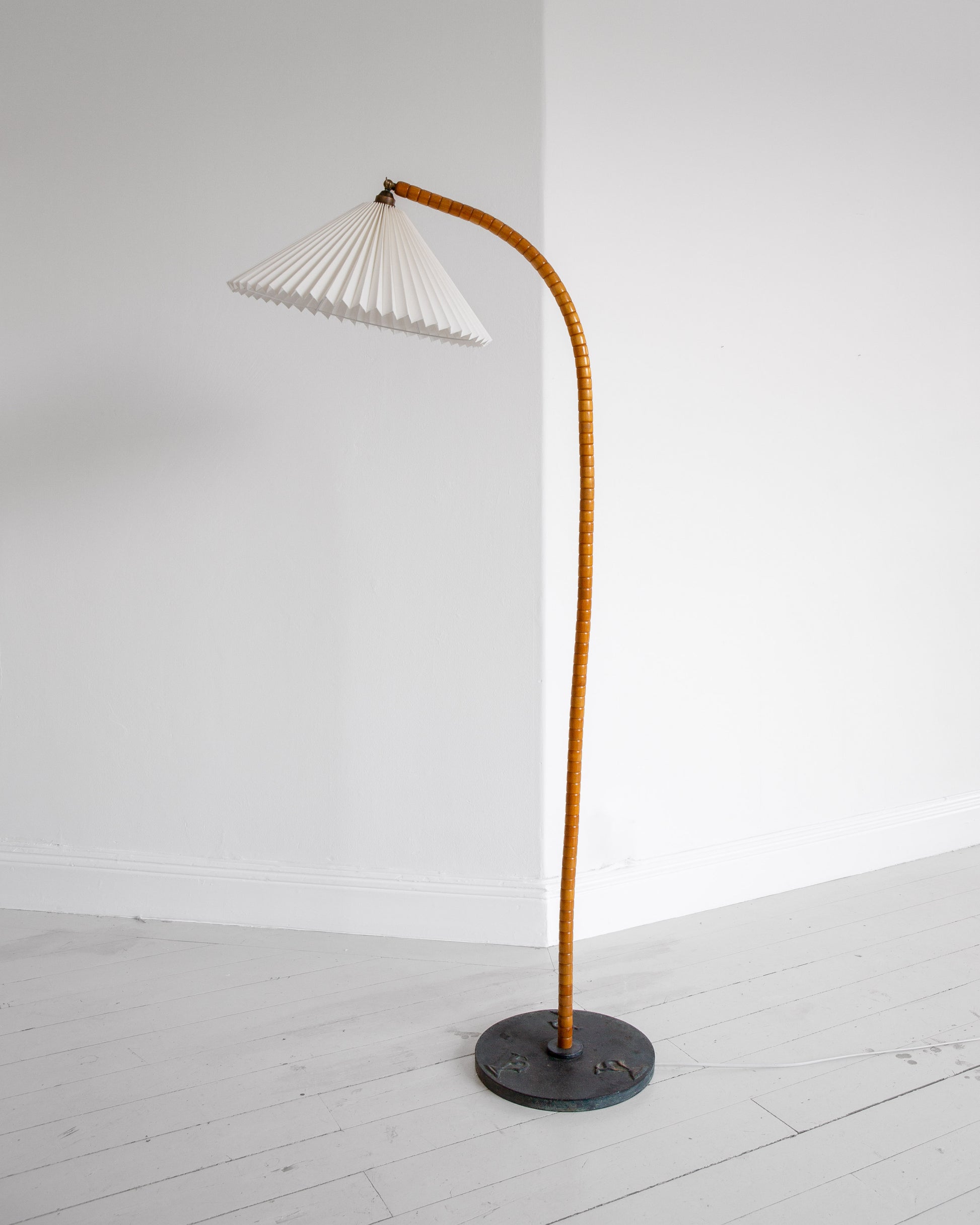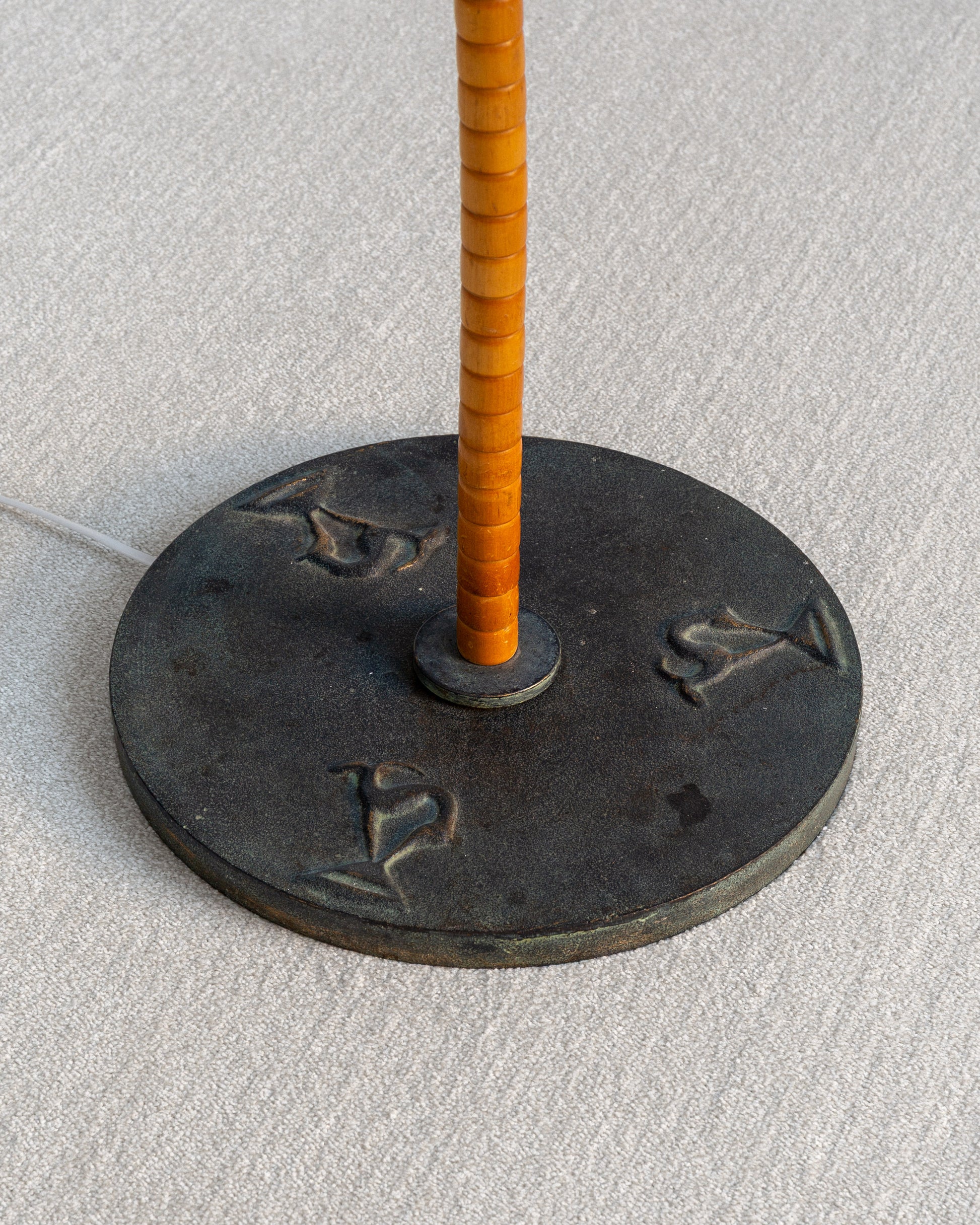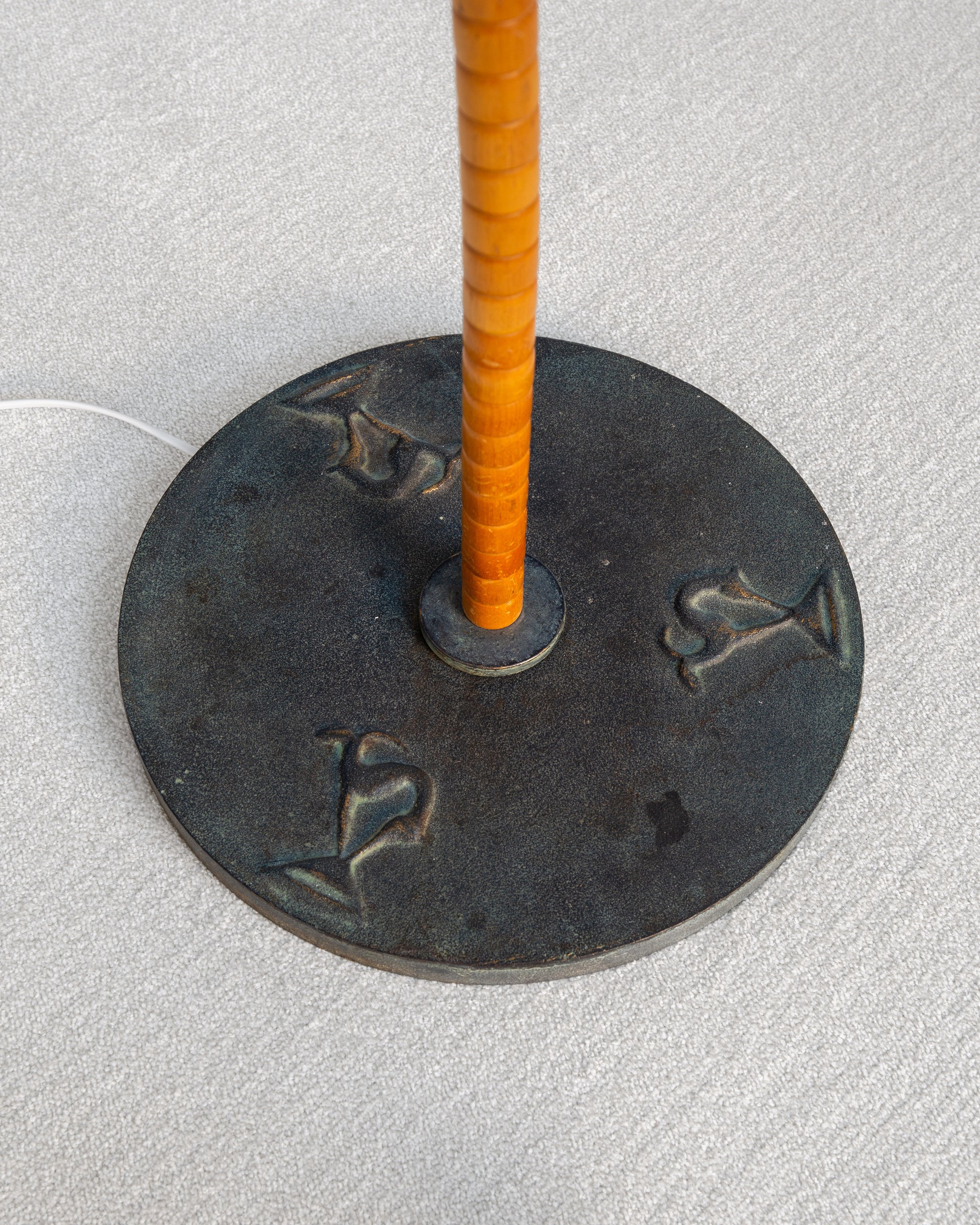 An exceptional floor lamp from 1930s Sweden, featuring a curved elm stem that rises from a cast iron base adorned with gazelle relief motifs. Paired with a pleated linen shade, the arching design makes it perfect for anchoring a seating area or adding sculptural presence to a room