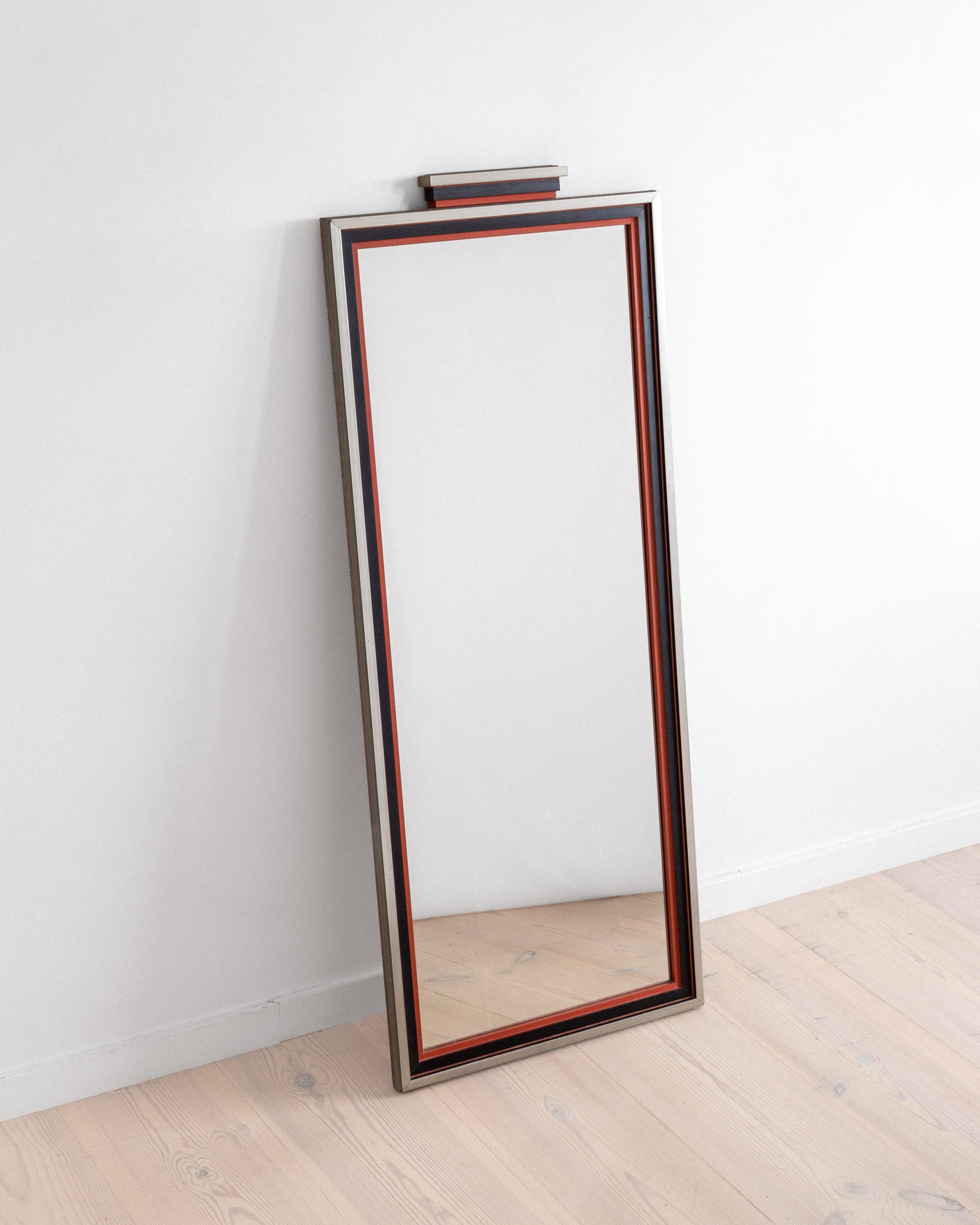 Rectangular mirror with a wooden frame painted in black, red, and silver, featuring a striking geometric, abstract crest at the top. Crafted by J.A. Edelhom in 1920s–30s Sweden, it retains the original maker's sticker.