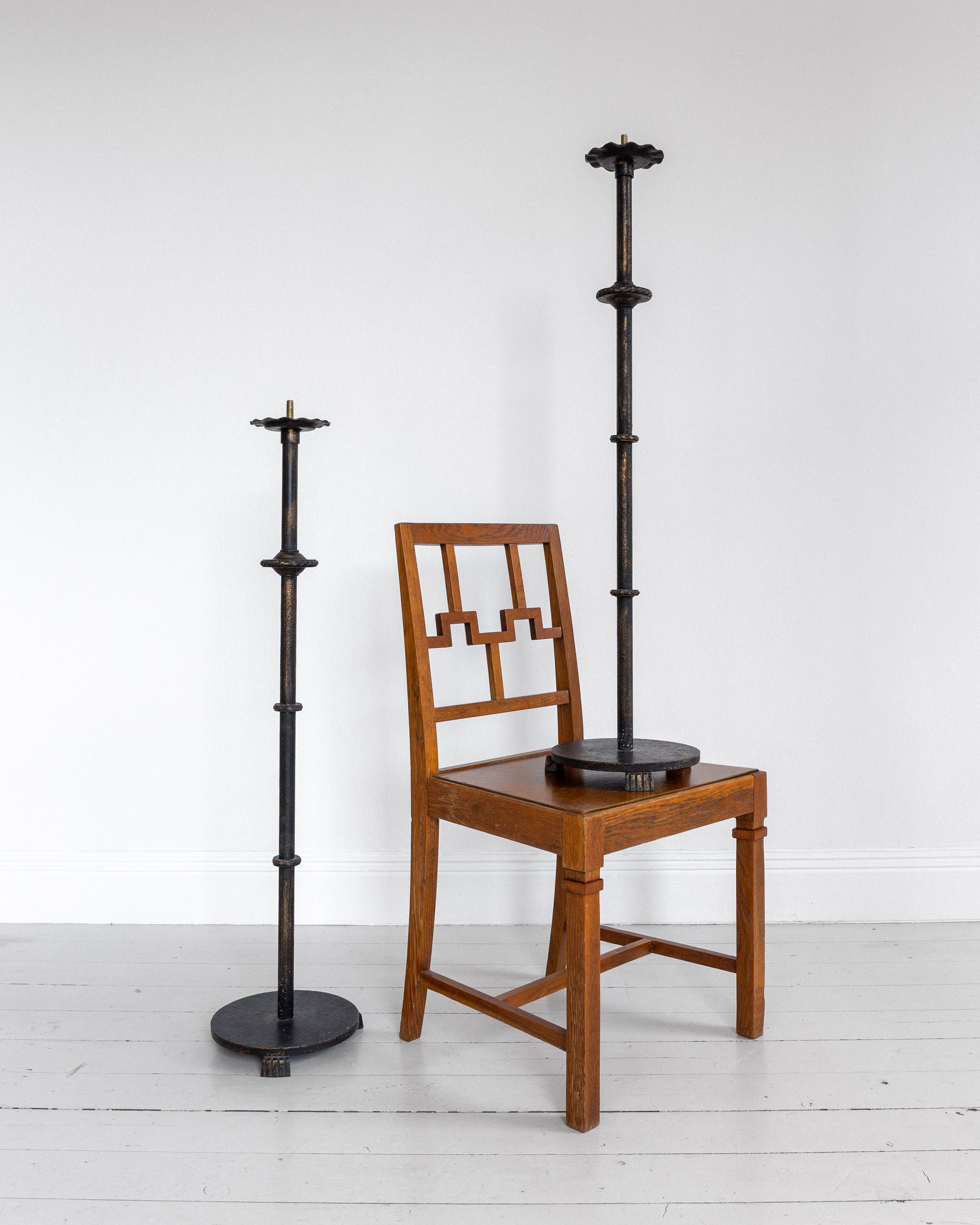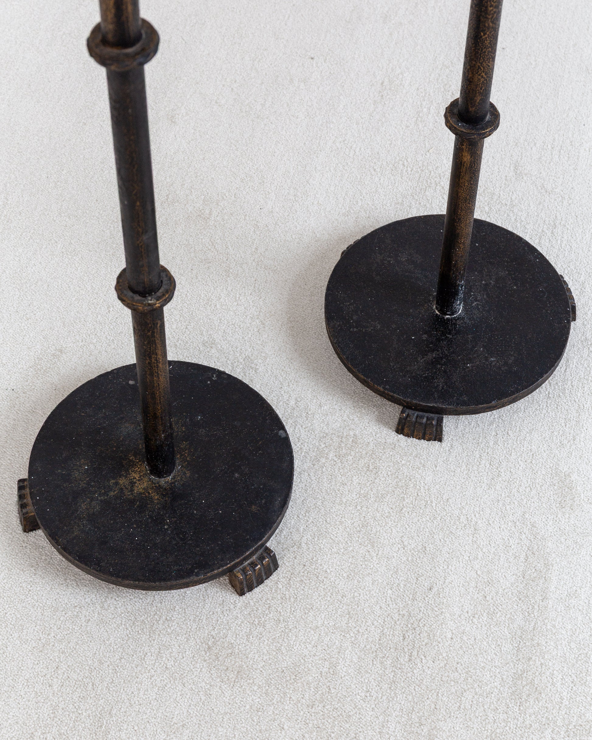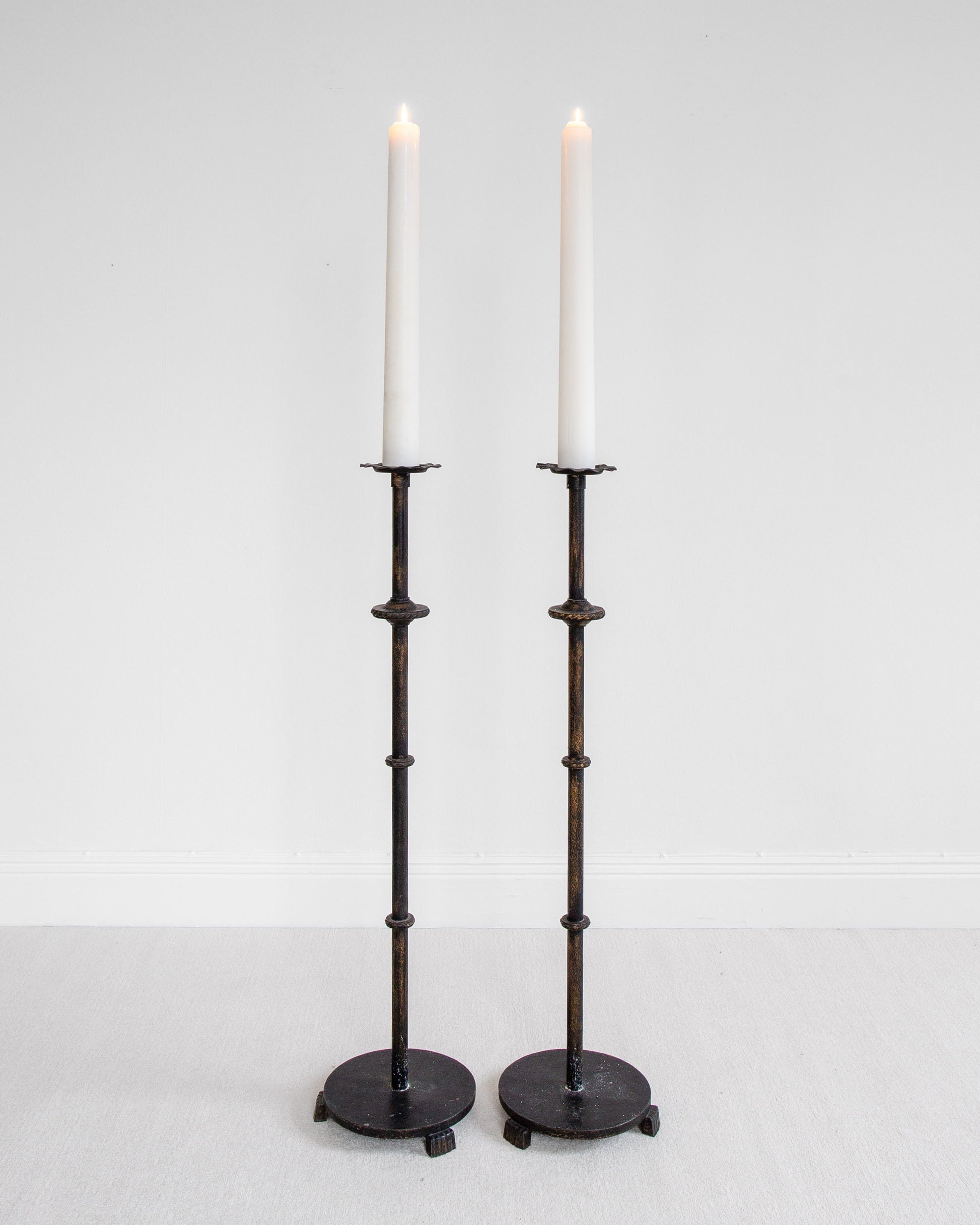 A pair of monumental floor candleholders in blackened cast iron by Swedish lighting manufacturer Böhlmarks. Documented in the company's original 1936 catalogue, these pieces retain the elegant design language of the earlier Swedish Grace period, even as Swedish decorative arts were shifting toward functionalist aesthetics.