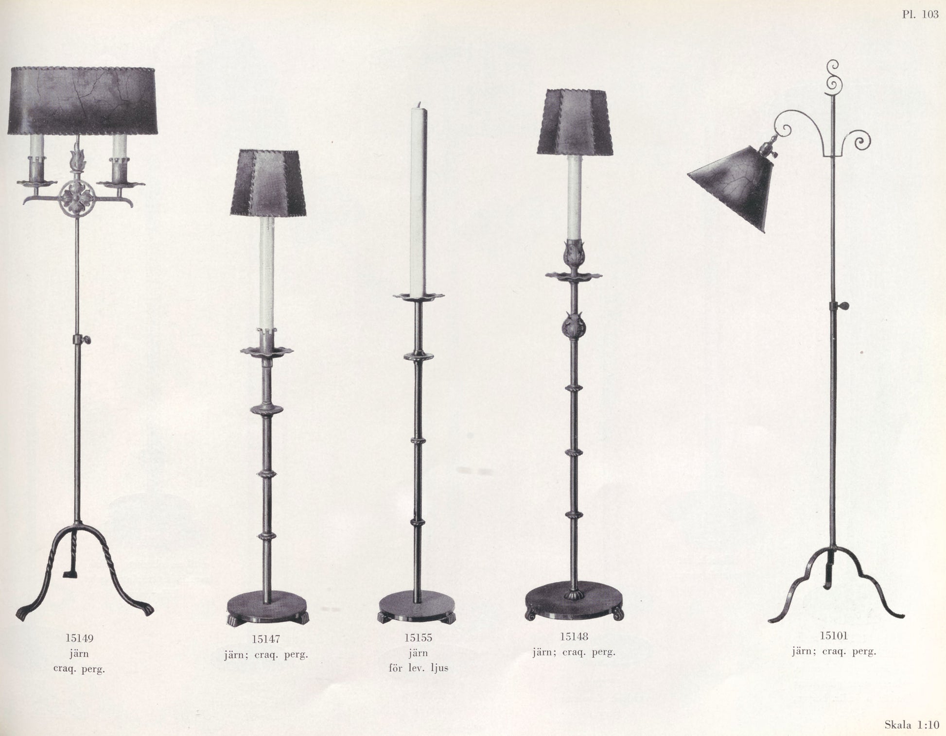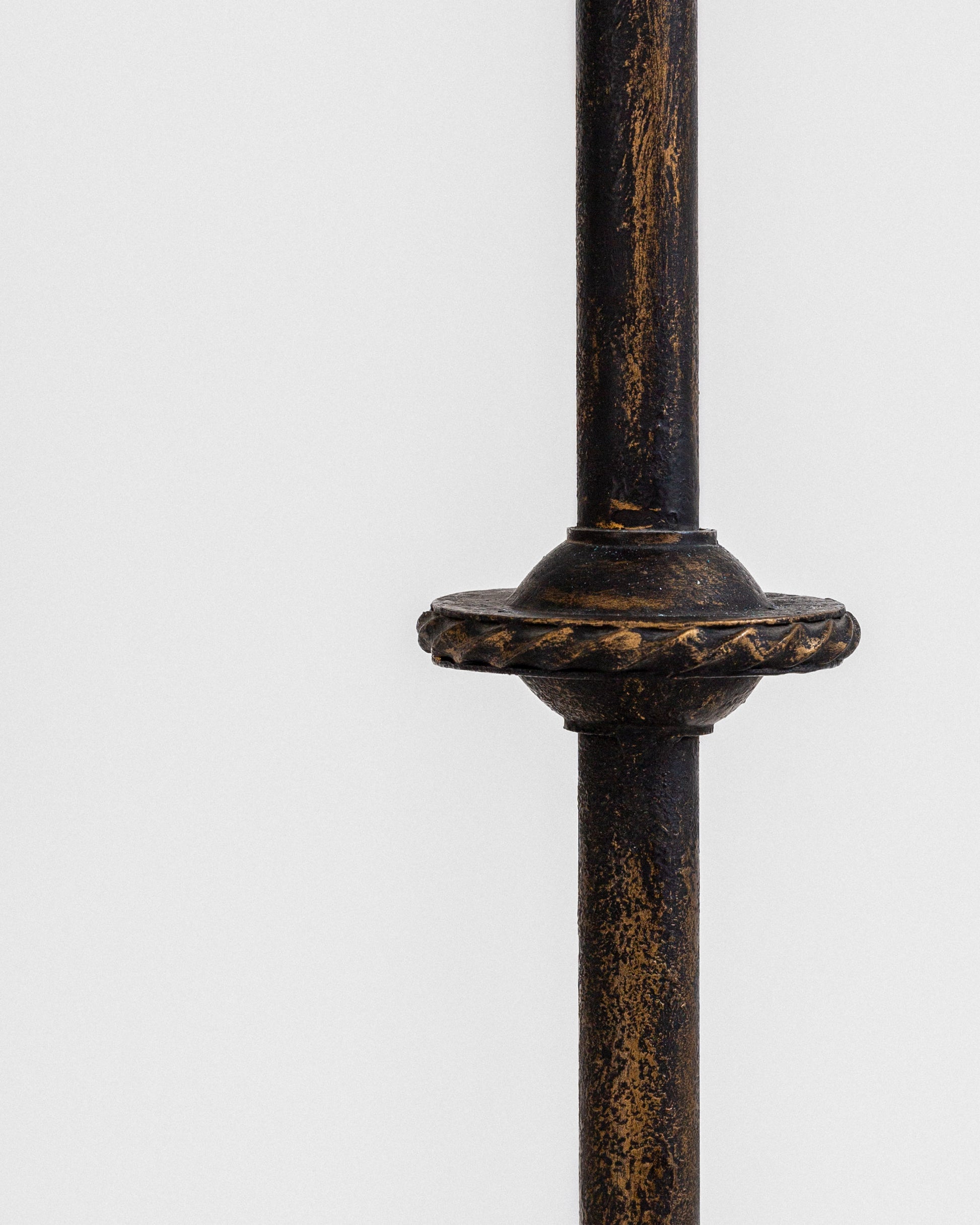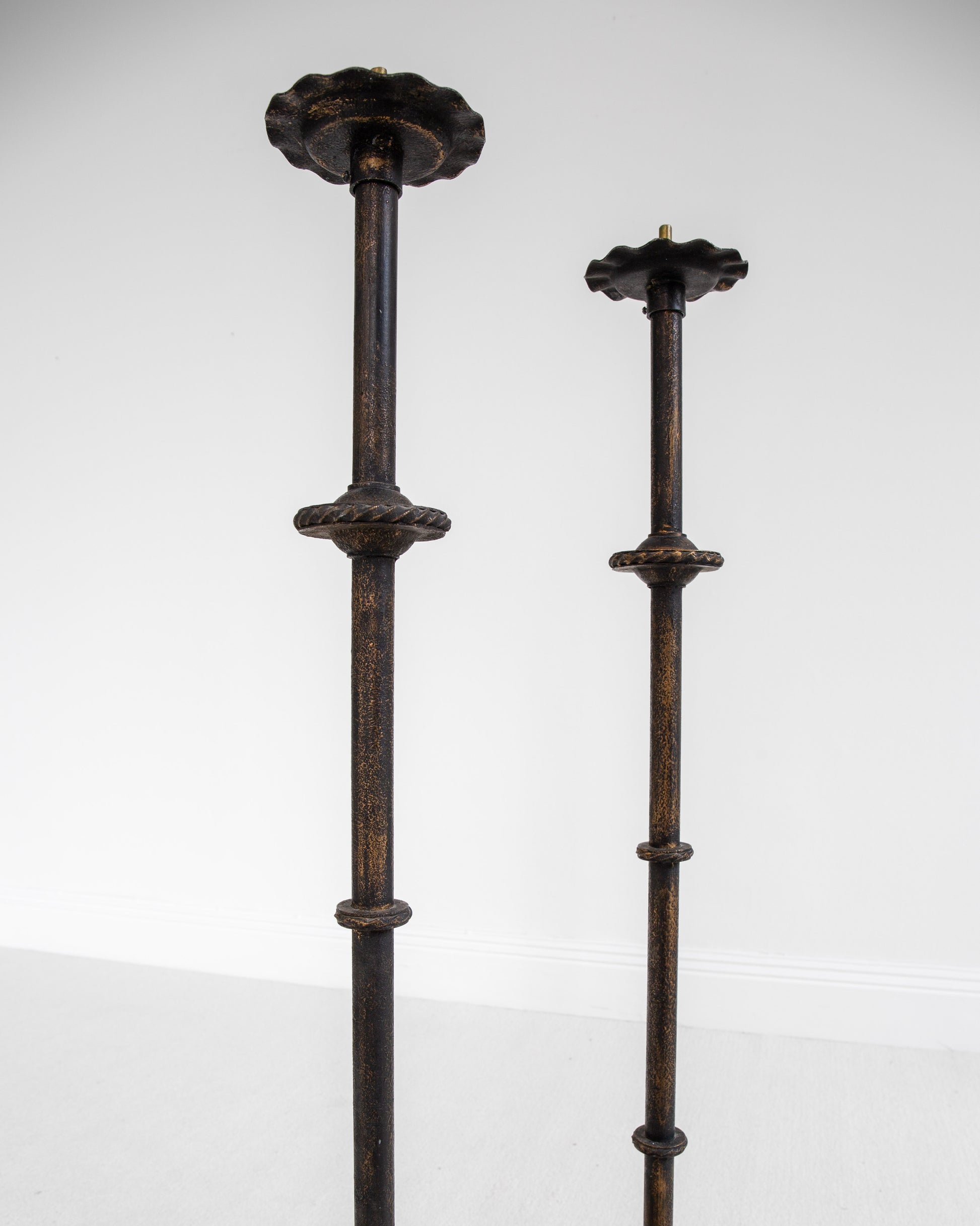 A pair of monumental floor candleholders in blackened cast iron by Swedish lighting manufacturer Böhlmarks. Documented in the company's original 1936 catalogue, these pieces retain the elegant design language of the earlier Swedish Grace period, even as Swedish decorative arts were shifting toward functionalist aesthetics.