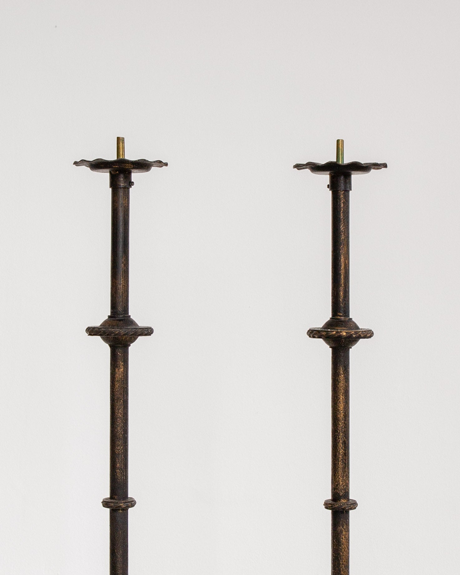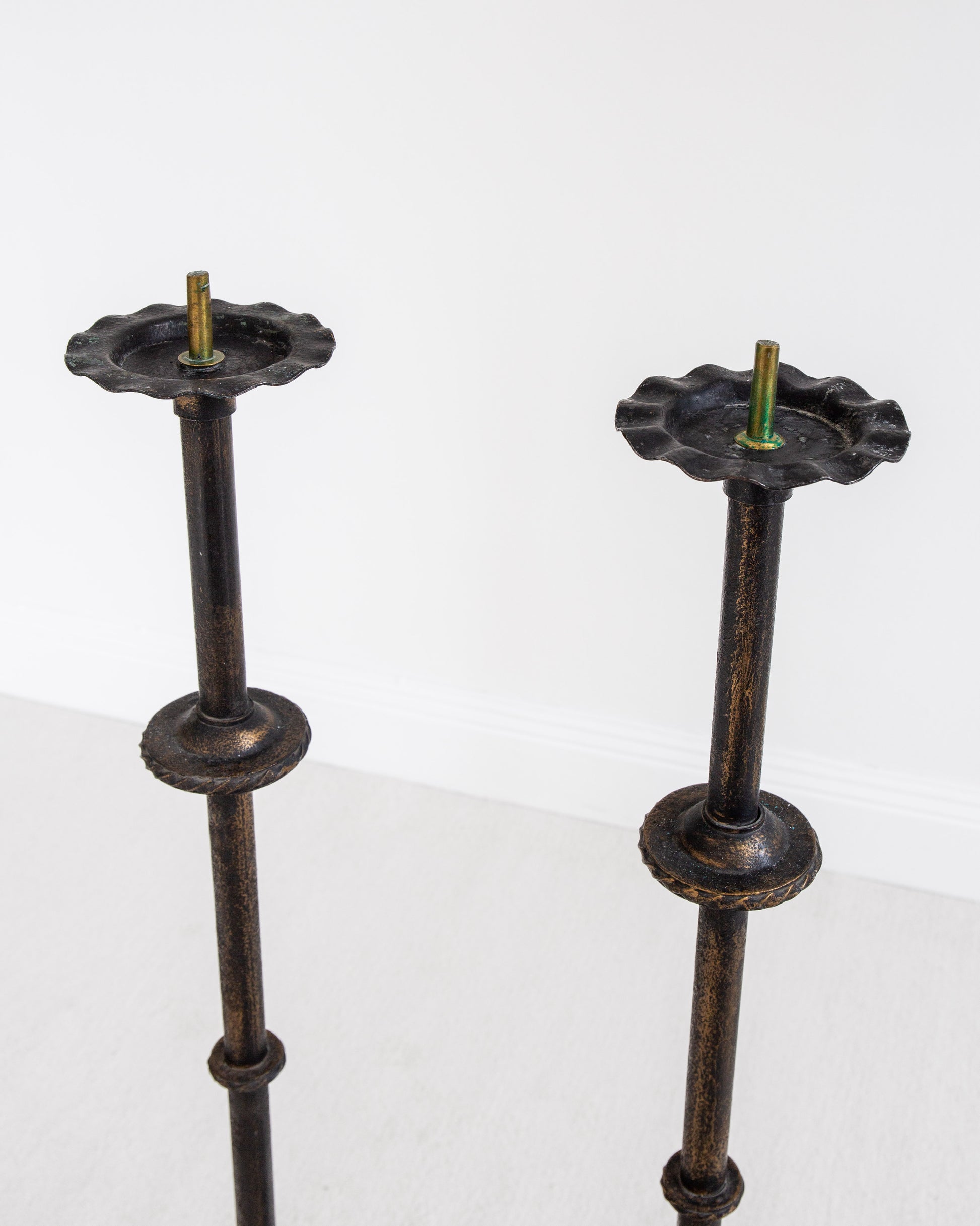 The tall stems feature rhythmic turned detailing and rest on circular bases with characteristic Böhlmarks decorative feet. Original brass candle spikes remain intact, designed to accommodate large altar candles with center holes (Pictured with 60 cm tall, 6 cm diameter candles for scale).
