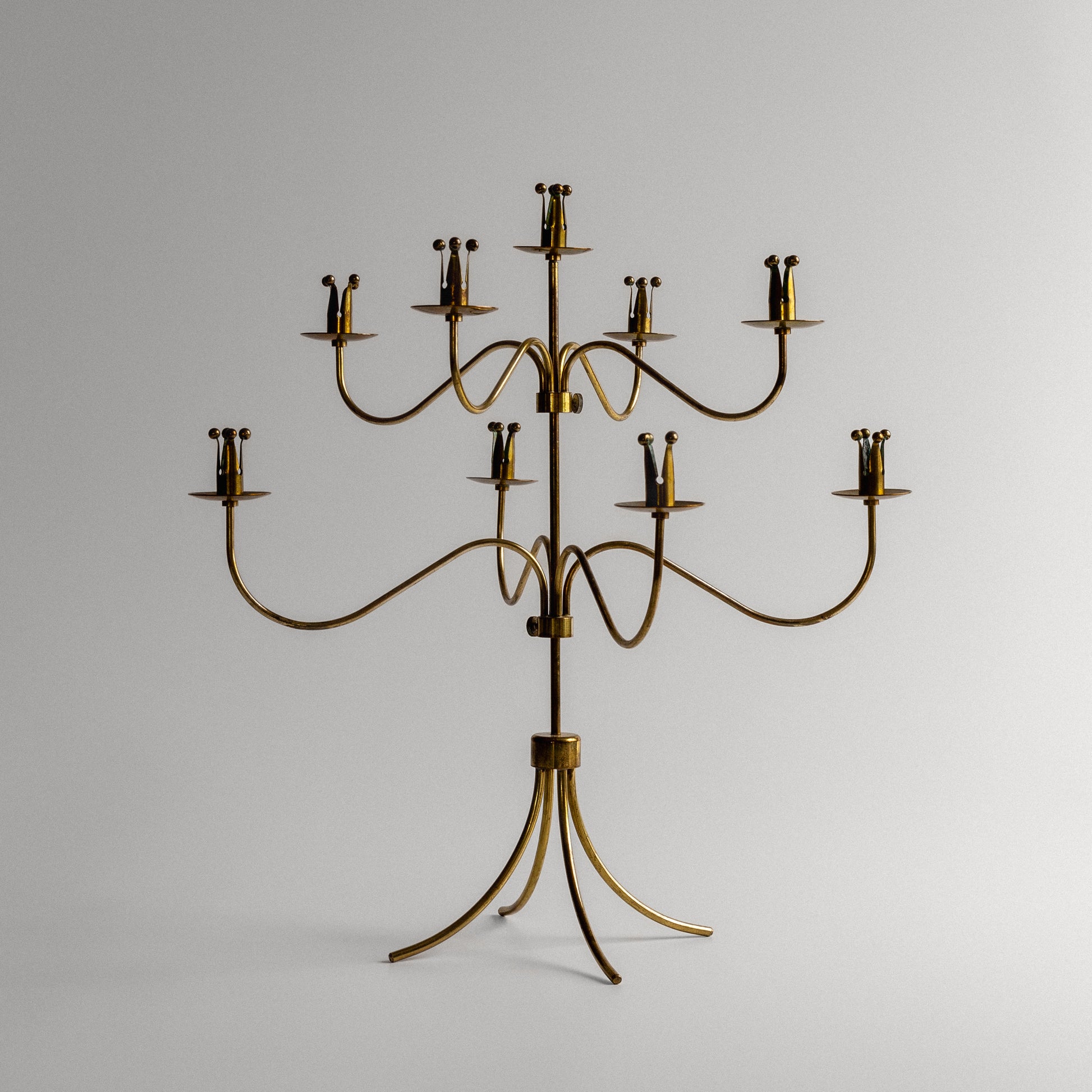 A nine-armed brass candelabra with adjustable arms, made for small candles. Most likely produced by Ystad Metall in the 1950's.