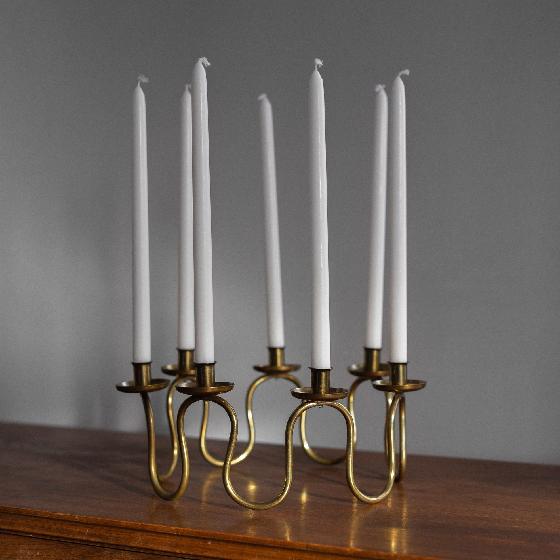 An elegant brass candle holder, crafted in the 1950s by artist-blacksmith Lars Holmström of Arvika, Sweden, beautifully embodies the cozy, refined aesthetic of Scandinavian mid-20th century design. With its seven candle holders, it serves as a perfect centerpiece, adding warmth and charm to any setting, especially during holidays or special occasions.