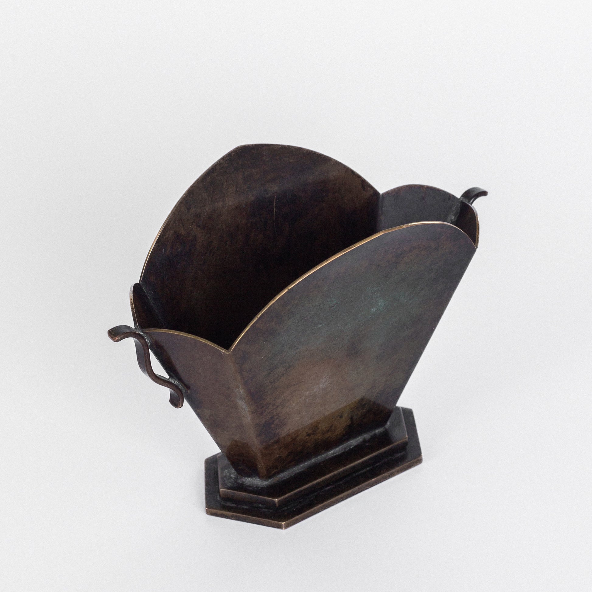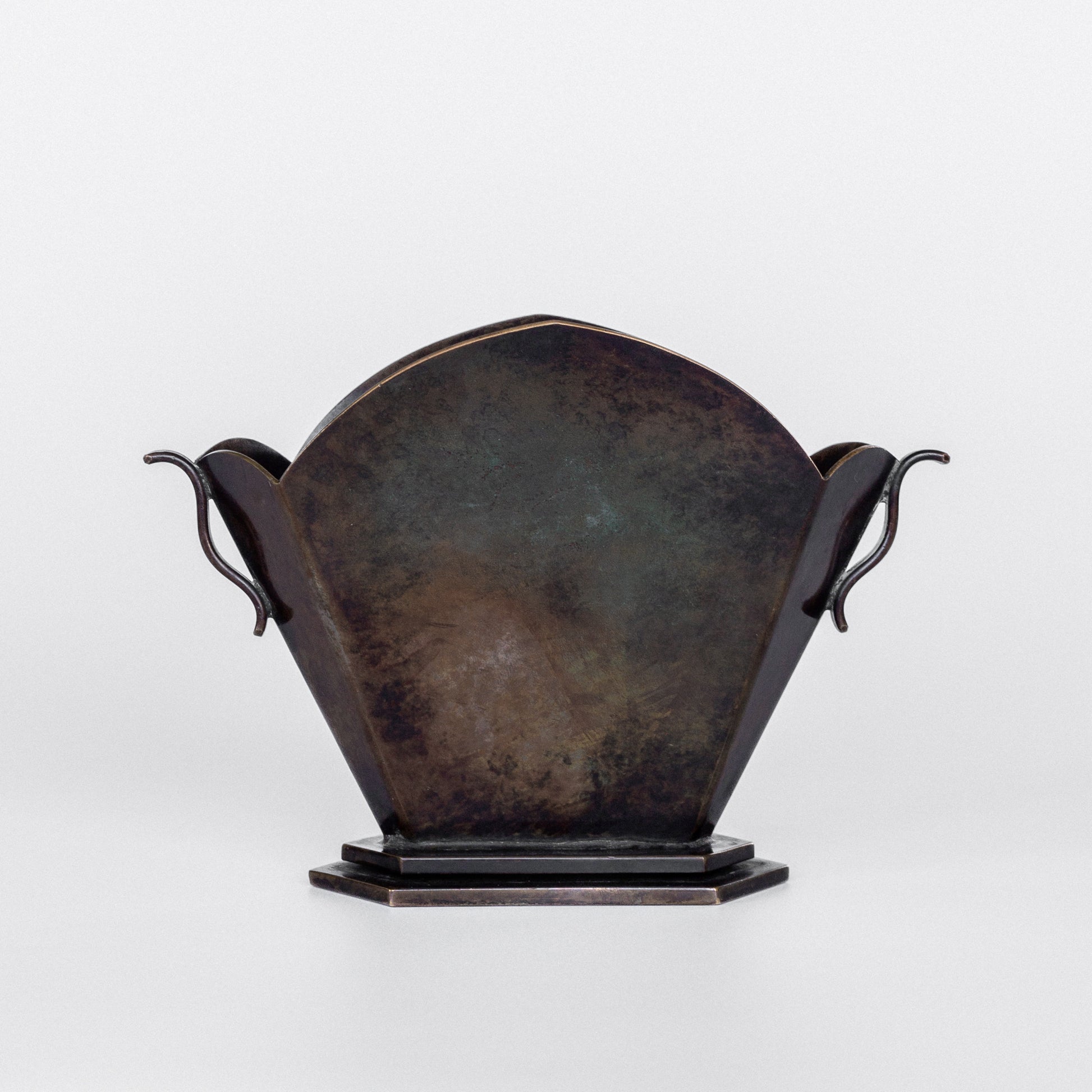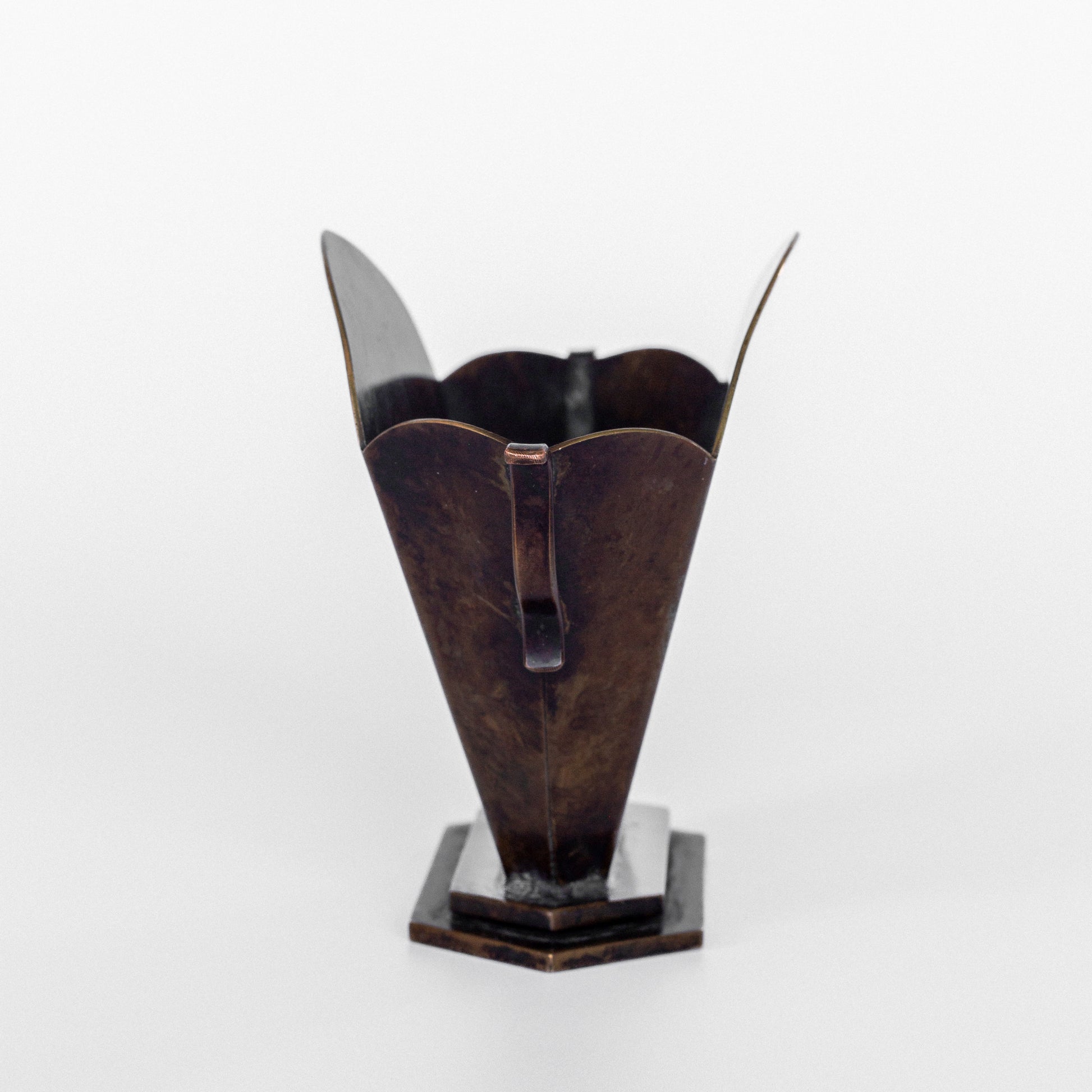 Small vase designed and produced by Holger Fridericias for his own company HF, Denmark. Made of patinated bronze that features colors of green, copper, brown and black. A delicate and highly collectible piece of Scandinavian Art Deco.