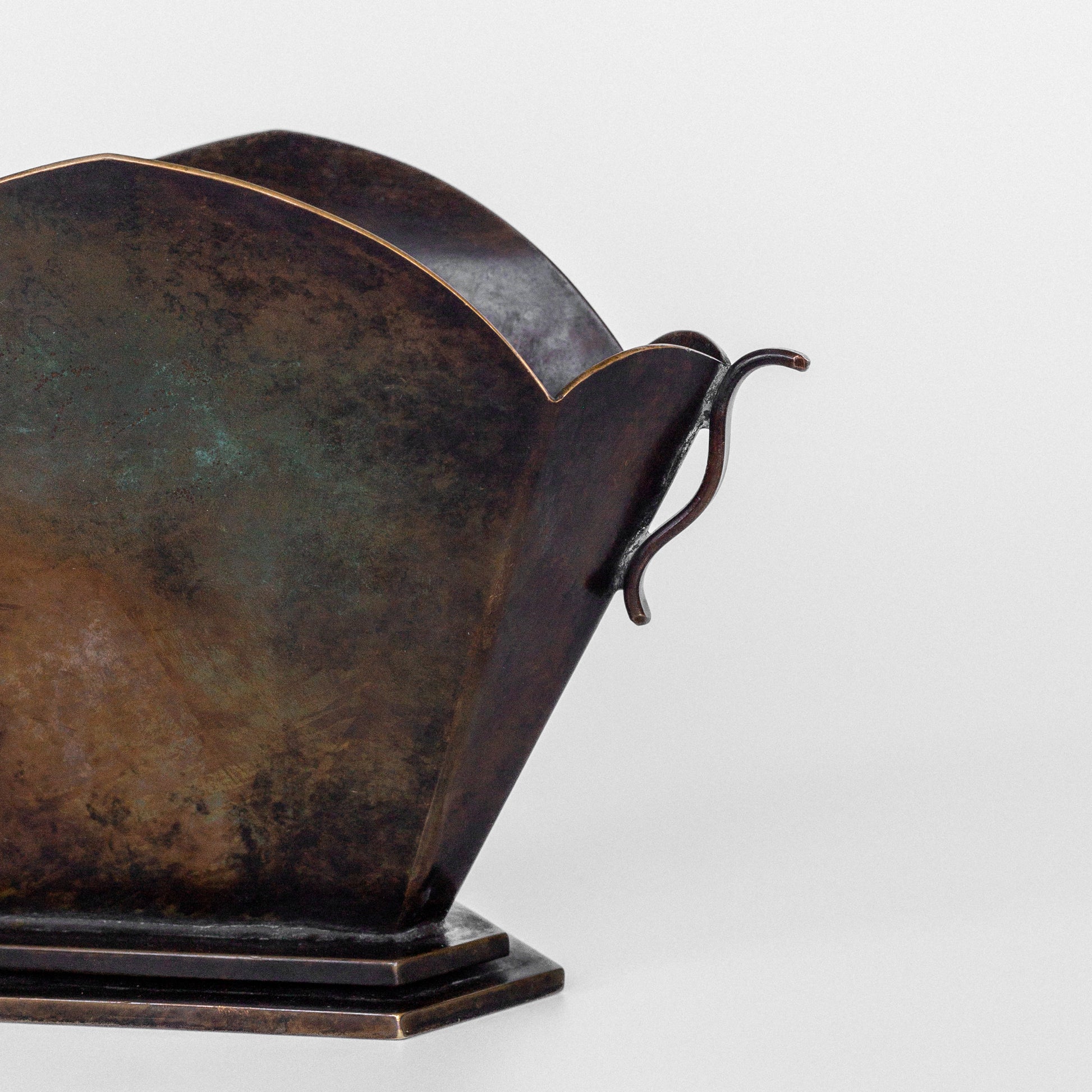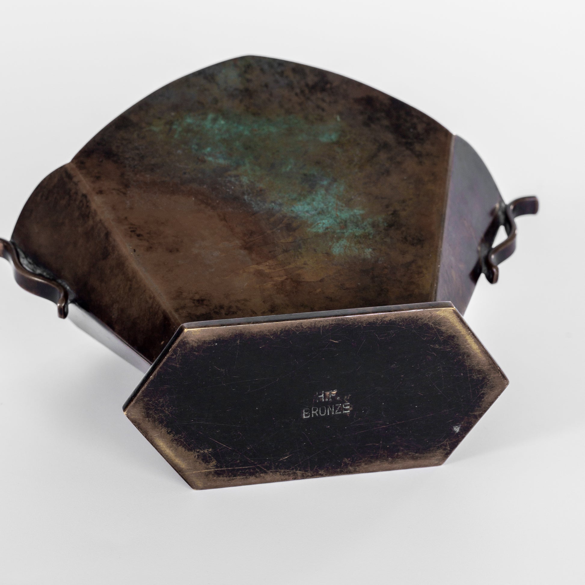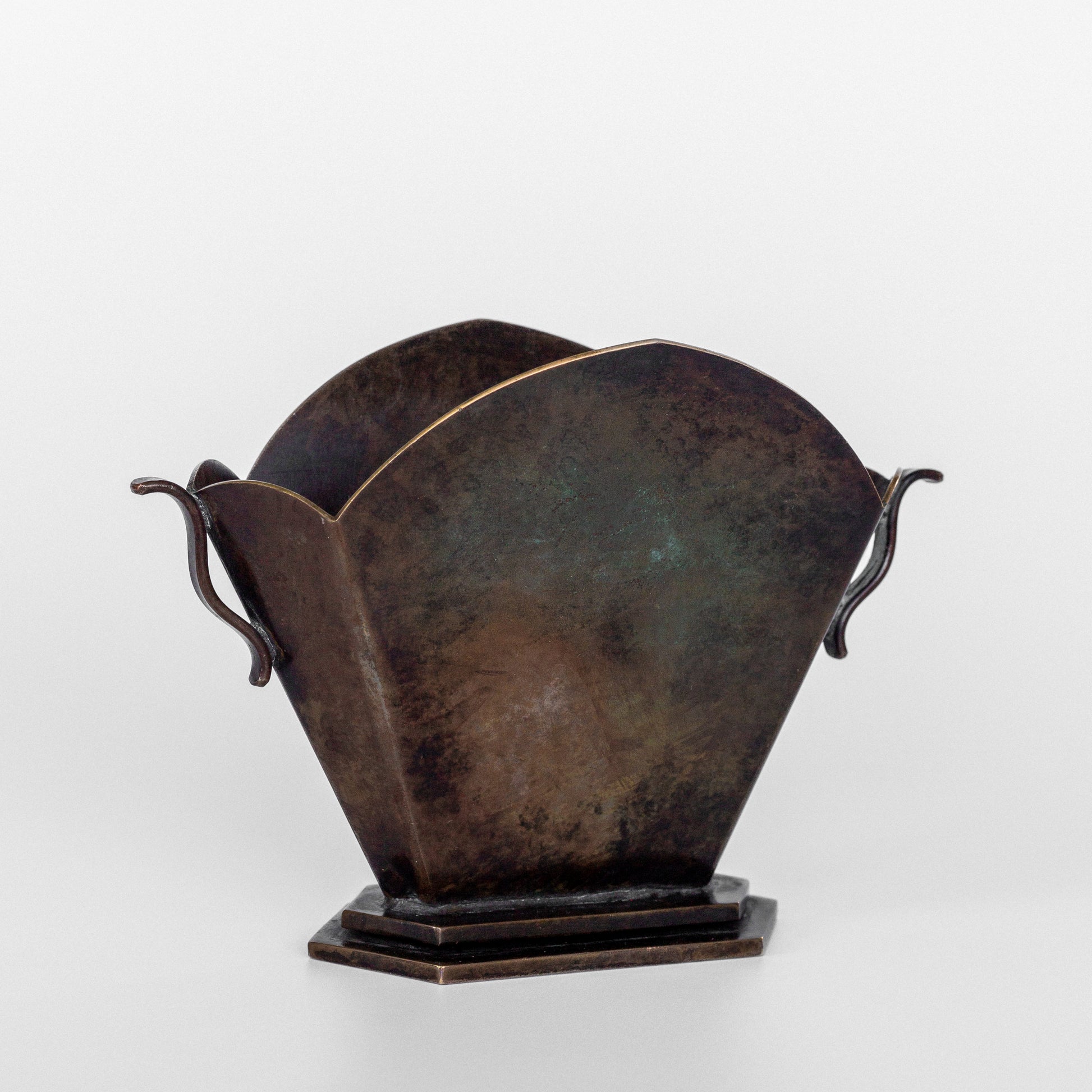 Small vase designed and produced by Holger Fridericias for his own company HF, Denmark. Made of patinated bronze that features colors of green, copper, brown and black. A delicate and highly collectible piece of Scandinavian Art Deco.