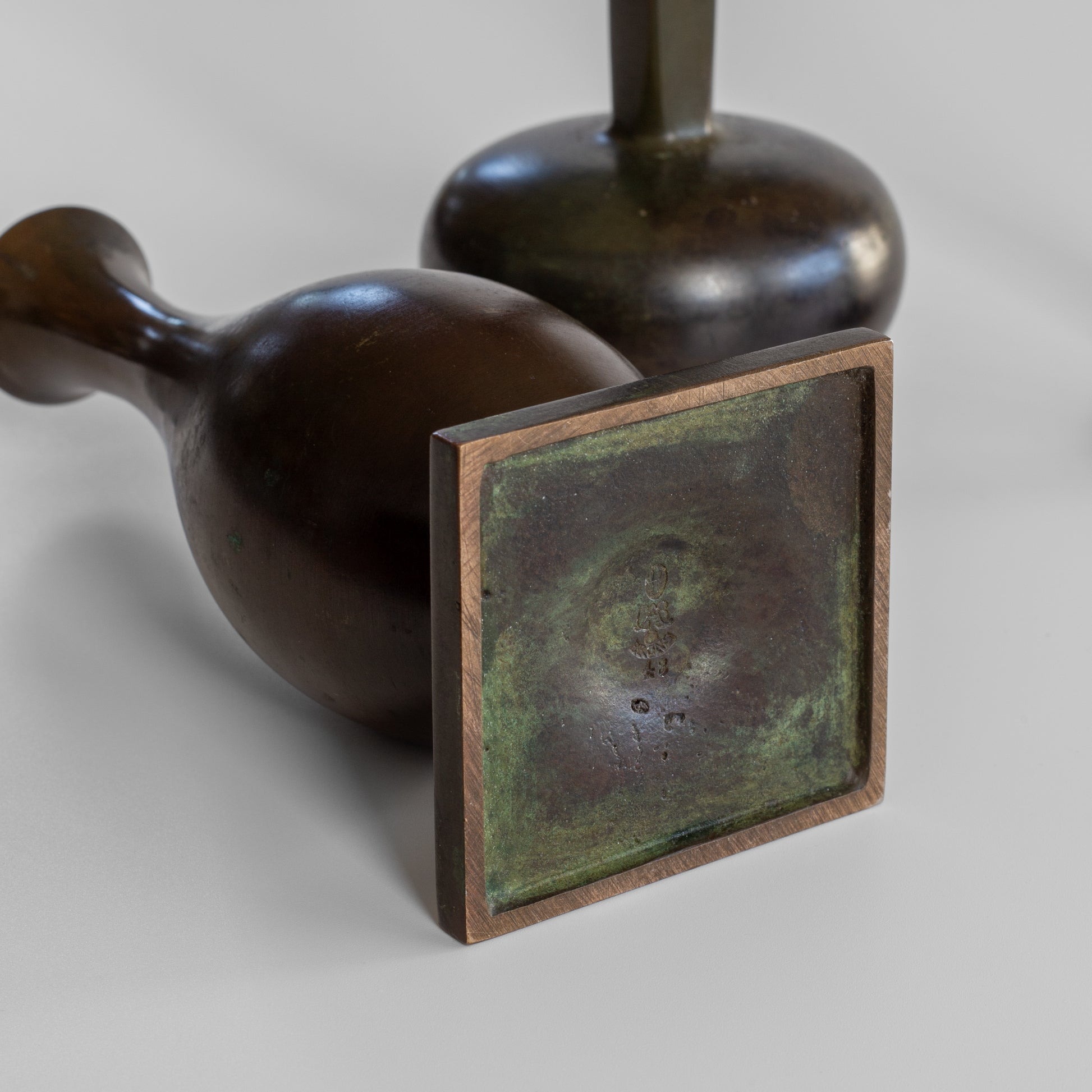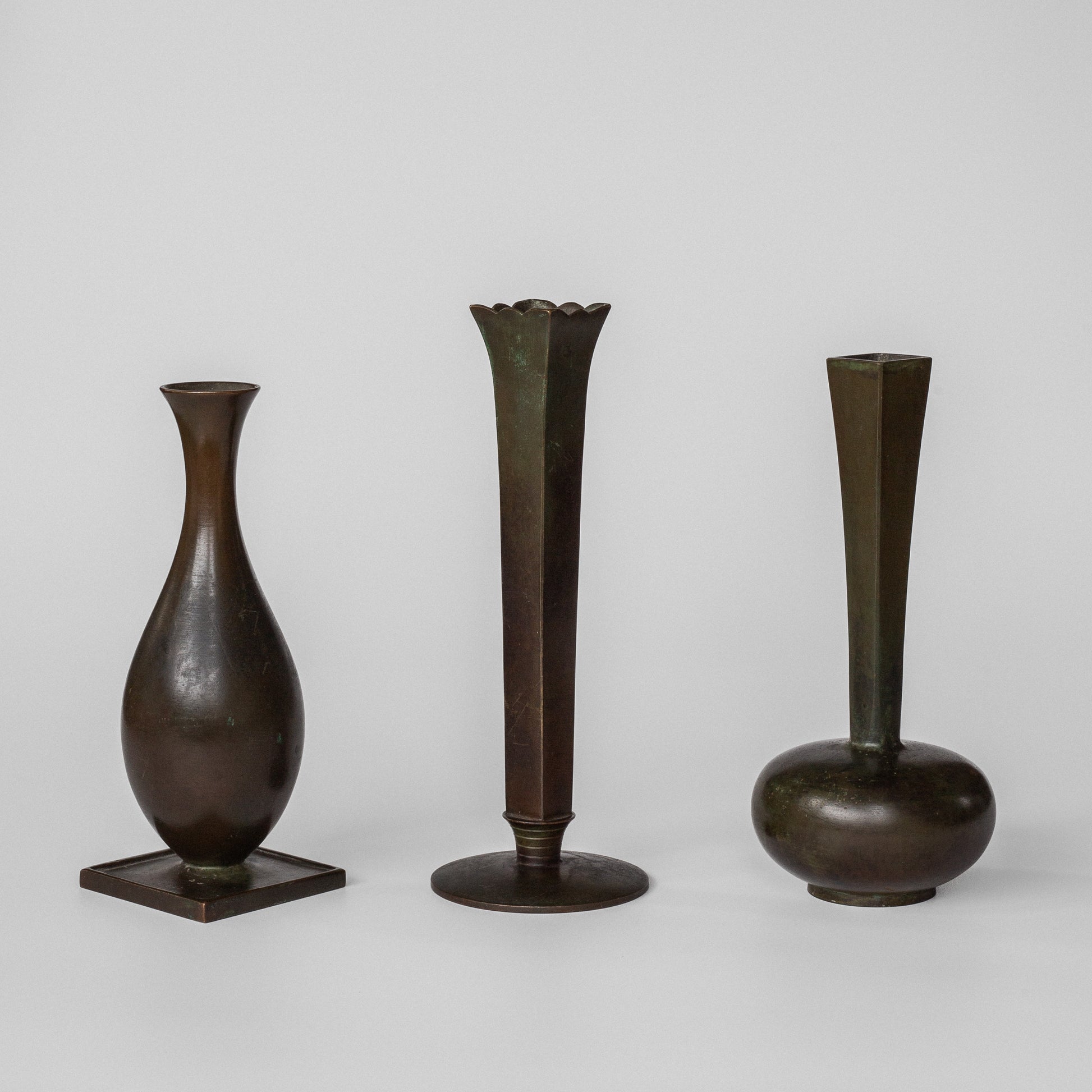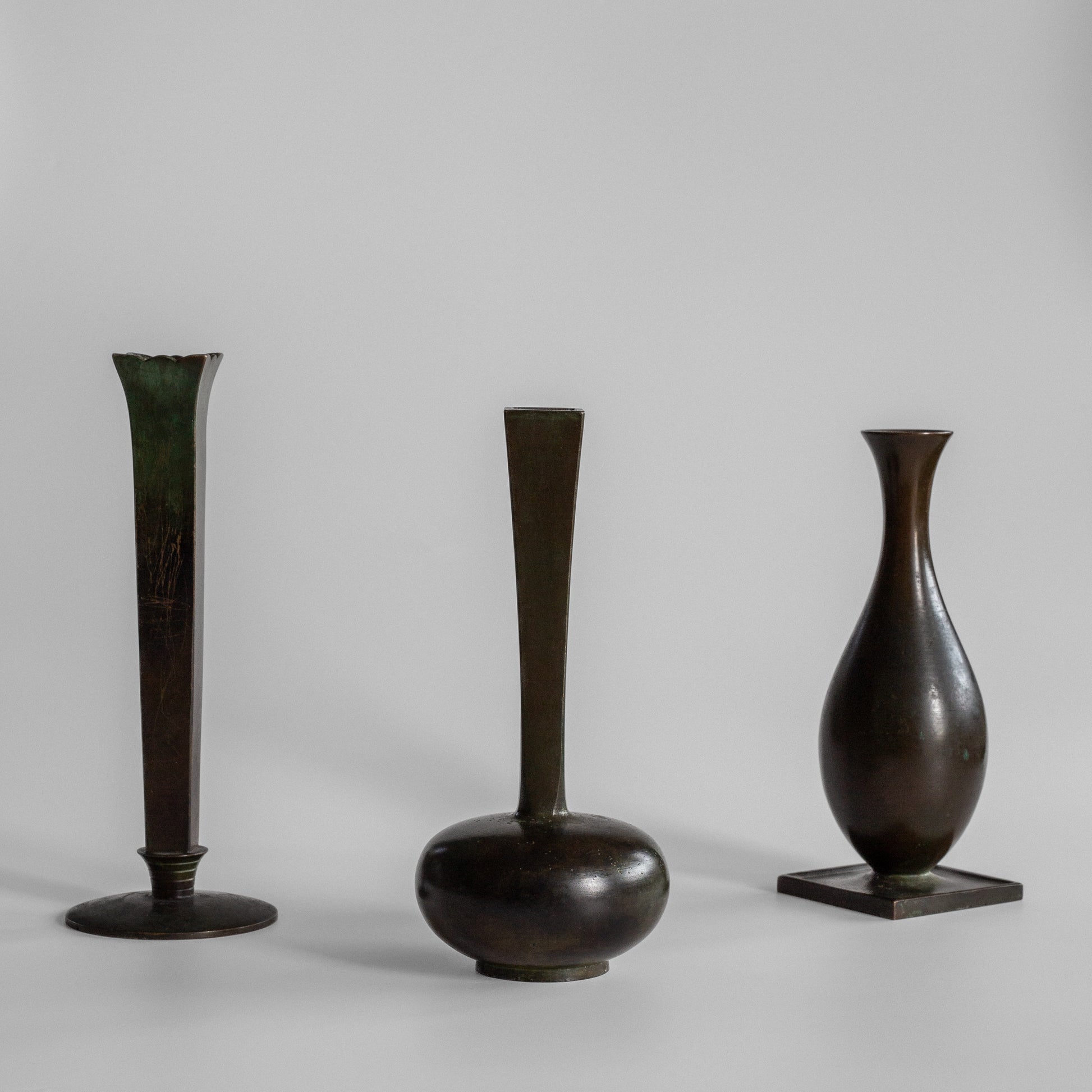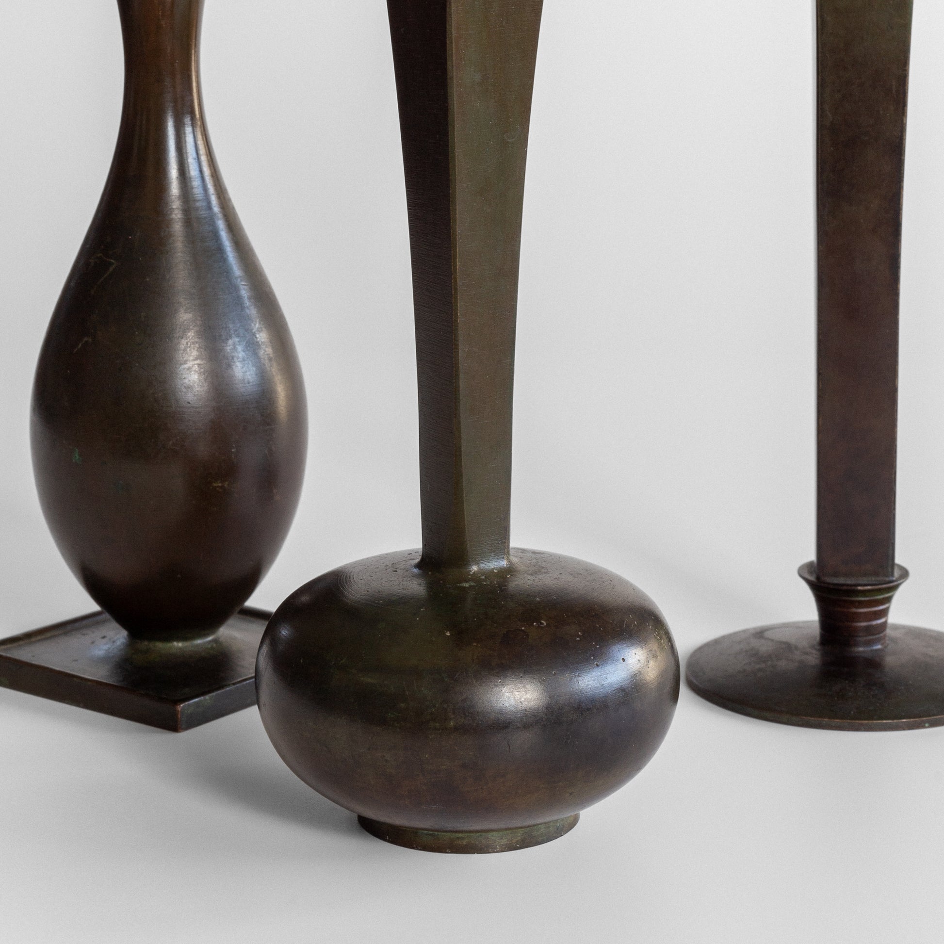 These vases are characterized by their clean lines, minimal ornamentation, and dark bronze patina, typical of the restrained elegance in Scandinavian design during the early 20th century. The craftsmanship shows a keen attention to both form and proportion, with each vase offering a distinct silhouette while complementing one another as a group.