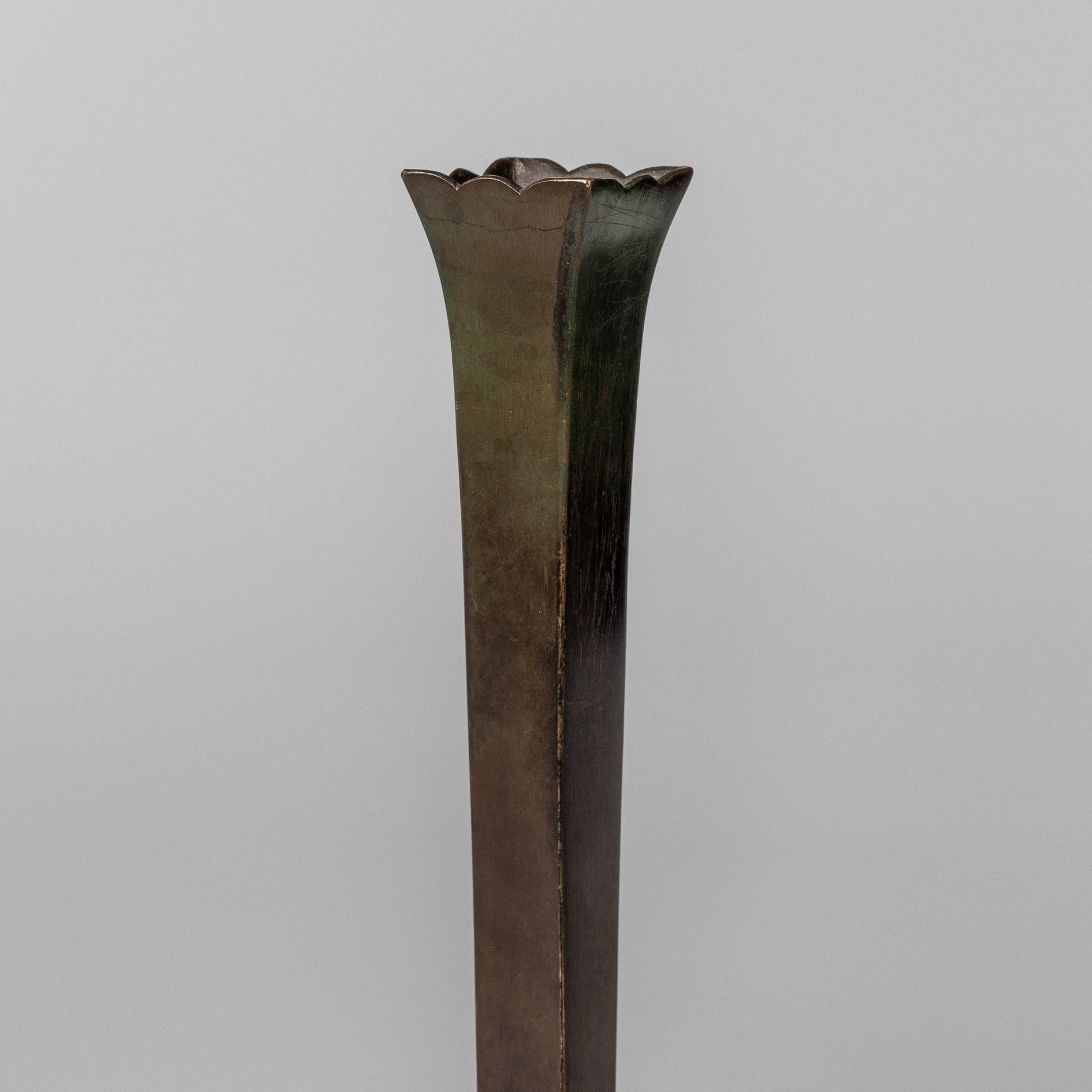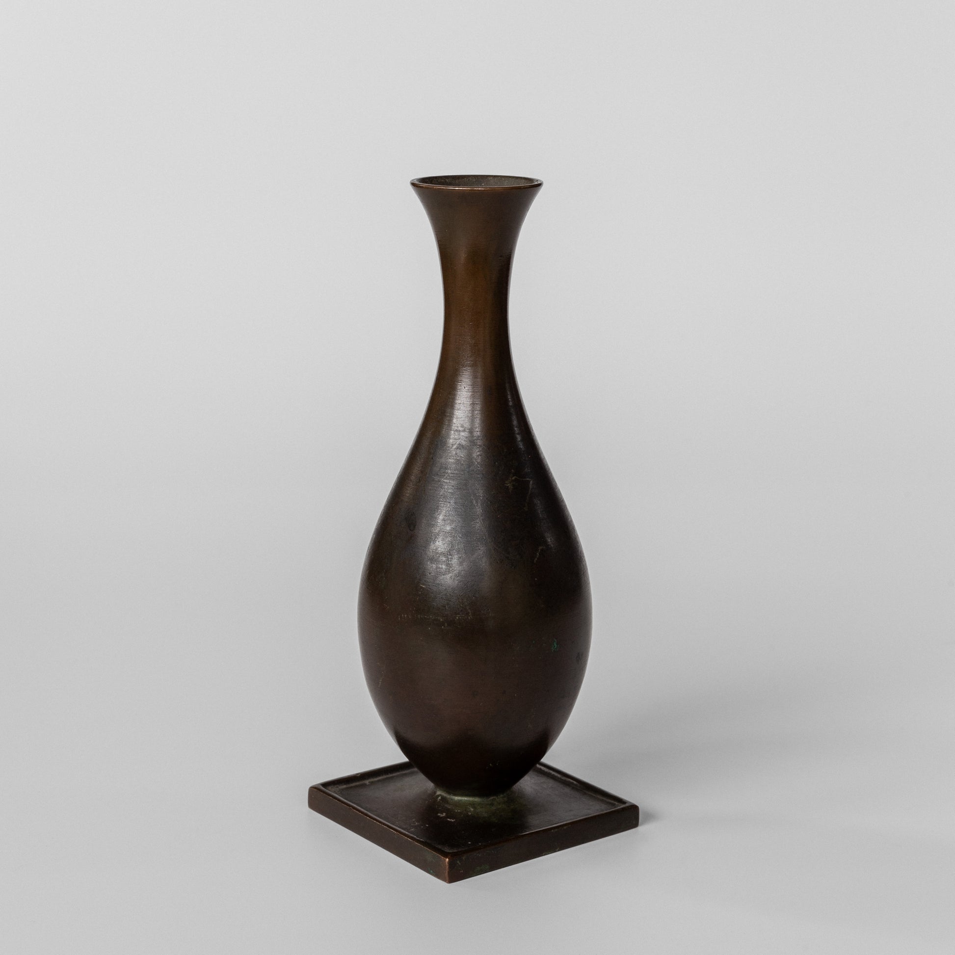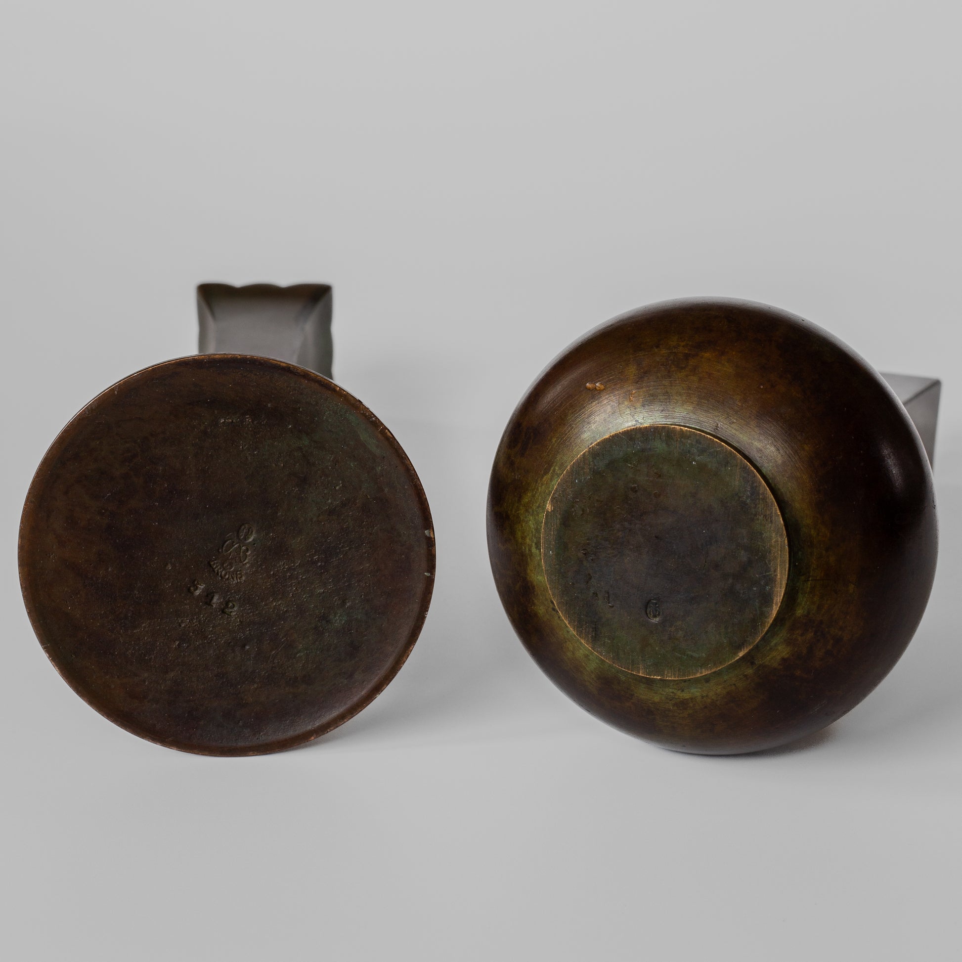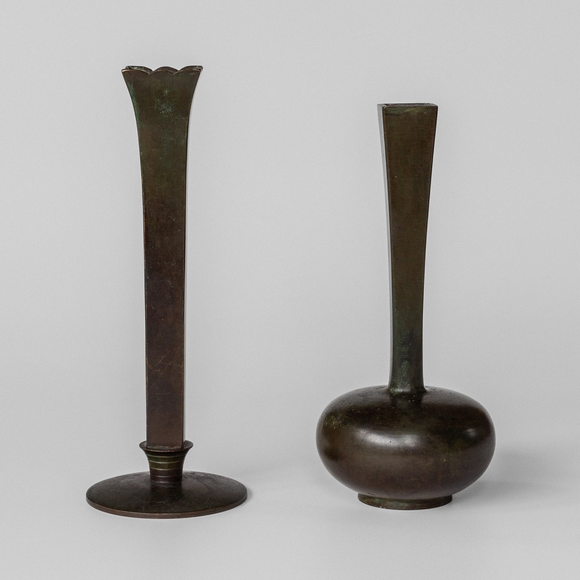 These vases are characterized by their clean lines, minimal ornamentation, and dark bronze patina, typical of the restrained elegance in Scandinavian design during the early 20th century. The craftsmanship shows a keen attention to both form and proportion, with each vase offering a distinct silhouette while complementing one another as a group.