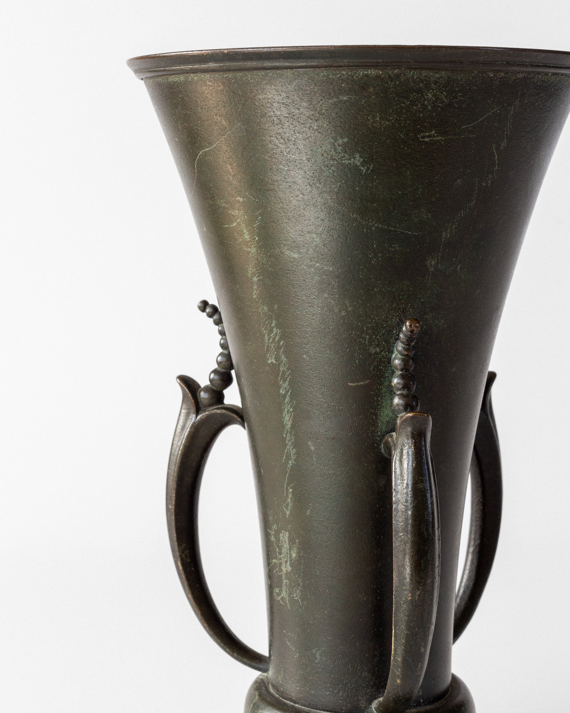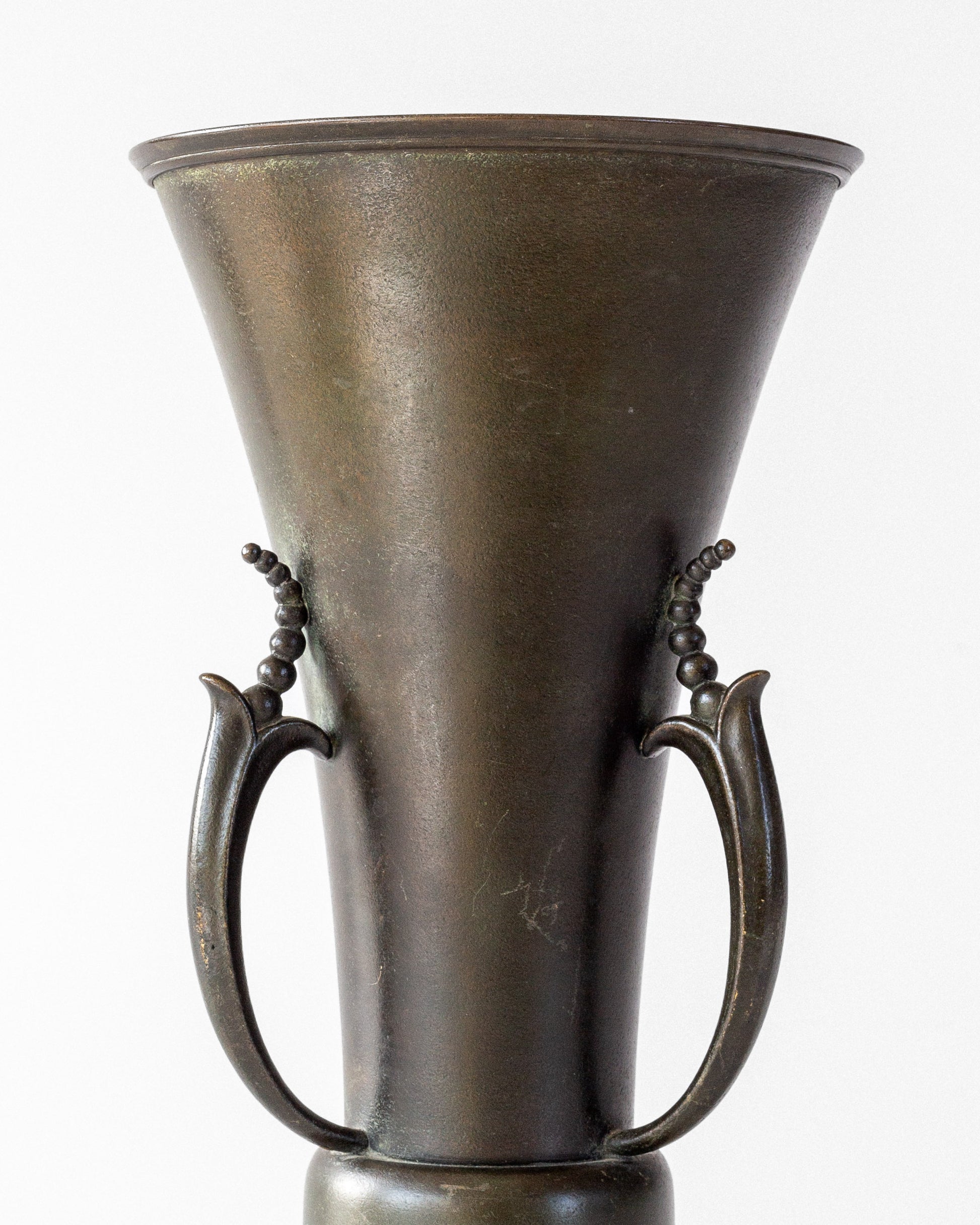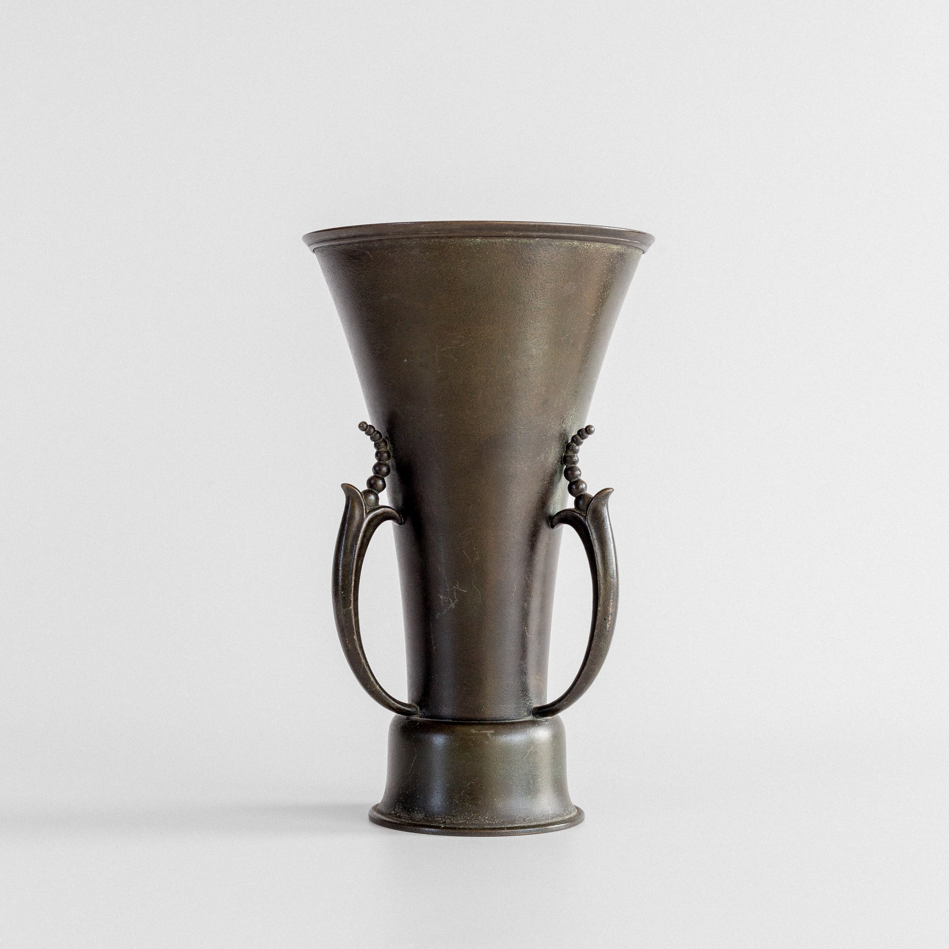 Rare Swedish Grace bronze vase by Ystad Metall, made in the 1930s. Elegant conical form with decorative curved handles featuring bead-like ornamentation. Rich green-brown and black patina. Features "Ystad Brons" maker's mark. The vase bears hardly noticeable inscriptions along the foot, dating 1938, as it was presented as a commemorative award.