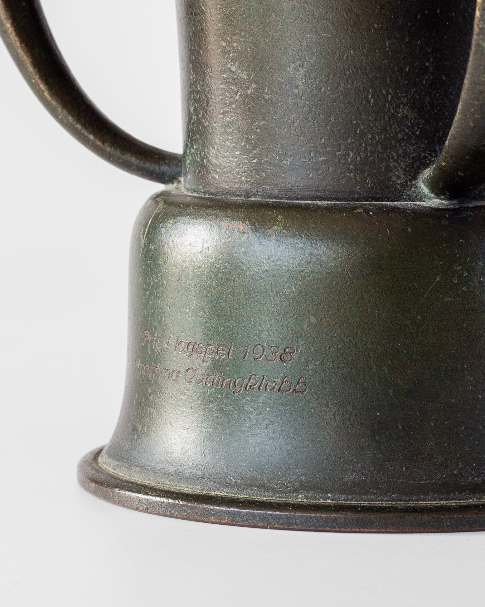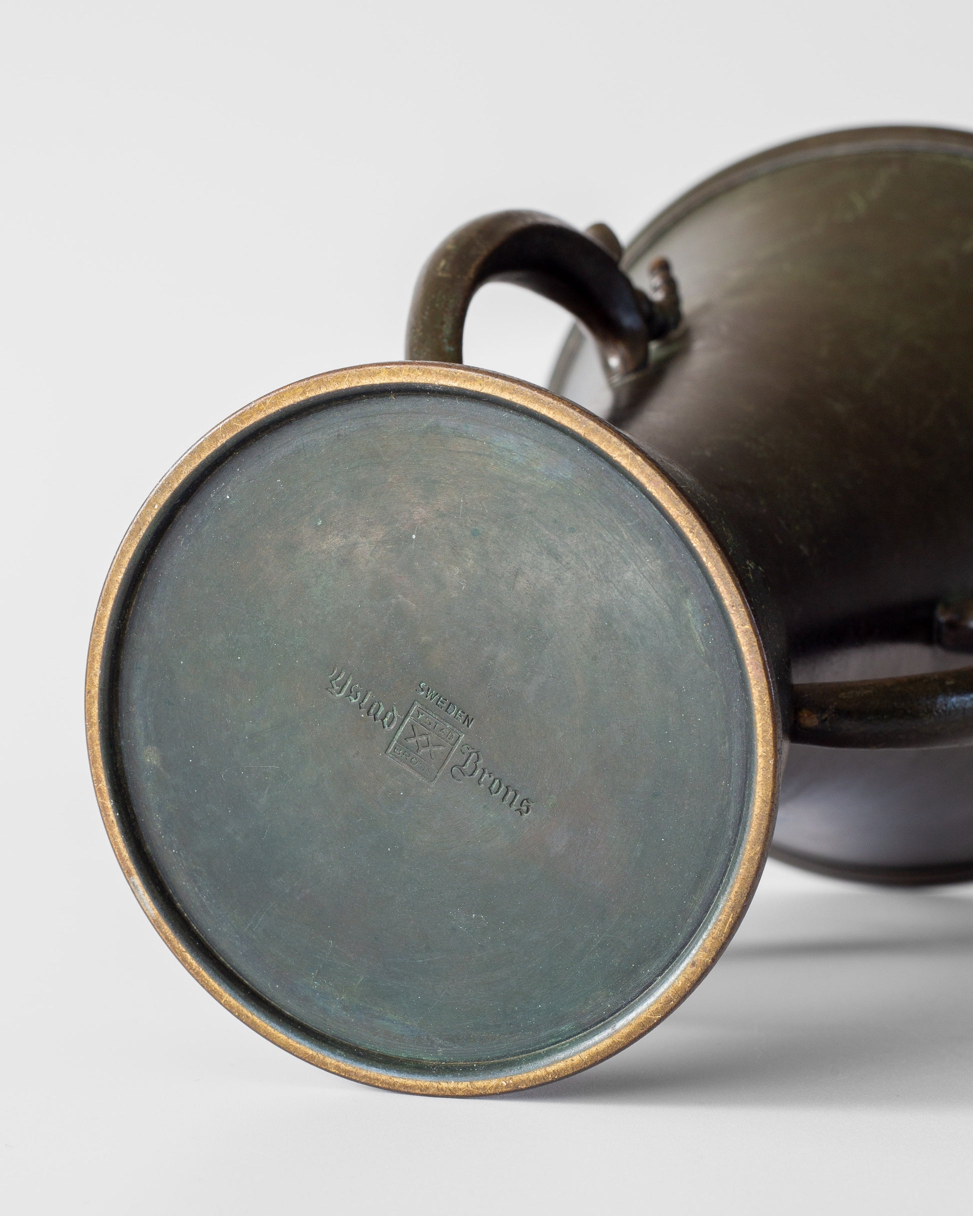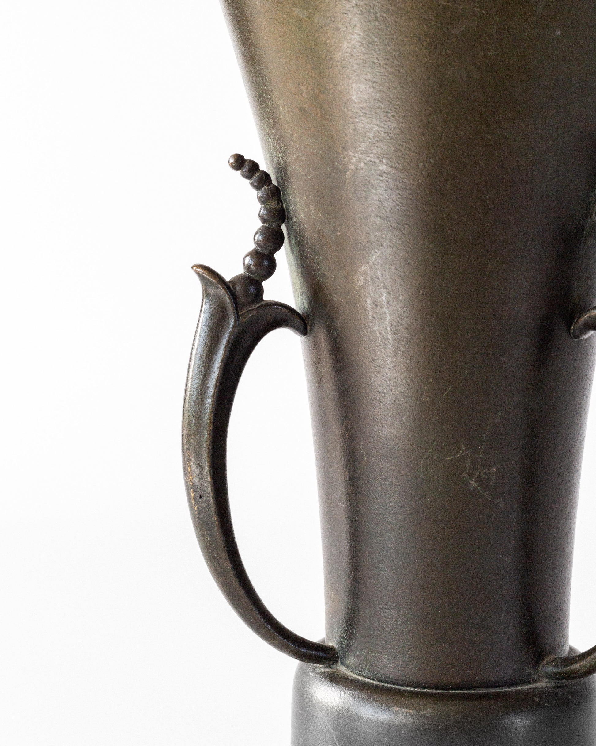 Rare Swedish Grace bronze vase by Ystad Metall, made in the 1930s. Elegant conical form with decorative curved handles featuring bead-like ornamentation. Rich green-brown and black patina. Features "Ystad Brons" maker's mark. The vase bears hardly noticeable inscriptions along the foot, dating 1938, as it was presented as a commemorative award.