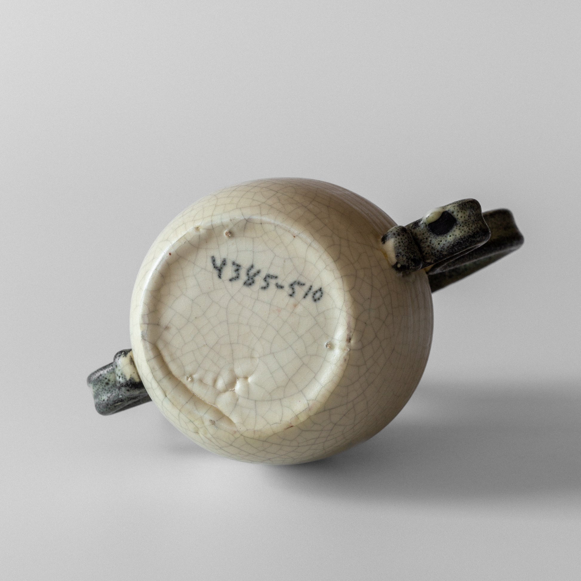 A charming vase adorned with a decorative handle, crafted in the 1940s by Eva Jancke-Björk for Bo Fajans, Sweden. Made of earthenware, the piece showcases a beige crackle glaze complemented by dark green, almost black, handles. This playful design is a delicate and highly collectible example of Swedish studio pottery.