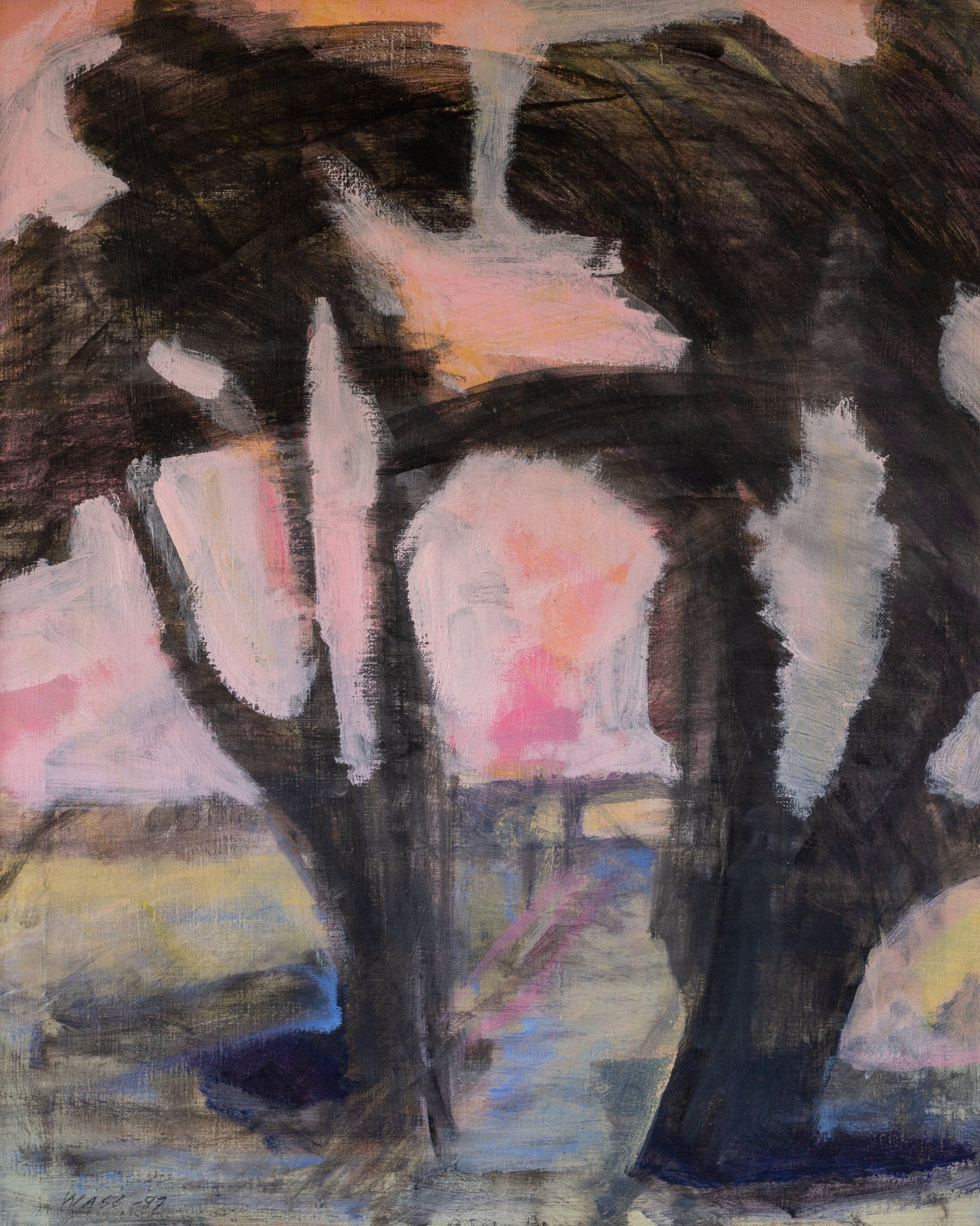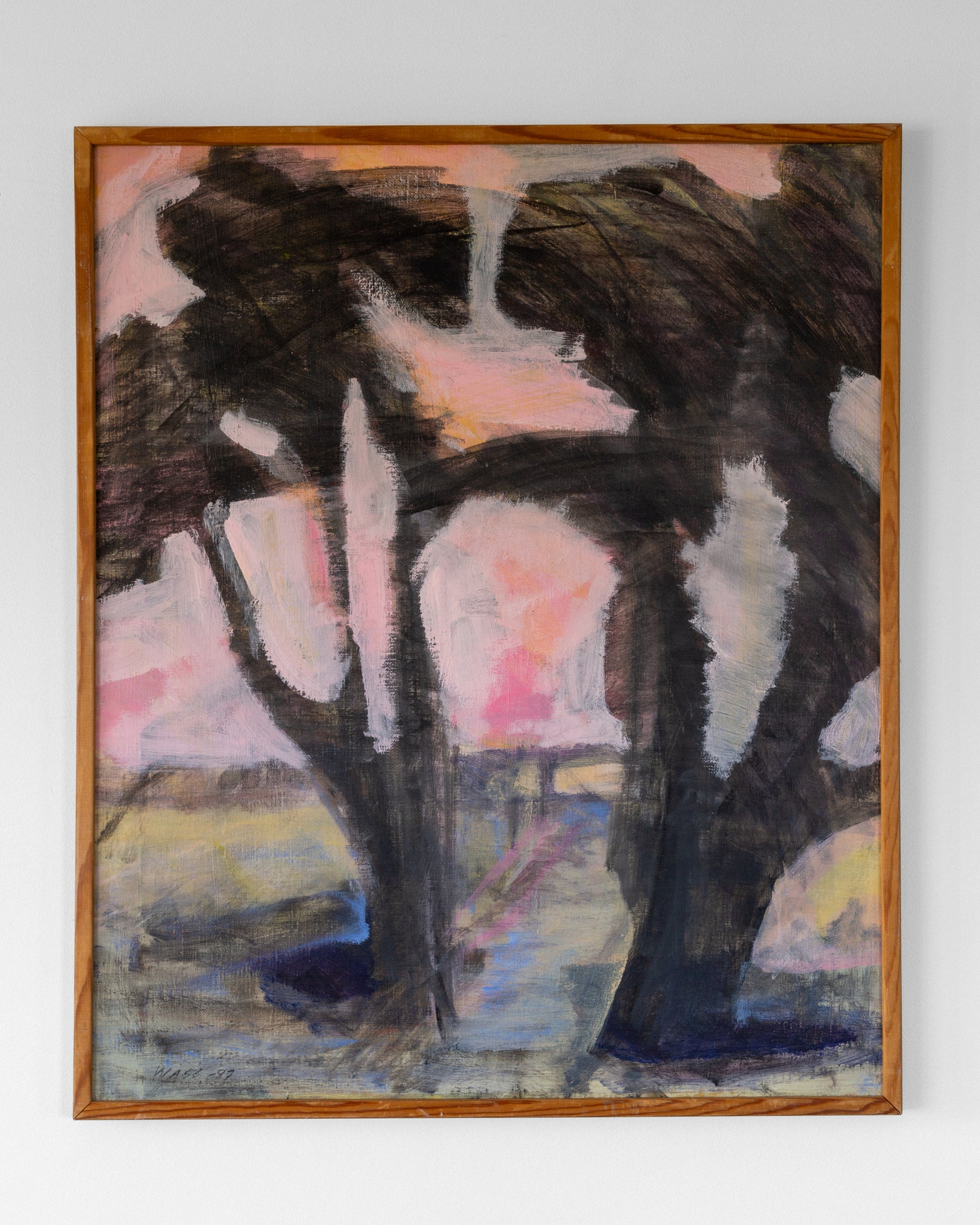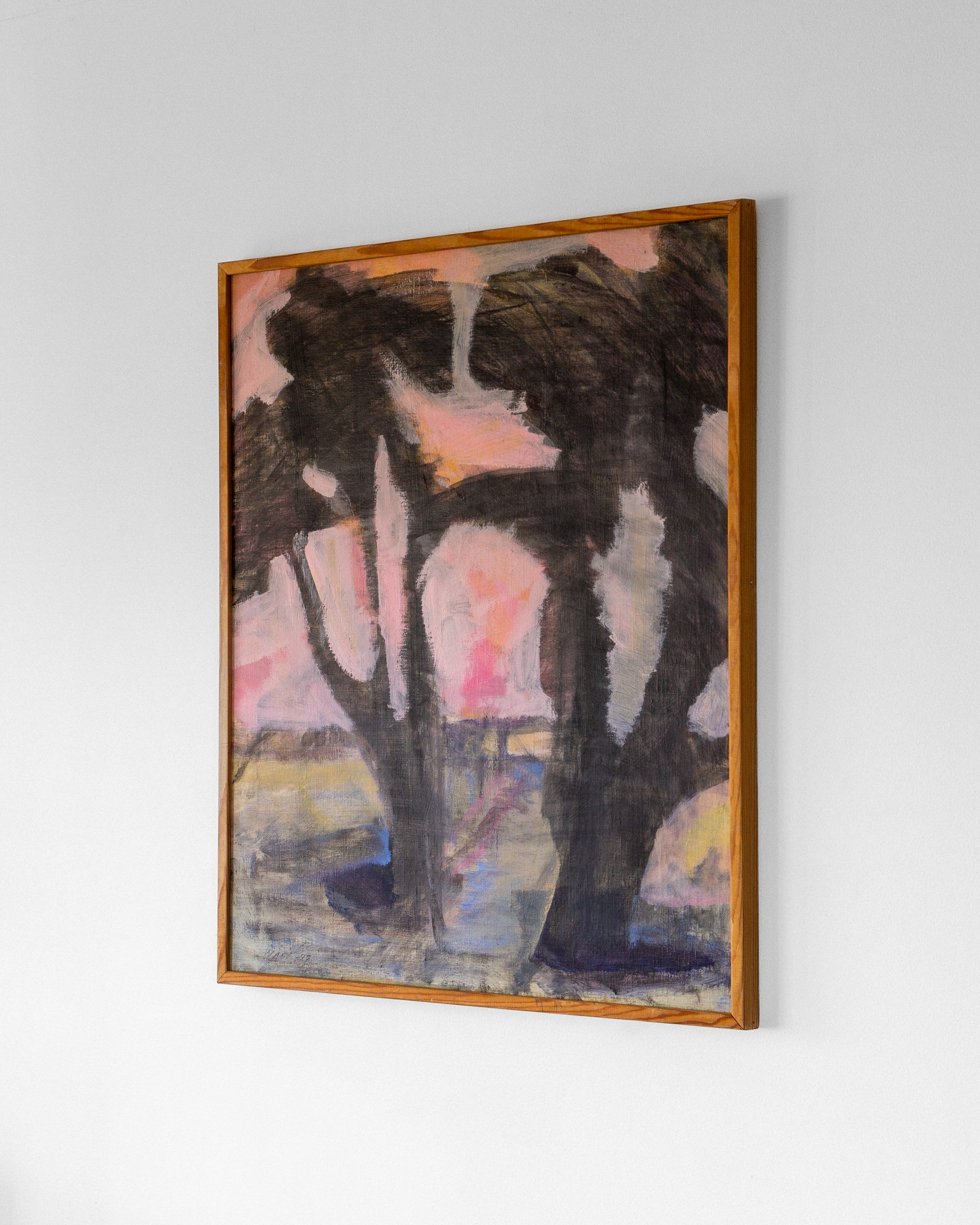 The artwork presents a landscape composed of organic forms, with tall, dark shapes reminiscent of trees. These shapes are set against a backdrop of soft, muted tones in pink, peach, and purple, evoking the delicate light of a sunrise. The colors and forms seamlessly blend, giving the painting a dreamy and ethereal quality.