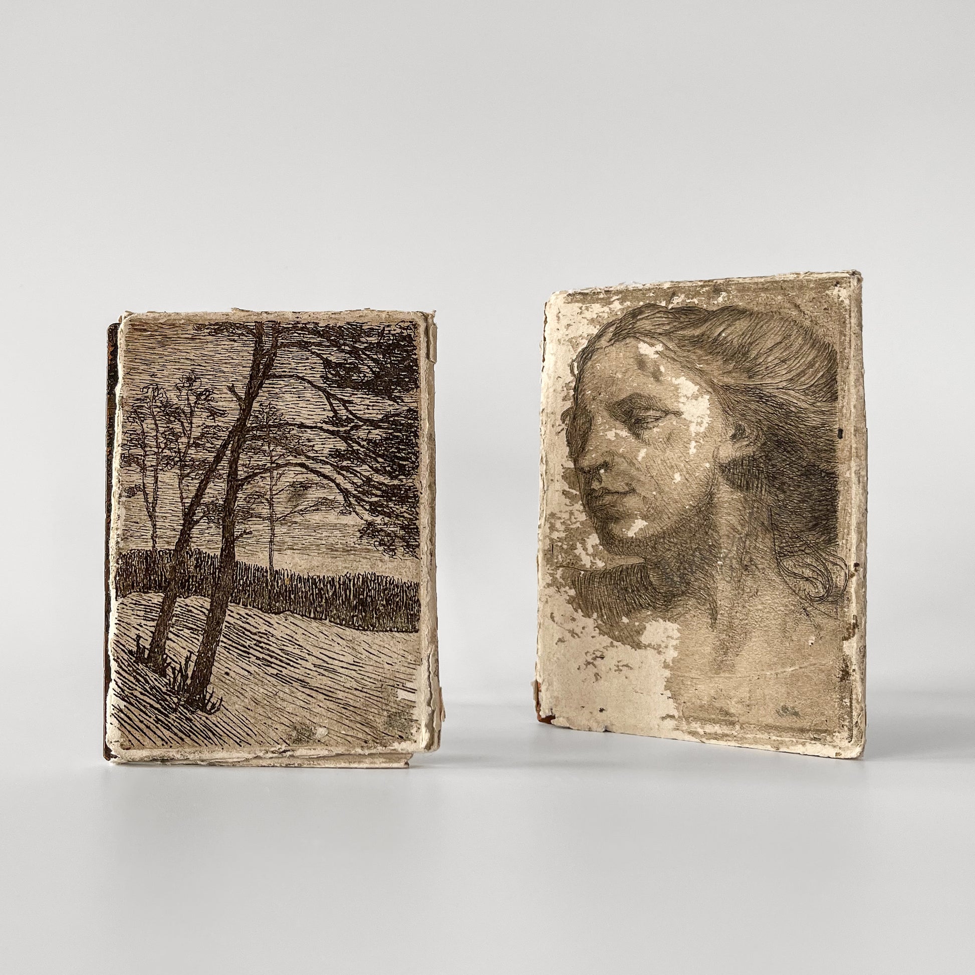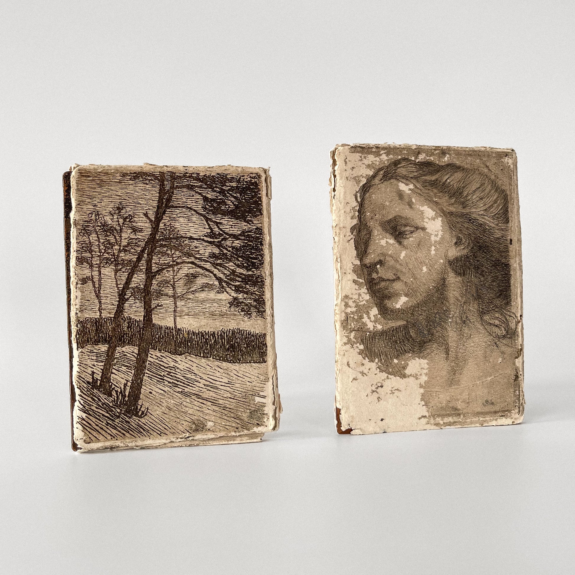 Two graphic prints accompanied by their original etched copper plates by the Swedish artist Carl Deelsbo (1892-1990). Very decorative, despite the heavy but rather charming wear on the prints (as seen in the photos).