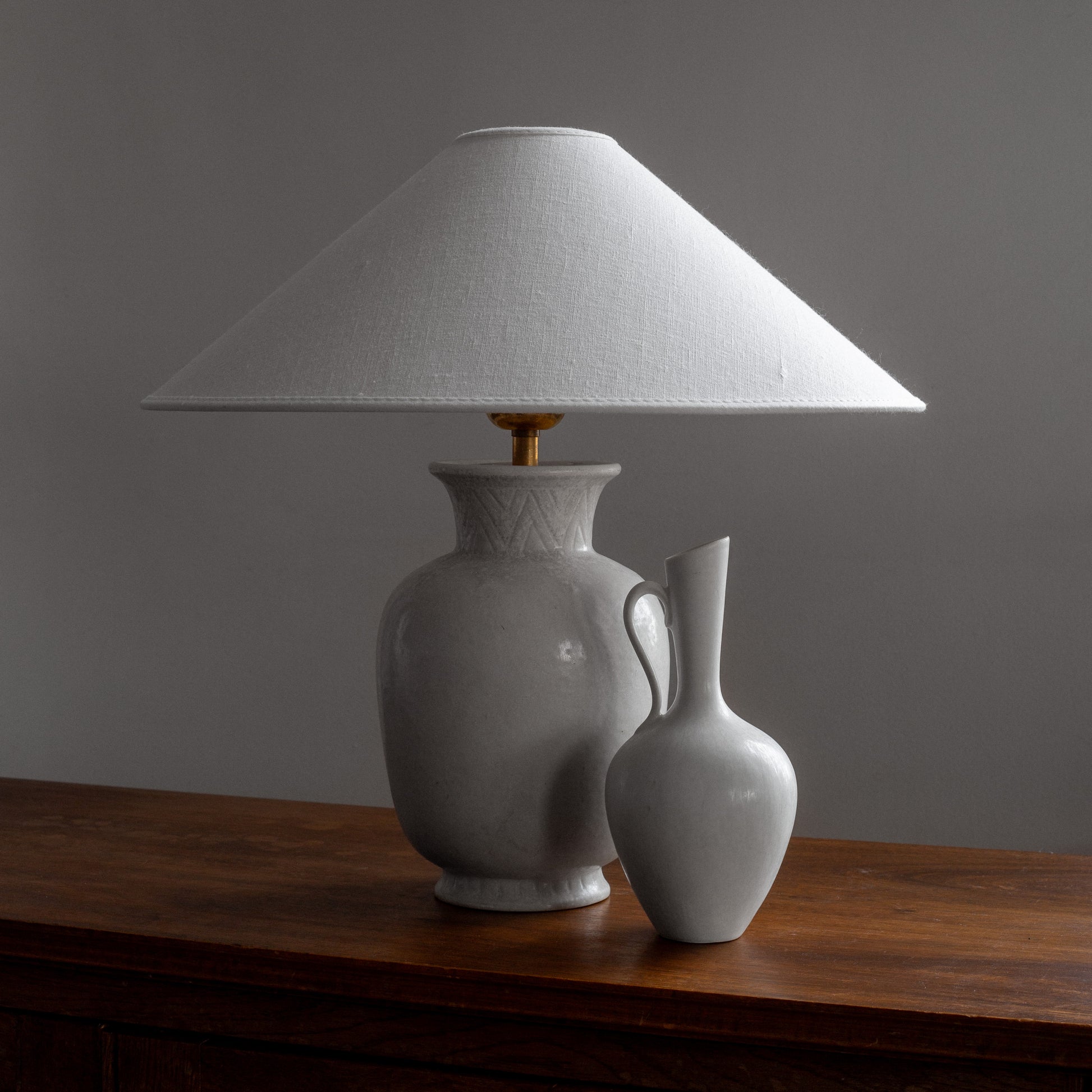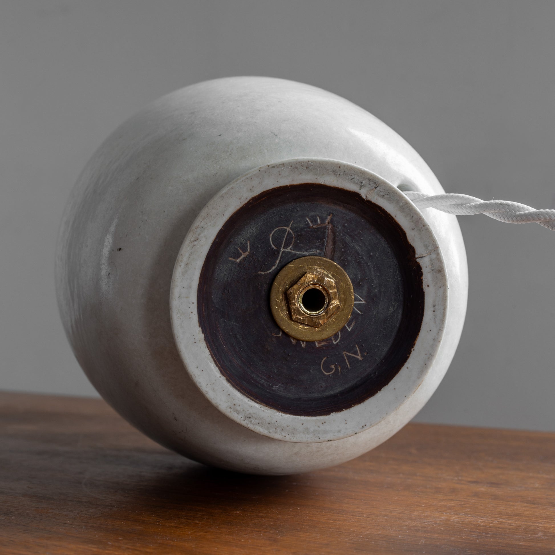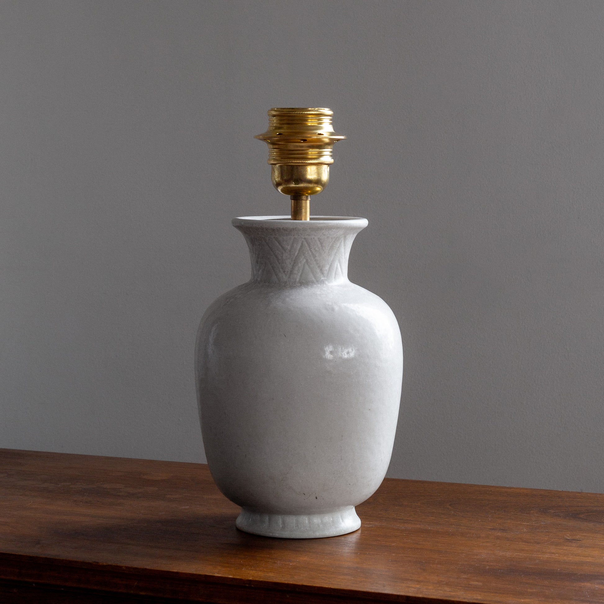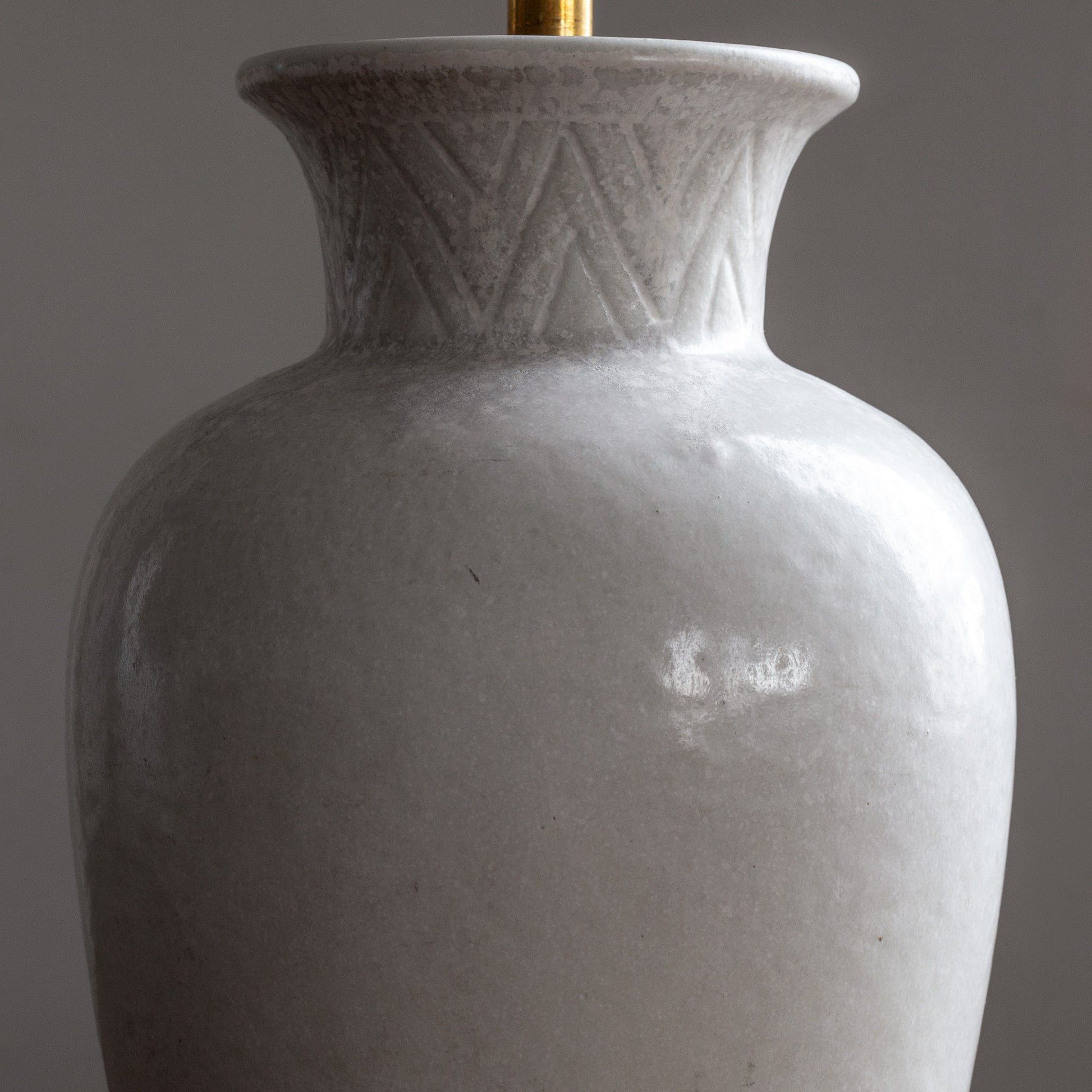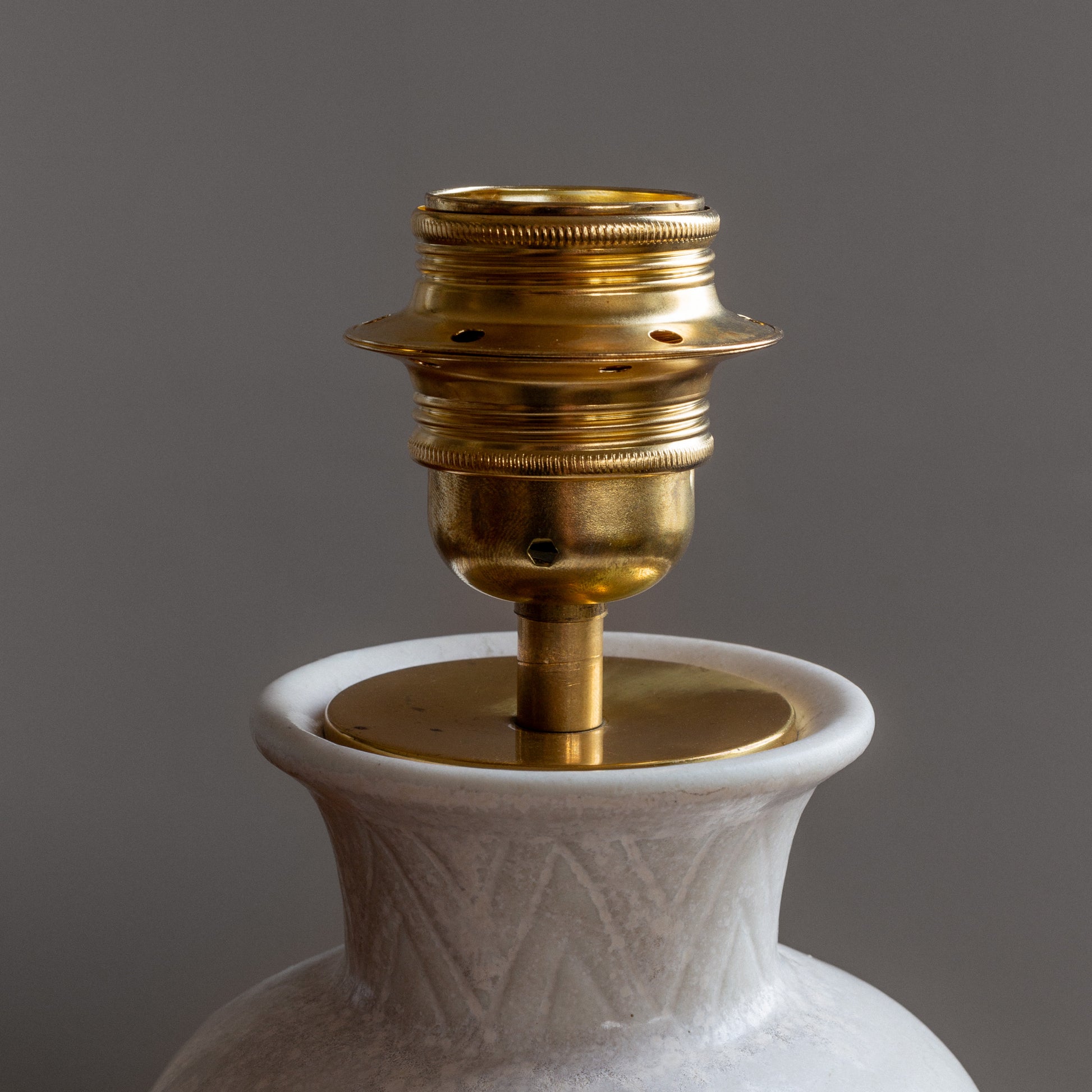 A charming 1940s stoneware table lamp by Gunnar Nylund for Rörstrand. The lamp features a rounded, plump form with an intricate embossed pattern around the neck, finished in a speckled white eggshell glaze.
