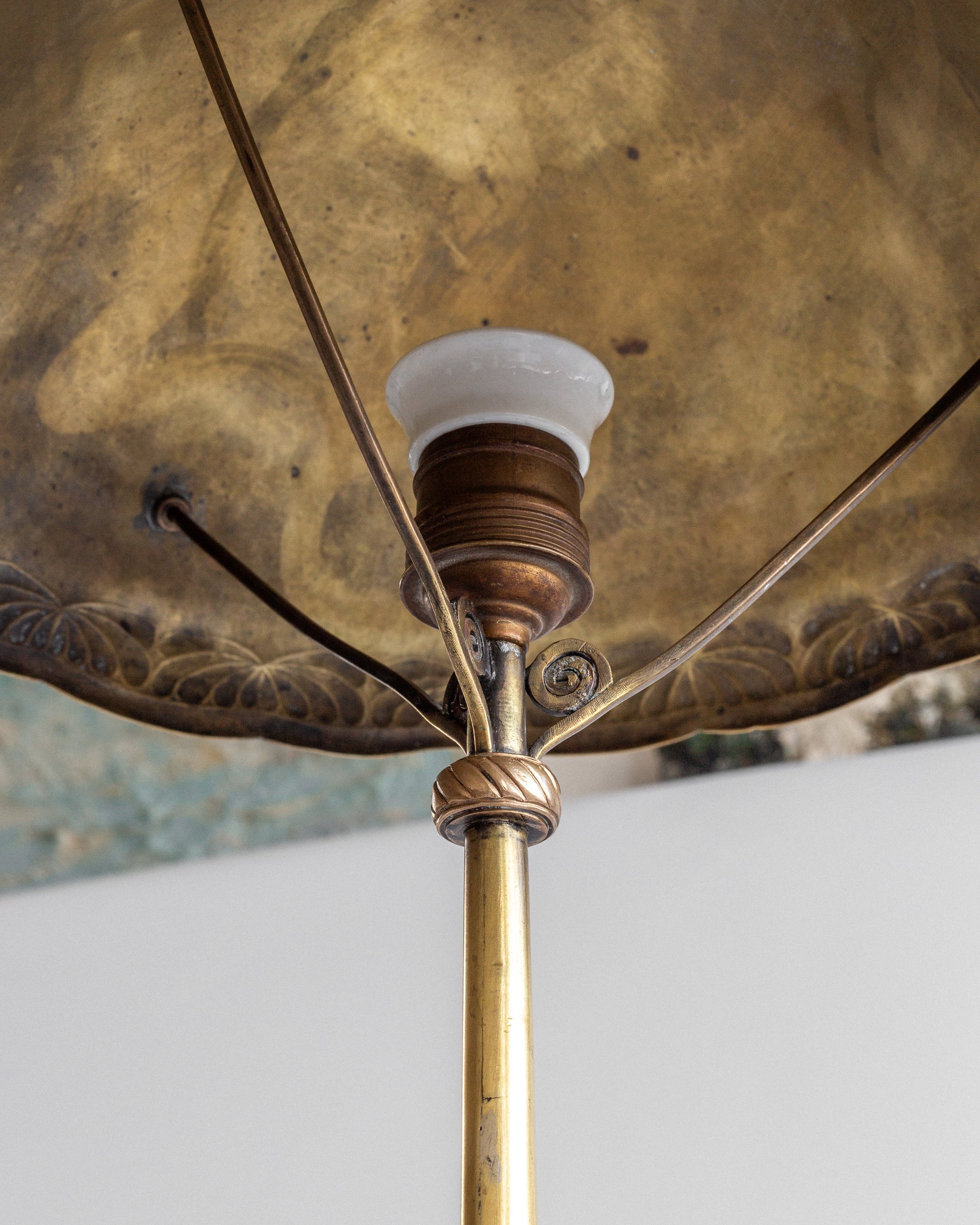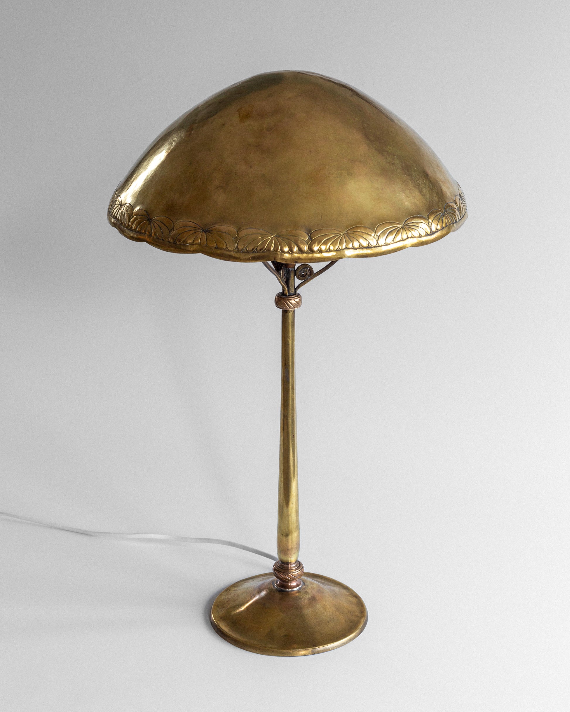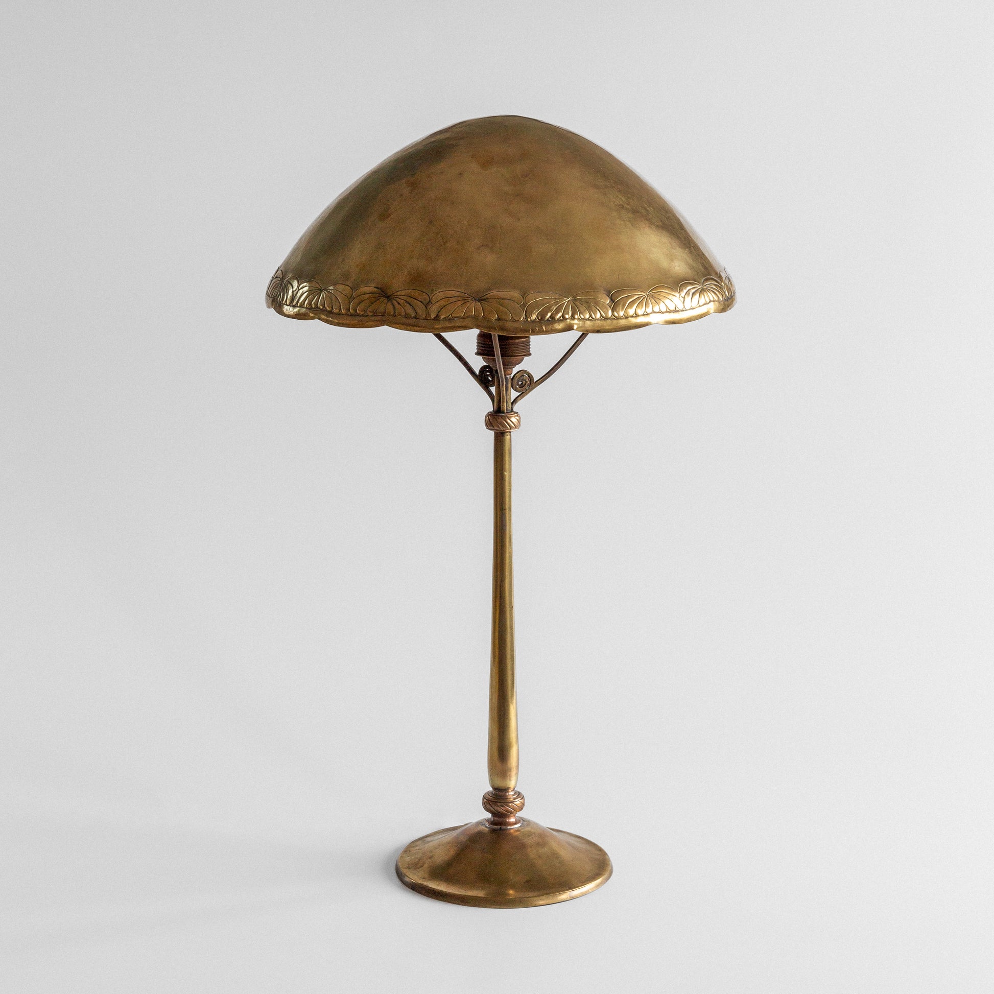 Early 20th-century Jugend table lamp with a distinctive mushroom shade adorned by floral engravings along its border. The brass construction exhibits a warm, aged patina that enhances its period charm. Most likely of German or Austrian origin, circa 1910.