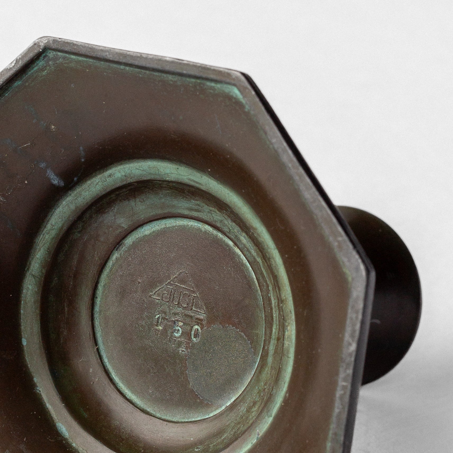 A fine set of candlestick holders designed by Just Andersen, Denmark. Made out of Disko metal (an alloy of different metals invented by Just Andersen) which is reminiscent to bronze.