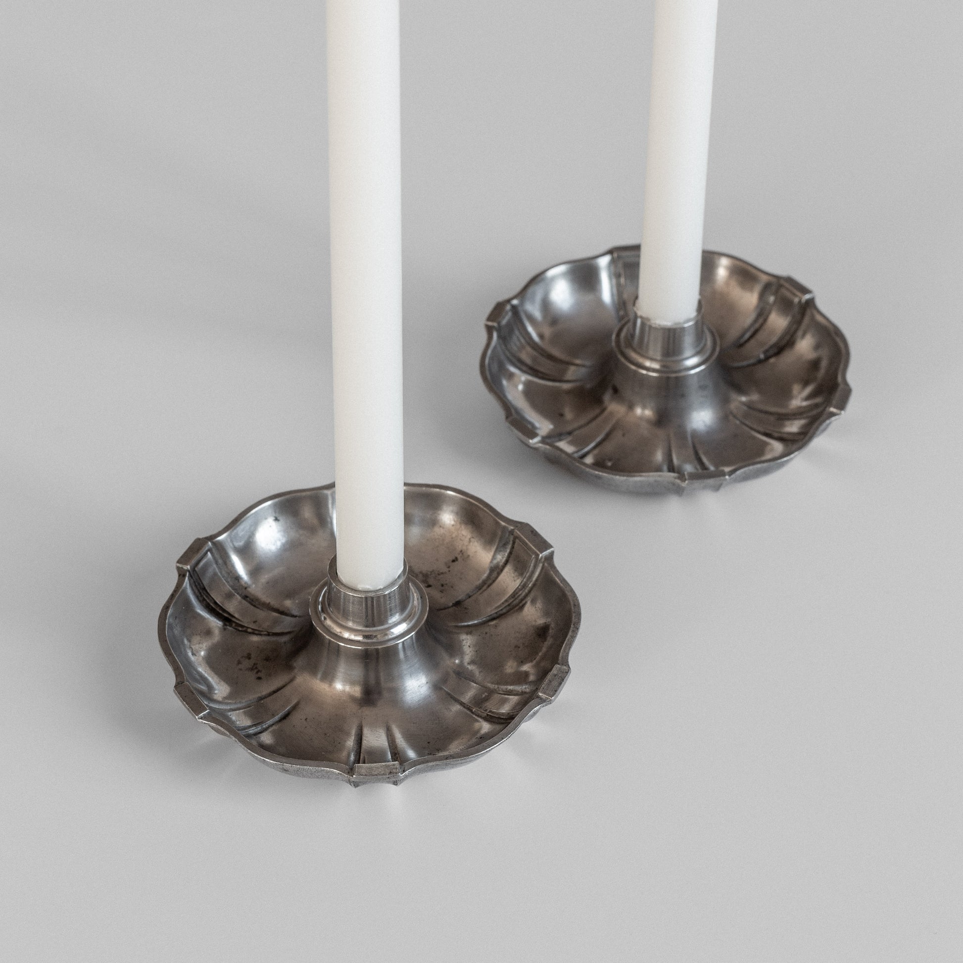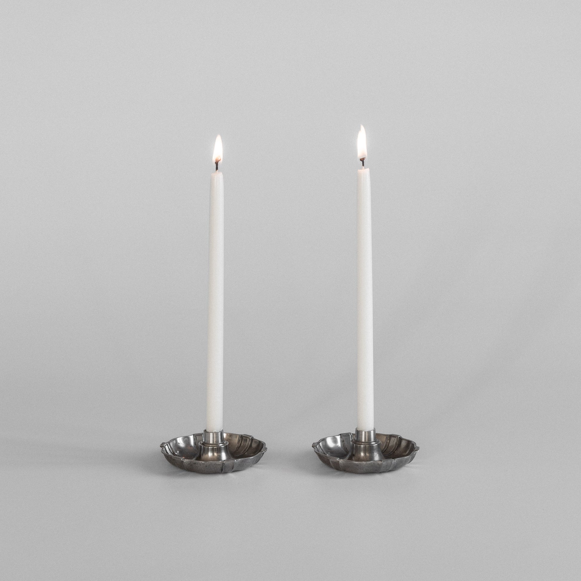 This pair of small pewter candlesticks, crafted by C.G. Hallberg in the 1930s, beautifully embodies the elegance of Modernist metalwork in Sweden from that era. Designed to hold slender candles with a diameter of 1.5 cm (0.59 in), they are perfect for adding a festive touch to gatherings, including Christmas celebrations.