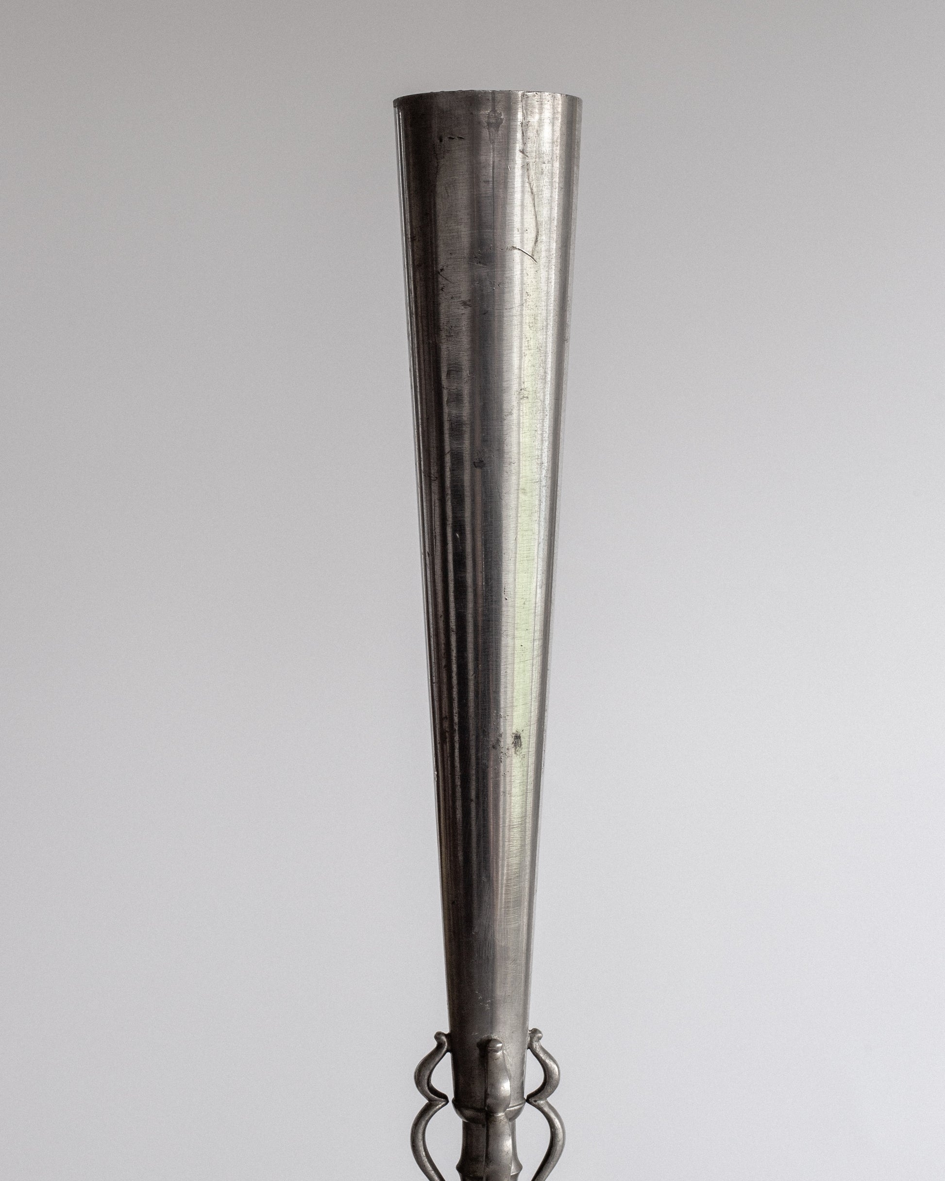 The pewter metal displays the characteristic soft, lustrous patina that develops naturally over time. It is equally suited for displaying a single stem or standing alone as a sculptural statement piece.