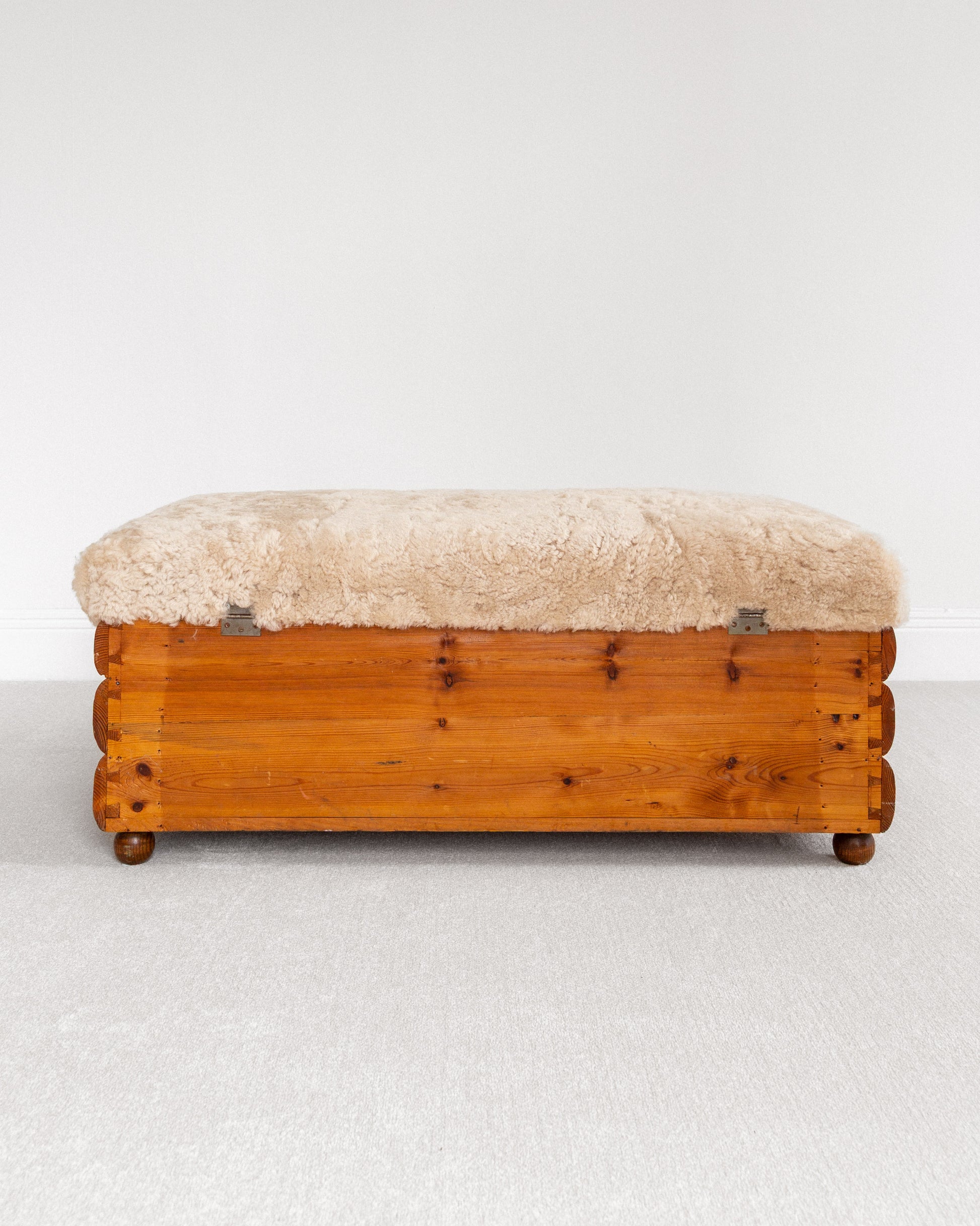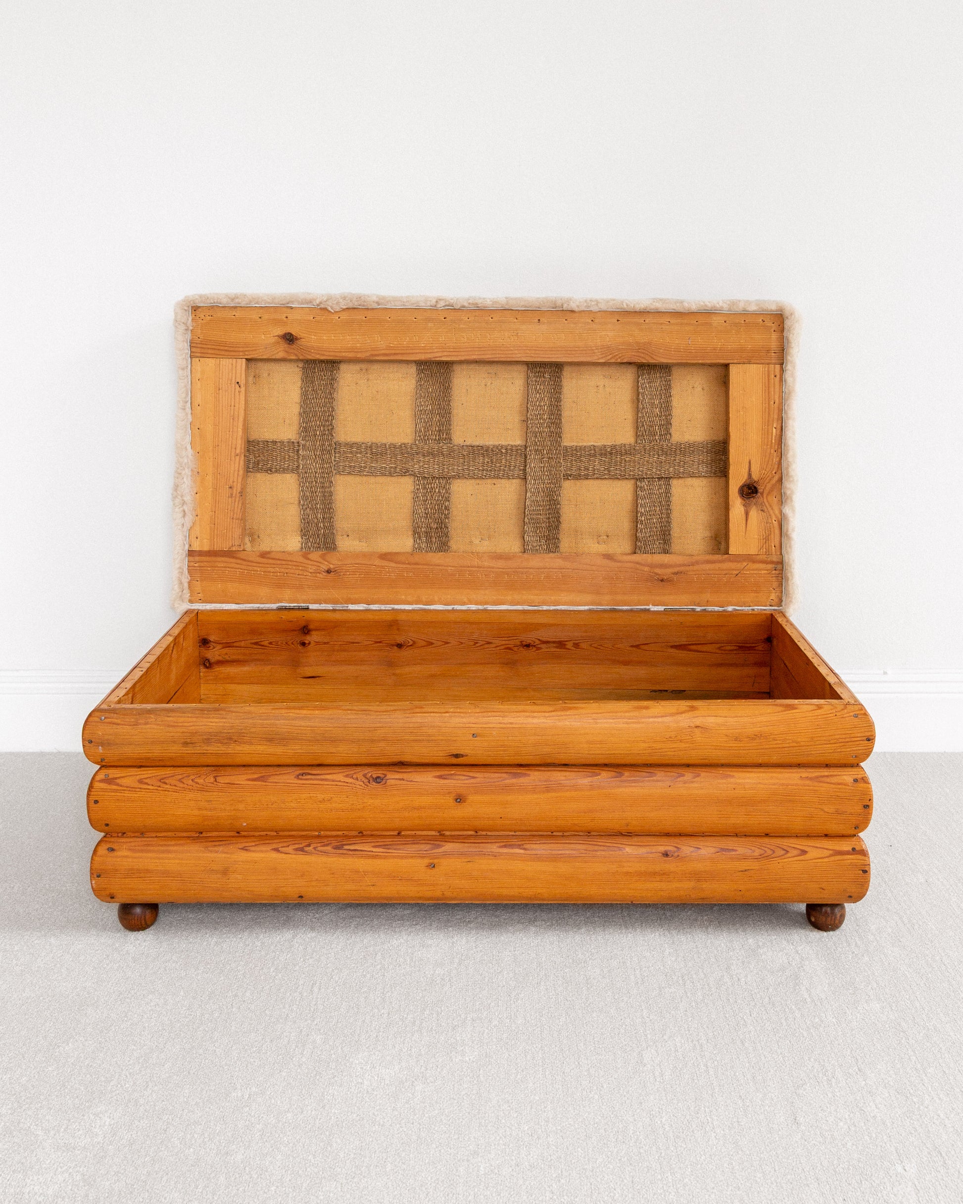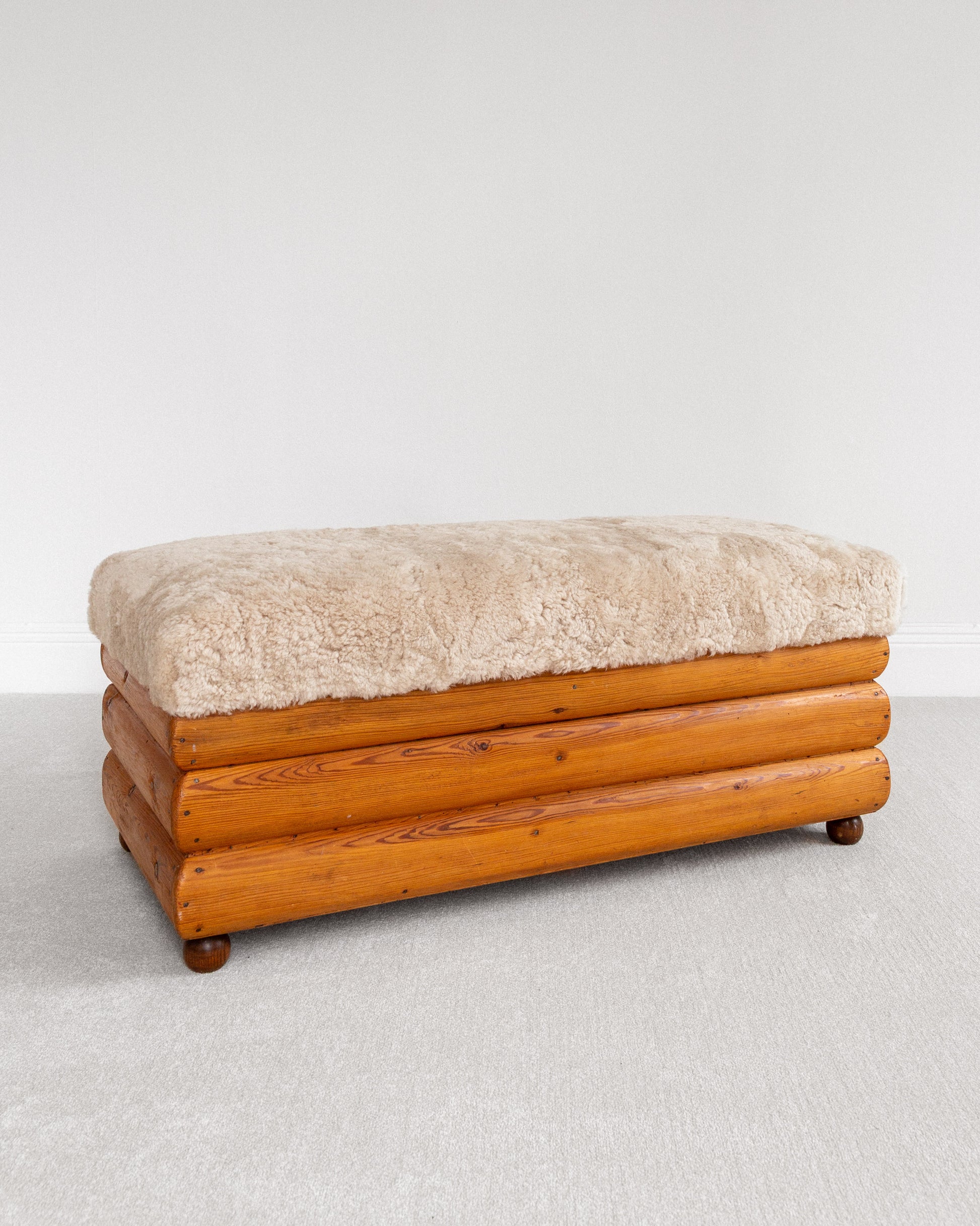 Solid pine bench from the 1930-940s featuring rounded log-style construction, turned wooden feet and integrated storage beneath the hinged seat. This piece has been thoughtfully reupholstered in light beige sheepskin. Perfect as an entryway piece, at the foot of a bed, or in a cozy reading nook. In very good vintage condition with natural patina and minor surface wear in accordance with age.