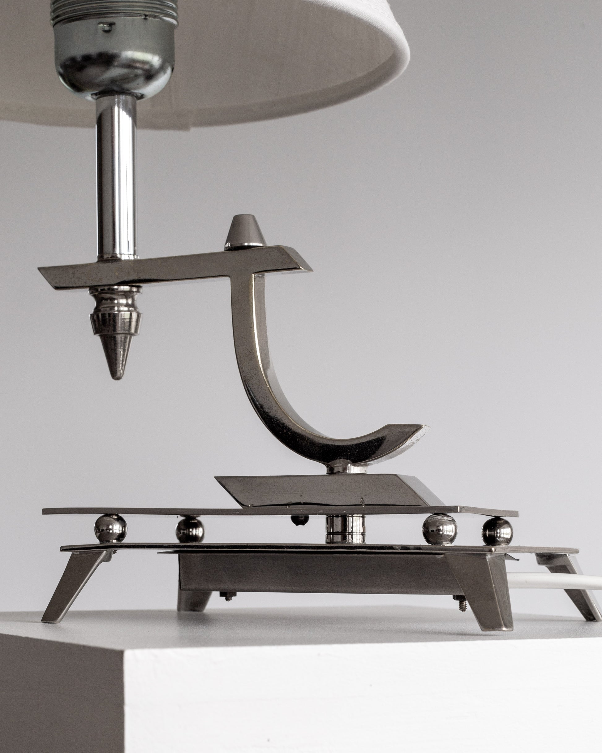 Art Deco table lamp from the 1930s, likely of Austrian or German origin. Crafted from nickel-plated metal and built with remarkable attention to detail, the lamp features a sculptural form that's captivating from all angles. The interplay of sharp and curved elements creates a dramatic silhouette that perfectly illustrates Art Deco's forward-thinking aesthetic. This lamp represents a rare example of interwar European lighting design.
