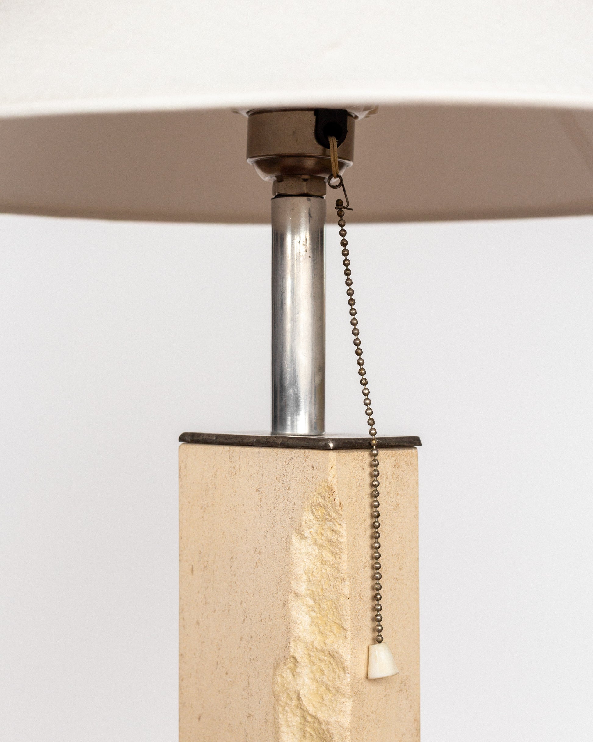 Remarkable Modernist table lamp, France. Masterfully blending the sophistication of Art Deco with Modernist innovation. The travertine column rises from a chrome base, featuring distinctive 1930s ball feet. Two corners of the travertine remain intentionally untouched in their natural, raw state, creating a fascinating contrast in surfaces.