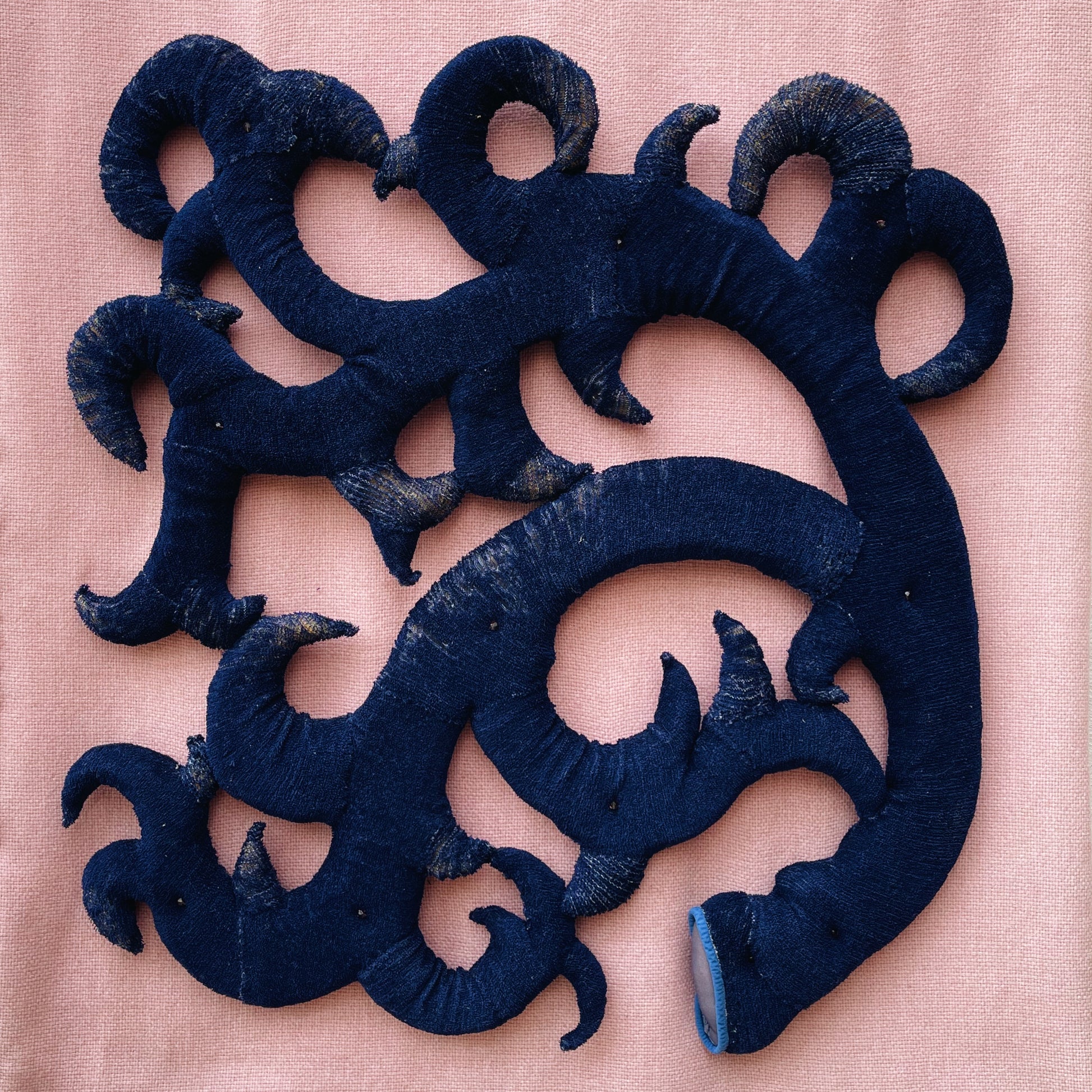 Discover a completely unique treasure from the past with this large 3D textile artwork from Sweden, 1970s. This charming wall decor is hand-made and carefully crafted, it features an abstract, padded motif in deep blue attached to a pink wool background.