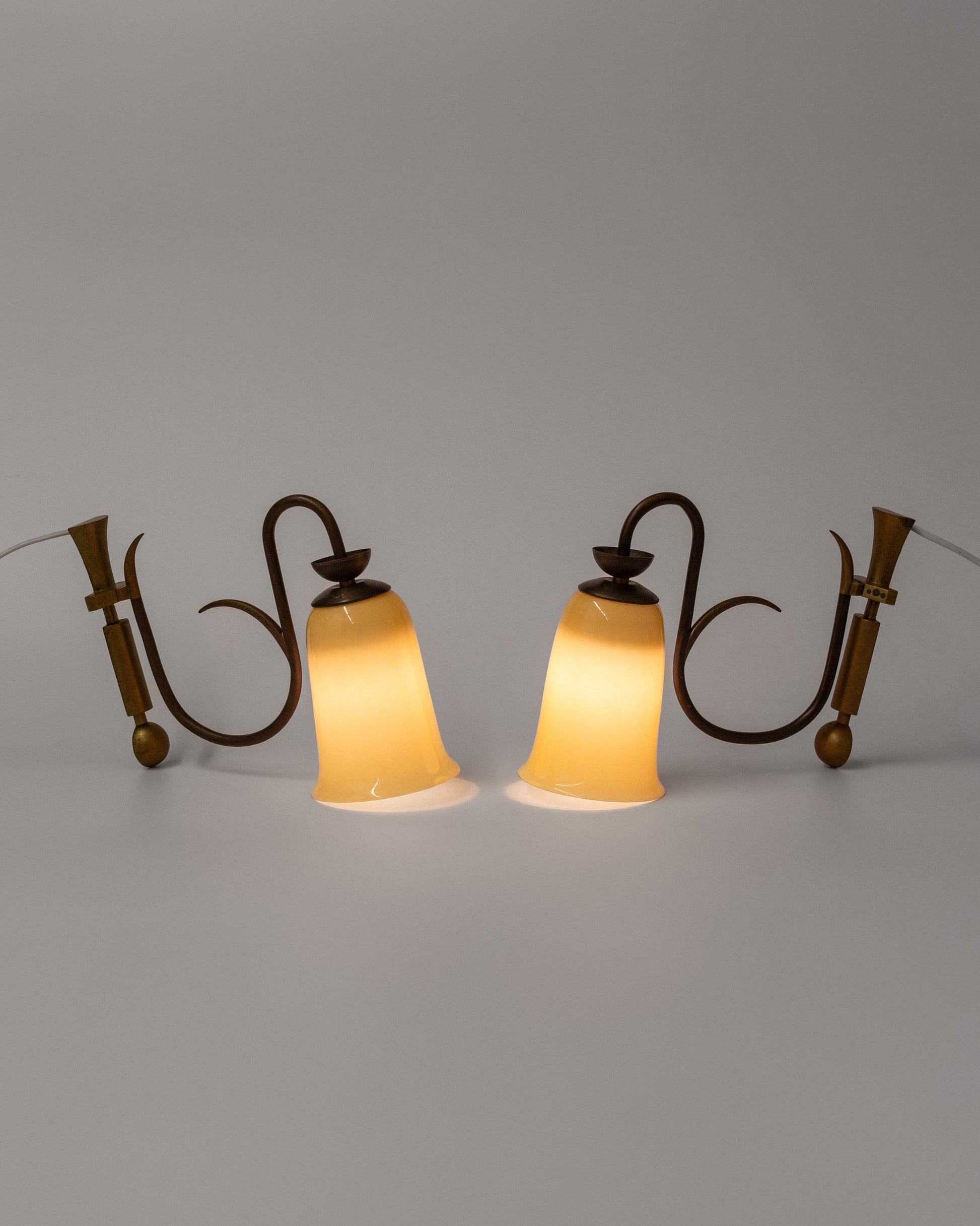 Elegant pair of Art Deco wall sconces featuring graceful scrolling metal arms with champagne-colored glass shades. The design showcases the period's neoclassical influence through characteristic curves, geometric backplates, and decorative finials.