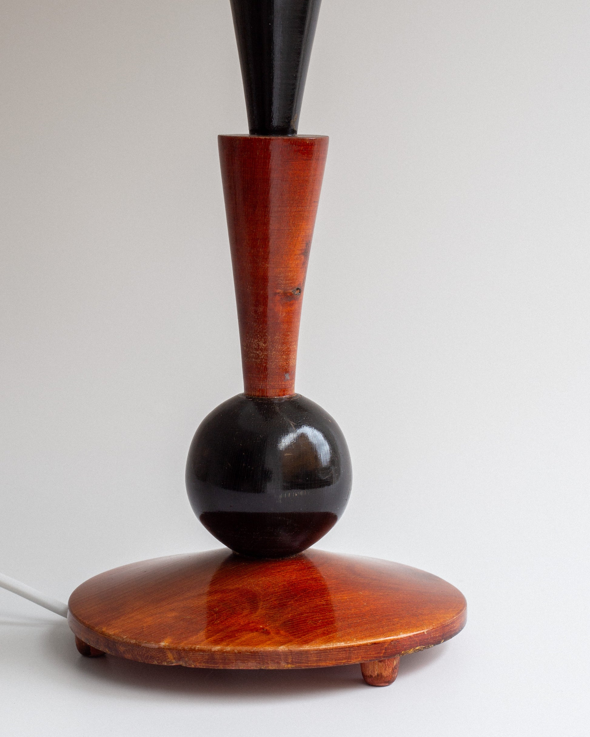 Art Deco table lamp in wood, crafted in 1930s Sweden. The sculptural form blends elegance and playfulness, featuring warm reddish wood with black lacquered accents, a distinctive spherical center, and conical stem. Comes with a crisp, tall white cotton shade that complements its geometric lines.